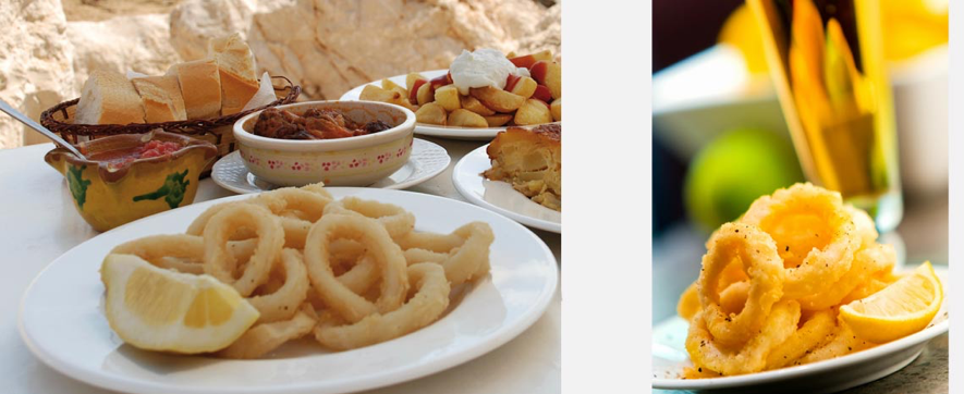 Battered squid fried in olive oil and served hot. They are popular all over the country, especially cut into rings.