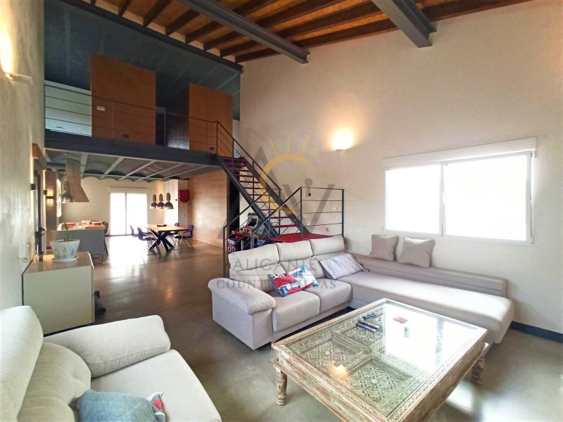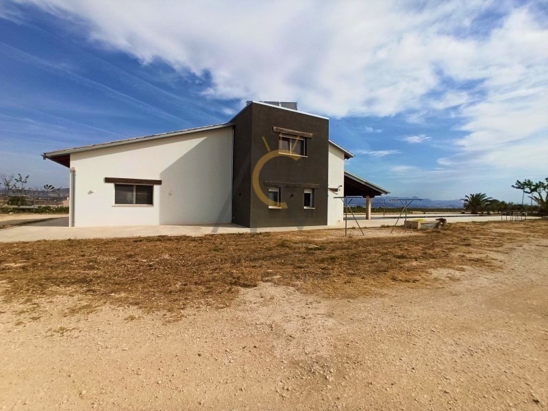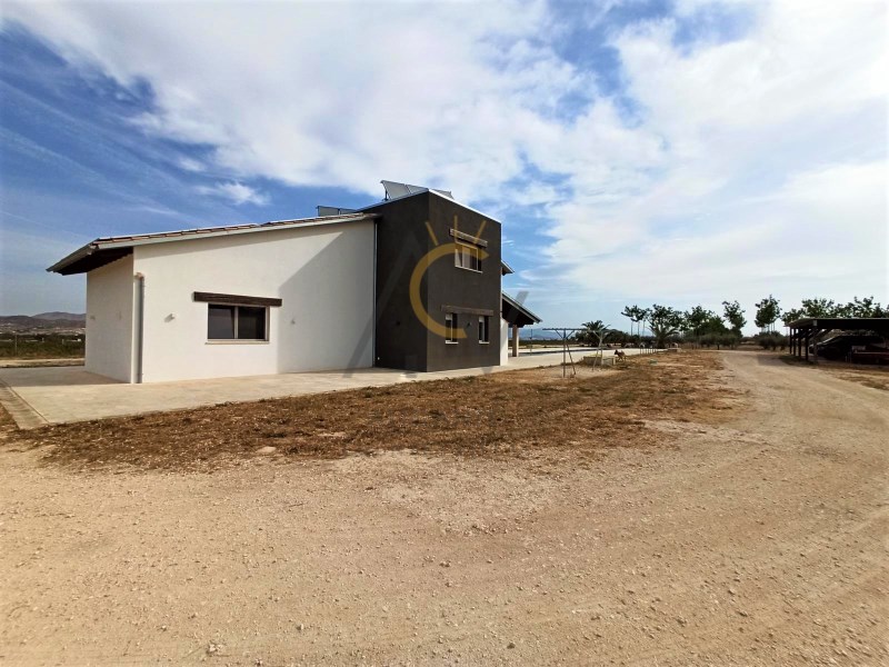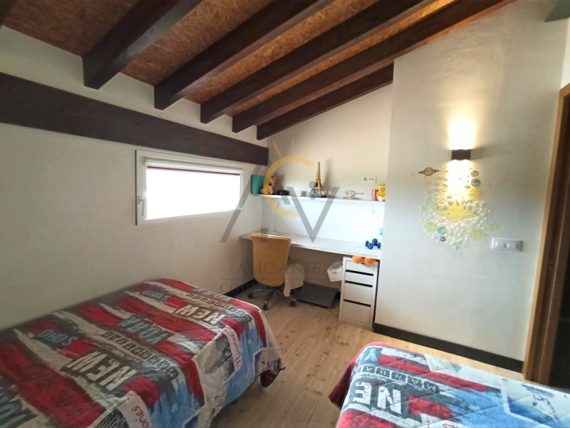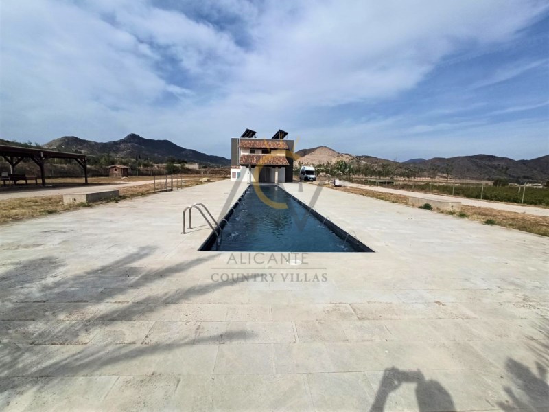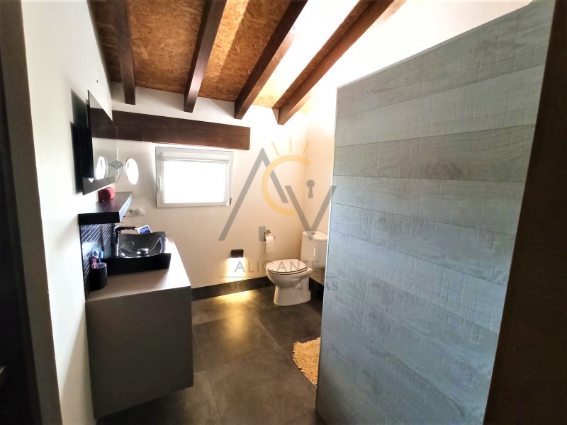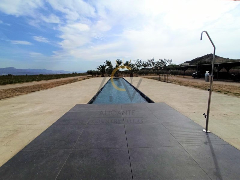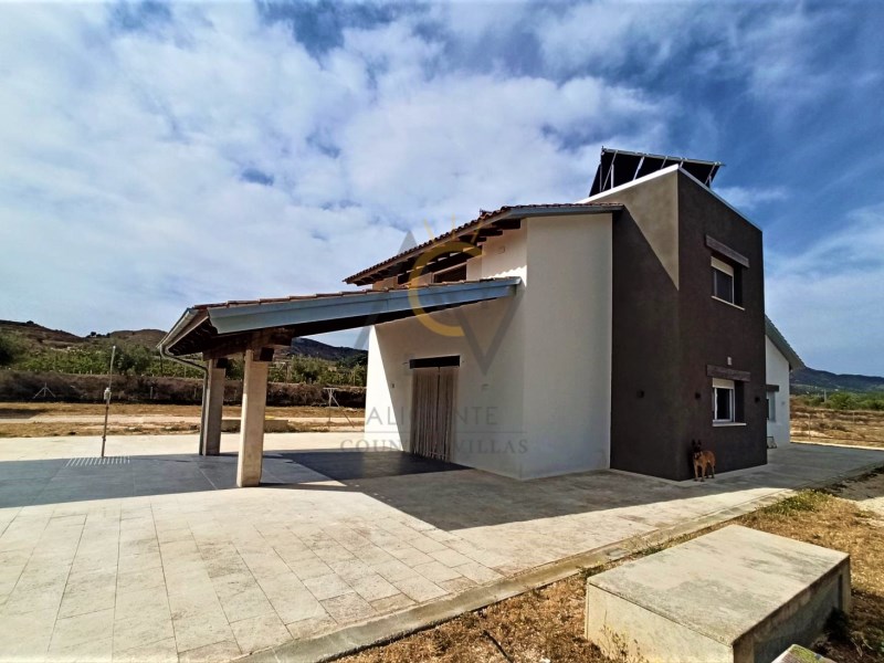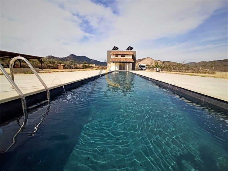 Alicante Country Villas is pleased to present this immaculate Villa a few minutes from Aspe just 35 min. From Alicante airport and the beautiful beaches of the Costa Blanca. The property is built on a plot of 10.400m² approx, completely fenced, with a beautiful pool of 25x3.5m with an area of Natural Stone Lumaquela around it, self-cleaning and lighting machine, automatic entrance door, covered parking for six vehicles and garden areas with olive trees and large plantation of Kiri trees. Within the land we find a modern property of 180m² approx of constructed area and divided into two floors. Already inside, a spacious and diaphanous ground floor distributed in two areas. A living room with high sloping ceilings with wooden beams, large designer kitchen with island, fully equipped, with steel bench, lined with glass and oak wood and great dining area accompanied by a large table for eight people. A full bathroom with shower and laundry area with large storage capacity. On the upper floor, two generous double bedrooms with dressing room, a single attic bedroom and a bathroom with shower. The house has been built with the sate system (Exterior Thermal Insulation System) that guarantees efficiency and energy savings and maintaining the same temperature inside. 8,000W photovoltaic panels that supply the house, six large thermal plates, which supply hot water to the house, both for sanitary water and for underfloor heating and apart there is a heat exchanger that heats the pool. Support boiler viessman and tank with capacity of 45,000 liters The pool is installed with salt chlorinator and self-cleaning system and nine light bulbs. It also has underfloor heating, tilt-and-turn aluminum windows with thermal bridge and triple glazing, motorized blinds, security door, top quality appliances, combined glass and wood kitchen furniture, motorized kitchen drawers, high-end Grohe taps, Porcelanosa bathroom tiles, continuous pavement on the ground floor, wooden pavement on the upper floor, LED lighting throughout the house. #ref:DNV0373