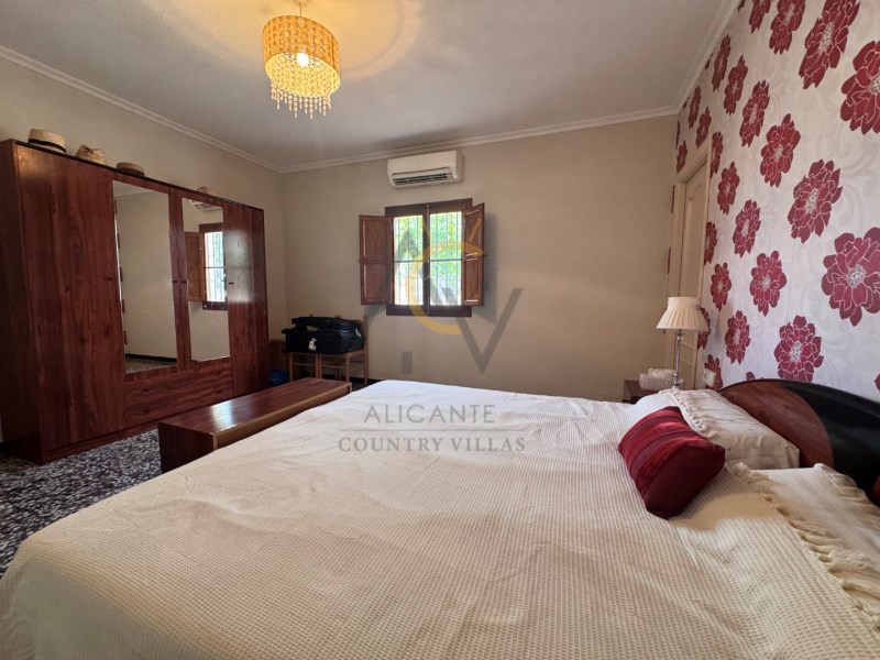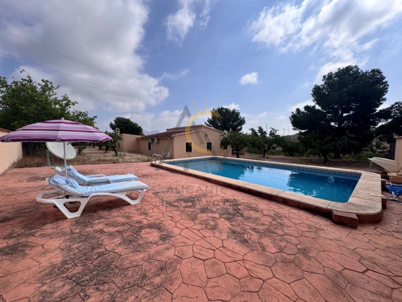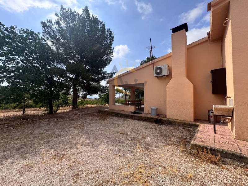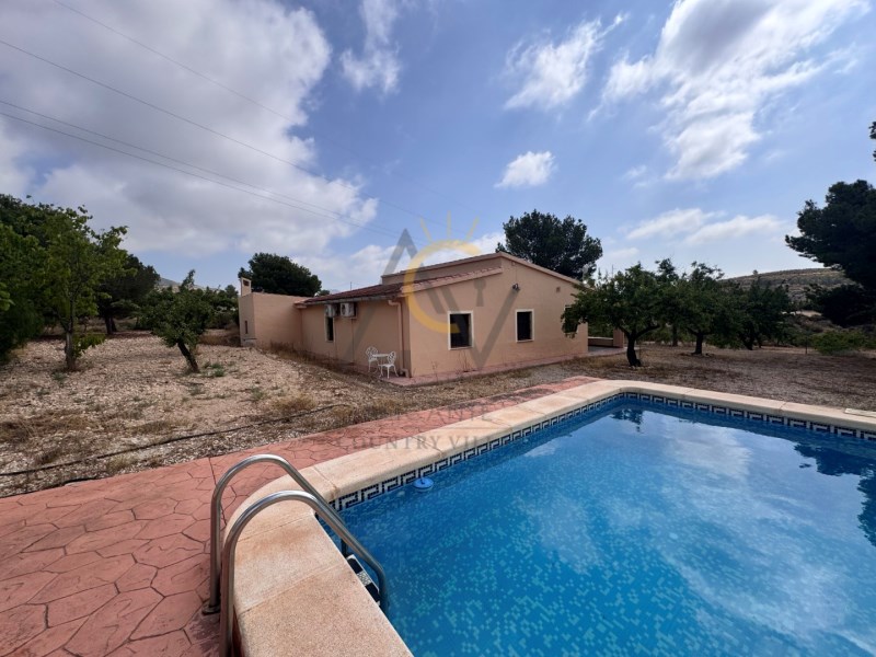 Alicante Country Villas is pleased to present this charming villa located on the outskirts of the town of Monovar and just 45 minutes from the airport and beaches. The plot of 7000m2 approx. Is partially fenced, with almond trees all around and a fantastic pine tree at the front of the house providing abundant shade. On one side of the house is the 8x4 swimming pool with chlorine filter and solarium area. We access the house of 100m2 approx. Through a large porch, once inside, the house is distributed in a living/dining room with fireplace and air conditioning with open kitchen, a master bedroom with air conditioning with bathroom with shower, a second double bedroom with air conditioning, a single bedroom and a second bathroom with bathtub. Attached to the main house, we find a garage of 30m2 approx. And a barbecue area. The property benefits from electricity and irrigation water. If you want to live in a very quiet area surrounded by mountains, do not hesitate to visit it! #ref:DNV0587