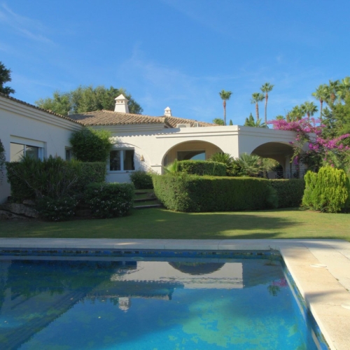Luxurious house with 5 bedrooms and 5 bathrooms, located in the upper part of Sotogrande and with unbeatable views over the famous Valderrama golf club and the sea.The individually designed property is finished with high quality materials and the layout is as follows, entrance porch with stairs to the front door, hallway to the great room with fireplace and access to the spacious terrace with views.Separate dining room that leads to the fully furnished kitchen.On the ground floor there is also a guest bedroom with an en-suite bathroom.On the first floor, the master bedroom with dressing room, bathroom en suite and large terrace.There are three other bedrooms, all with their en-suite bathrooms.In the 200 m2 basement there is a large living room with a bar, a dining room and two areas with sofa and tables all with access to the garden The floors are made of terracotta tiles, hot / cold air, windows and wooden doors with double glazing , landscaped gardens, swimming pool and garage.