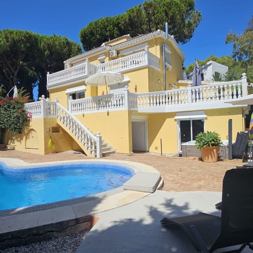 Luxurious South-Facing Villa with Sea and Golf Views in Sitio de Calahonda. This luxurious 250 m² villa, set on a 563 m² plot in the prime location of Sitio de Calahonda, offers spacious living and incredible potential for either a large family home or rental income with the possibility of dividing the residence into 2 units. With 4 double bedrooms, 4 bathrooms, and a fully equipped kitchen, the villa is move-in ready and boasts elegant features such as white lacquered wood carpentry, marble flooring, and double-glazed windows. The south-facing orientation fills the interior with natural light, while the outdoor space includes lush tropical gardens, a spacious terrace, and a solarium with breathtaking views of the sea and nearby golf courses. Additional features like central air conditioning, built-in wardrobes, and private parking ensure year-round comfort and convenience. Overview: - 4 bedrooms - 4 bathrooms - Spacious living room - Sunny rooftop - Private garden - Communal pool - Land plot of 562 m² - Parking space - Storage Located within a secure development with a communal pool, the property also offers the option to add a private pool. Perfectly positioned, it provides easy access to key amenities and leisure spots. Nearby Amenities: Beach: 4 km, 10 minutes away Shopping: El Zoco Shopping Center, 8 km, 15 minutes away Supermarkets: Mercadona, 3 km, 5 minutes away Schools: Colegio Internacional Torrequebrada, 6 km, 10 minutes away Golf: Torrequebrada Golf Course, 5 km, 10 minutes away Málaga Airport: 18 km, 20 minutes away Contact us today to schedule a viewing of this remarkable villa, perfectly suited for family living or as a lucrative investment opportunity.