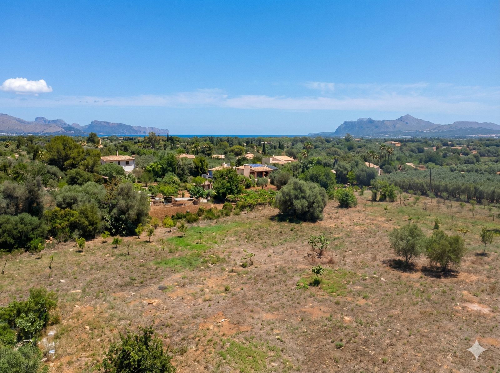 Ready to start building the finca of your dreams: 14.622 m2 of fenced land between Alcudia and Pollença in a quiet location, with fruit trees and sea views from the first floor, surrounded by the panorama of La Victoria, the mountains of Son Fe and the Serra de Tramuntana. The finca has easy access, legal well and mains electricity. The approved licence foresees the construction of a single-family house with 293 m2 on ground and ground floor, with 3 bedrooms, 3 bathrooms, big kitchen with dining room and living room, plus spacious terraces, swimming pool of 47 m2 and garage of 32 m2 for 2 cars.Surrounded by numerous beautiful fincas, this plot is easily accessible and only 6 minutes by car from Alcudia with its shopping and service facilities and 6 minutes from Pollensa. Thanks to its excellent location, the beaches and bays of Alcudia and Pollença, Playa de Muro, the Serra de Tramuntana, the Albufera Natural Park and even Palma are all within a short distance.This building plot in Alcudia is exactly what you think of when you close your eyes and build your dream home in your mind. A country house in traditional Mallorcan style or a modern finca? Hammocks with thatched parasols or Balinese beds by the pool? An elegant black and white kitchen or a rustic kitchen made of polished concrete and wood? The beauty of this property is that all options are open, because you are the one who chooses the materials and the quality, and you give it the touch that distinguishes a house from your home. May we show you this beautiful plot?