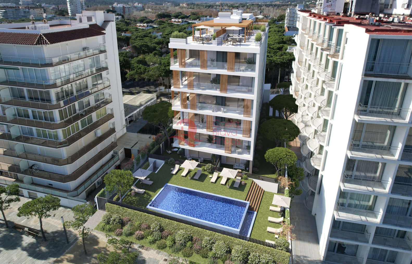 Exclusive building on the frontline of the sea in Platja d'Aro. Complex of 18 unique homes with spectacular panoramic views of the sea and mountains. Large windows flood each space with natural light, and their layouts have been designed to offer maximum comfort and functionality. The building features elegant common areas and a large infinity pool that seems to blend with the horizon. The architecture combines light concrete, noble wood, and extensive glazed surfaces, achieving a warm, bright aesthetic that is perfectly integrated into the environment. The vegetation surrounding the building provides privacy, freshness, and a relaxing atmosphere. Thanks to its studied orientation and natural ventilation, the homes remain pleasant even in the height of summer, allowing enjoyment of both sunny terraces and balconies and shaded areas for relaxation. All residences are delivered fully finished: parquet floors, modern and functional kitchens, noble materials such as stone and natural wood. Ready to move in and enjoy from day one. The main common area is undoubtedly the beach, located right in front of the building and separated only by a pleasant pedestrian walkway. Within the private grounds, sun loungers and umbrellas accompany the infinity pool, creating a perfect space to relax and embrace the slow pace of an authentic seaside village. In the heart of the Costa Brava, in Platja d’Aro, this location enjoys the Mediterranean climate year-round. Literally situated on the beach, it offers direct access to one of the most beautiful coasts in Spain. Just a few steps away, you will find a diverse array of dining options, walking paths, and outdoor activities: from morning runs to seaside strolls at sunset.