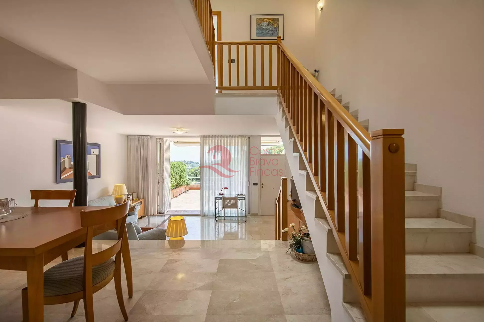 Terraced house with community pool and sea views in Sant Feliu. Located in a quiet community with a pool and spacious green areas, this charming townhouse offers everything you need to enjoy the best lifestyle on the Costa Brava. Situated in the lovely residential complex called El Mirador, the ground floor features a closed garage, ideal for storing any vehicle or as a storage room. Accessing the main floor through some exterior stairs, we find the living-dining room, which is very bright and cozy, offering access to a large terrace with stunning views of the bay of S'agaró. Also on the main floor, there is a very spacious kitchen with direct access to a pleasant terrace, perfect for outdoor dining. On the first floor, there are three bedrooms, one of which is a suite, ideal for ensuring comfort and privacy. In addition, the house is complete with three bathrooms and a terrace on the upper floor, where magnificent views of the area can be enjoyed. The house is located in a very quiet area, ideal for both a primary residence and a second home. A unique opportunity to live surrounded by nature, tranquility, and Mediterranean beauty. Sant Feliu de Guíxols is a beautiful Mediterranean town situated in the heart of the Costa Brava, with deep roots that belong to the essence of Baix Empordà. Its strategic location places it just 30 minutes from Girona airport, between Barcelona and the French border. Enjoy the flavors of the sea, its dynamism, and authentic Catalan culture. The coast of Sant Feliu is full of contrasting landscapes, with a rugged coastline divided into small coves and large sandy beaches. These beaches host a wide range of activities and offer visitors the opportunity to engage in all kinds of water sports. Thanks to its mild and pleasant tempered climate, it is an ideal destination to relax at any time of the year. This Mediterranean municipality has a vibrant commercial atmosphere, making it an important tourist center, offering visitors a wide array of services and numerous recreational and cultural activities. The city boasts a spectacular marina and a long seaside promenade surrounded by narrow streets that weave in and out of the old town. The combination of historical architecture and excellent beaches makes Sant Feliu a very interesting place for those looking to invest in the Costa Brava. For the best houses for sale in Sant Feliu de Guíxols, contact Costa Brava Fincas!
