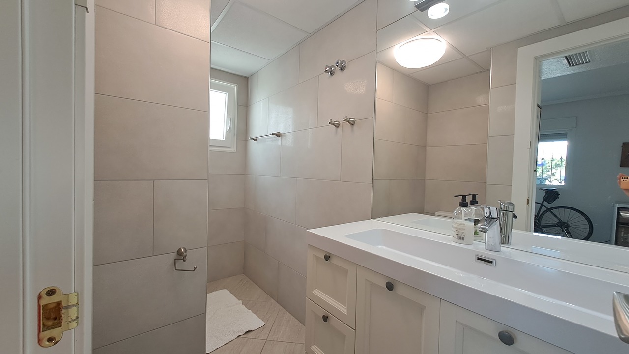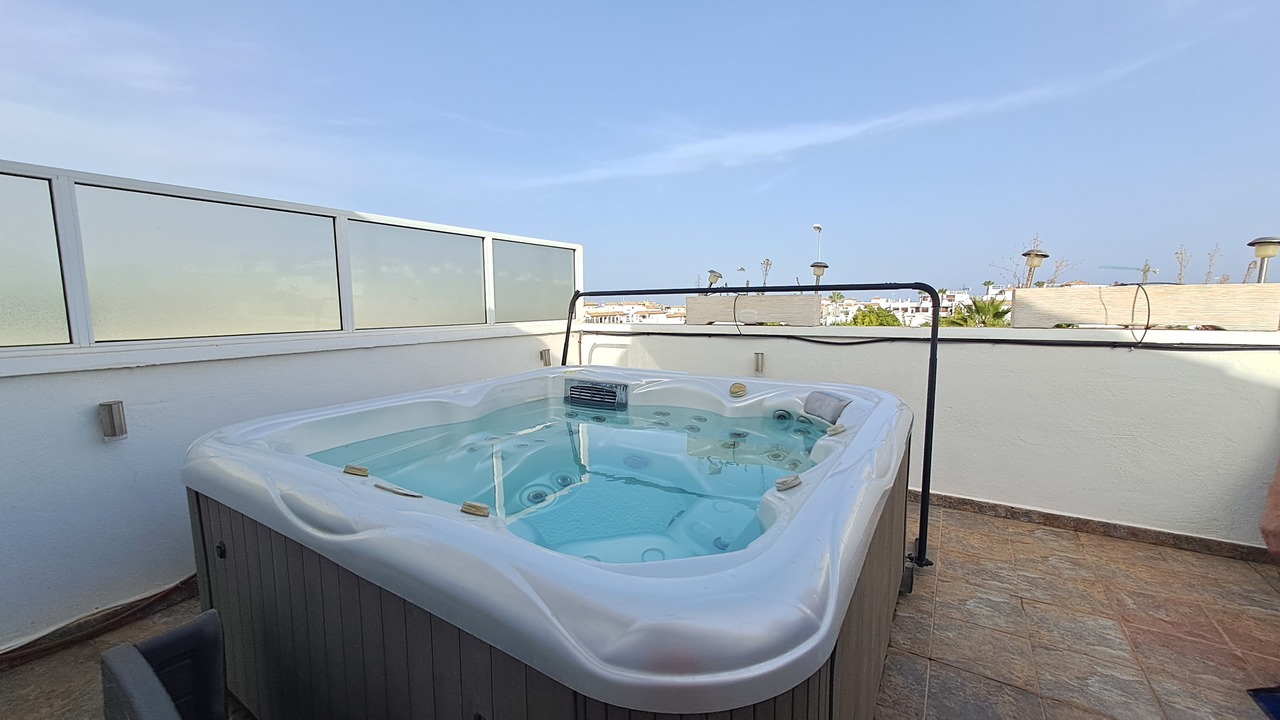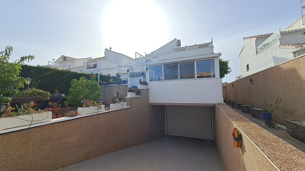 Fantastic and stylish villa located in Punta Prima. In the entrance we can find a front garden and the access to the garage. When we enter to the property there is a closed terrace perfect for chill. Inside we find downstairs a big living room, a bathroom, one bedroom and the kitchen. Upstairs there is a bathroom and there are two bedrooms which the main one has a very big wardrobe. There is a solarium with good views and also you can relax in the jacuzzi. In the basement we can find the garage and a lot of space for storage. In this villa is possible to make a private pool in the front garden or use the communal pool of the residential.