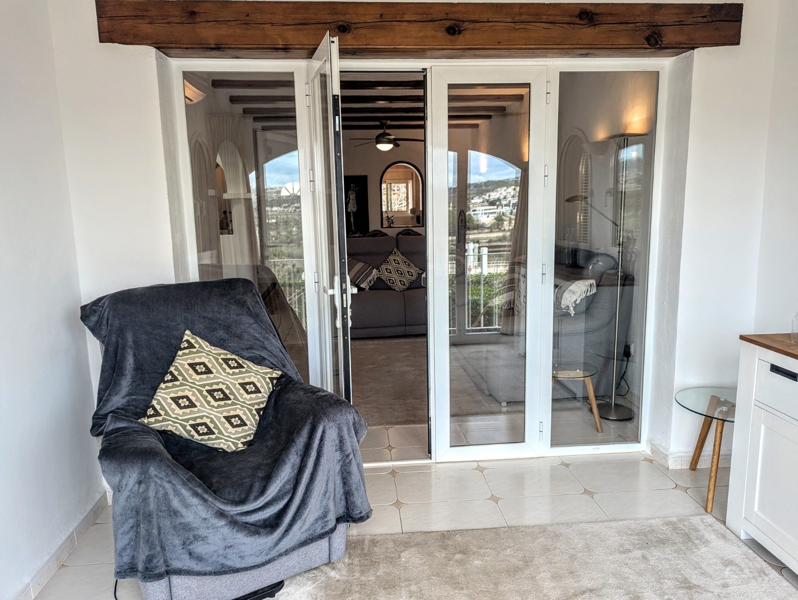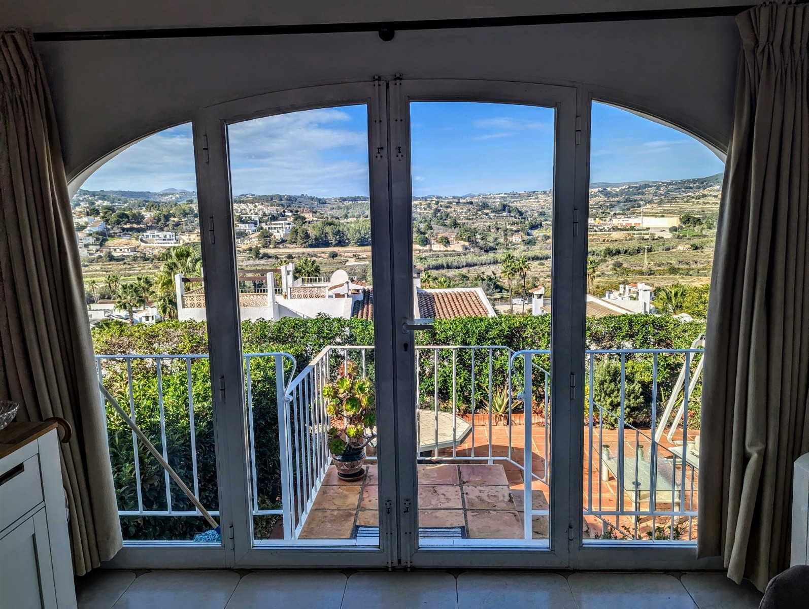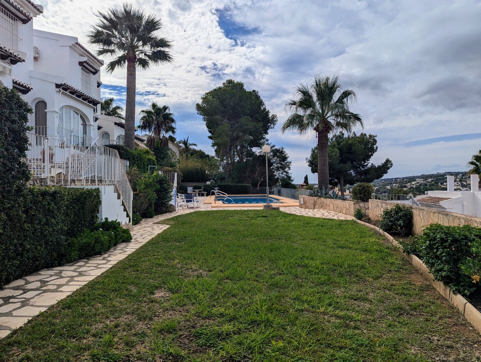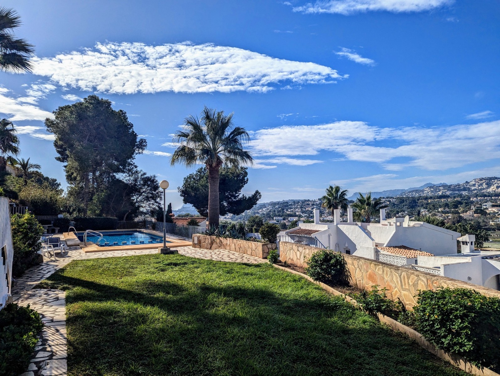Price Negotiable.This lovely townhouse is located in the Maryvilla urbanisation in Paichi, close to all of the amenities and just a short drive to the beach and town centre. Close to the property there is a residents parking area, a flat walk to the front door. You enter into a small hallway, to the right is a walk-in pantry and to the left you enter the kitchen through an archway. The kitchen is compact, but fully fitted with oven, gas hob, extractor, dishwasher and fridge/freezer, and it also includes an arched opening for serving directly to the dining area. After the kitchen you enter a spacious living/dining room and at the far end there is a glazed naya where you can relax and enjoy the lovely views, a perfect place to enjoy the sunsets. Off the living area there is a double bedroom with built-in wardrobe and lovely views through the window. Next to the bedroom is a shower room which includes a vanity unit and a large linen cupboard. Up the staircase from the entrance you reach the first floor, to the left is another double bedroom with a large dressing room and to the right is the second bathroom which includes a vanity unit, bath with shower attachment and storage cupboards. At the end of the hallway you will find the third double bedroom which has a built-in wardrobe and good views through the window, this room is currently used as a reading room. At the other end of the landing there is a glass door that leads to the staircase to the roof terrace. Here there are wonderful views from the Penon de Ifach all the way to the Montgo, a built-in barbecue and built-in seating. Down the external steps from the glazed naya you reach a terrace, perfect for alfresco dining or just relaxing. From here you access the spacious basement which is used as a utility room and for dry storage, it includes a washing machine, fridge/freezer and a large water heater. It is a very short walk to the communal pool area, which includes a lawn, pool terrace and pool shower, and also enjoys views to the mountains. - Key points:- Built: 1990 - Bedrooms: 3, one with large dressing room- Bathrooms: 2, one with linen cupboard- Glazed naya- Open terrace- Well maintained and recently painted by the present owners- Furniture included- Air conditioning H/C in living/dining room and 1 upstairs bedroom- Heated towel radiators in both bathrooms- Double glazed windows with shutters and mosquito screens- Roof terrace with barbecue and wonderful views- Community fees 680€ per year- Annual taxes 406.82€ (total of property tax and rubbish tax)- Do not delay your visit to this lovely home.- Distances:- Supermarket 900m- Bakery and chemist 1.1km- Town centre 2.5km- Beach 2.7km- Golf 5.6km- Motorway access in Benissa 8.9km