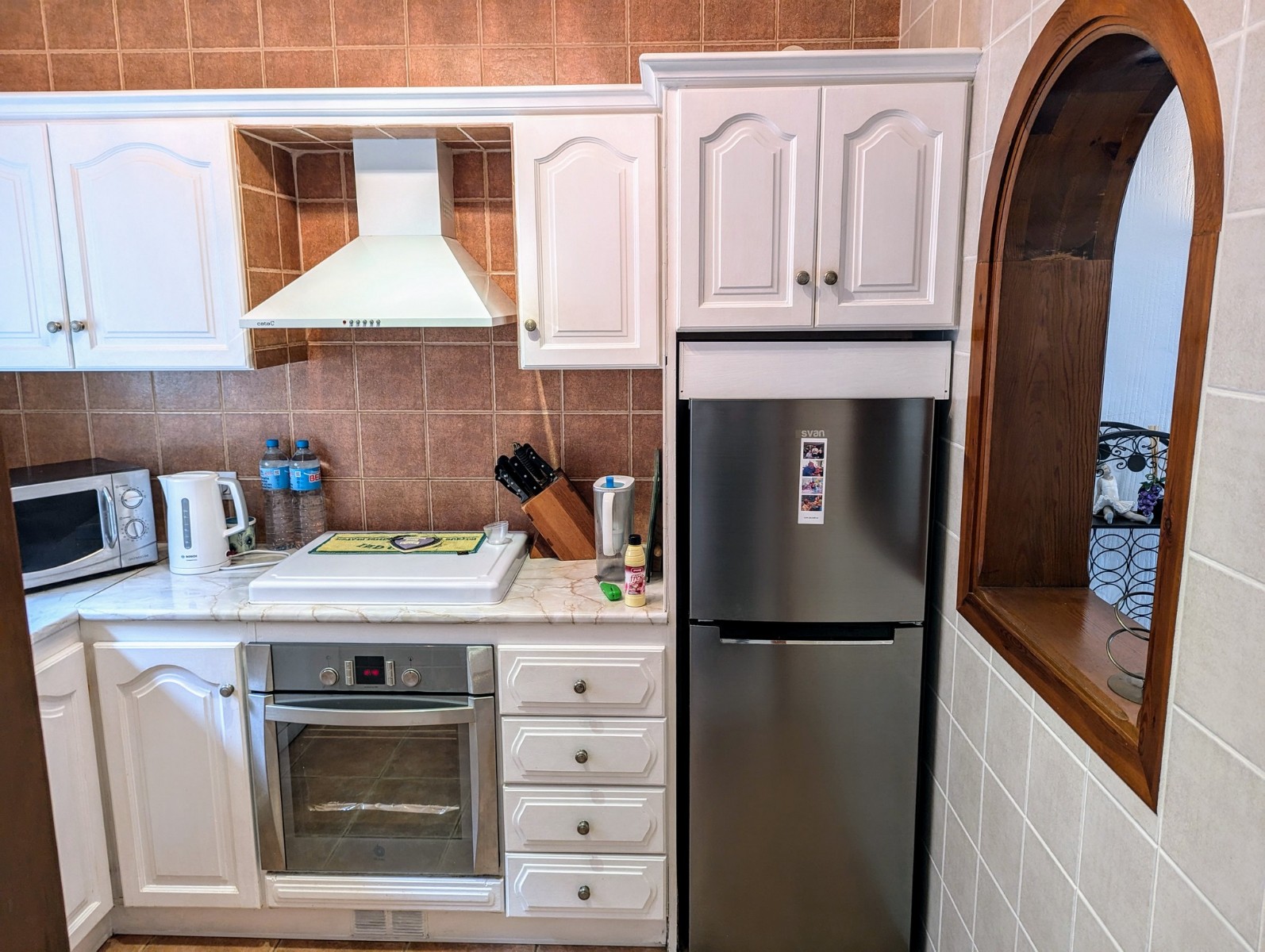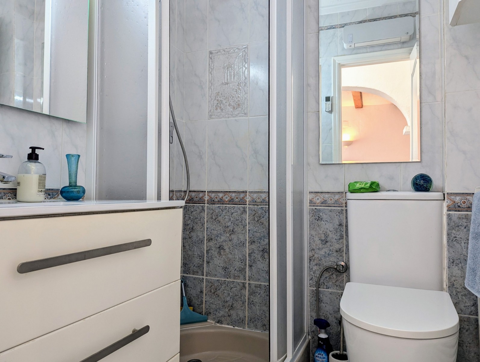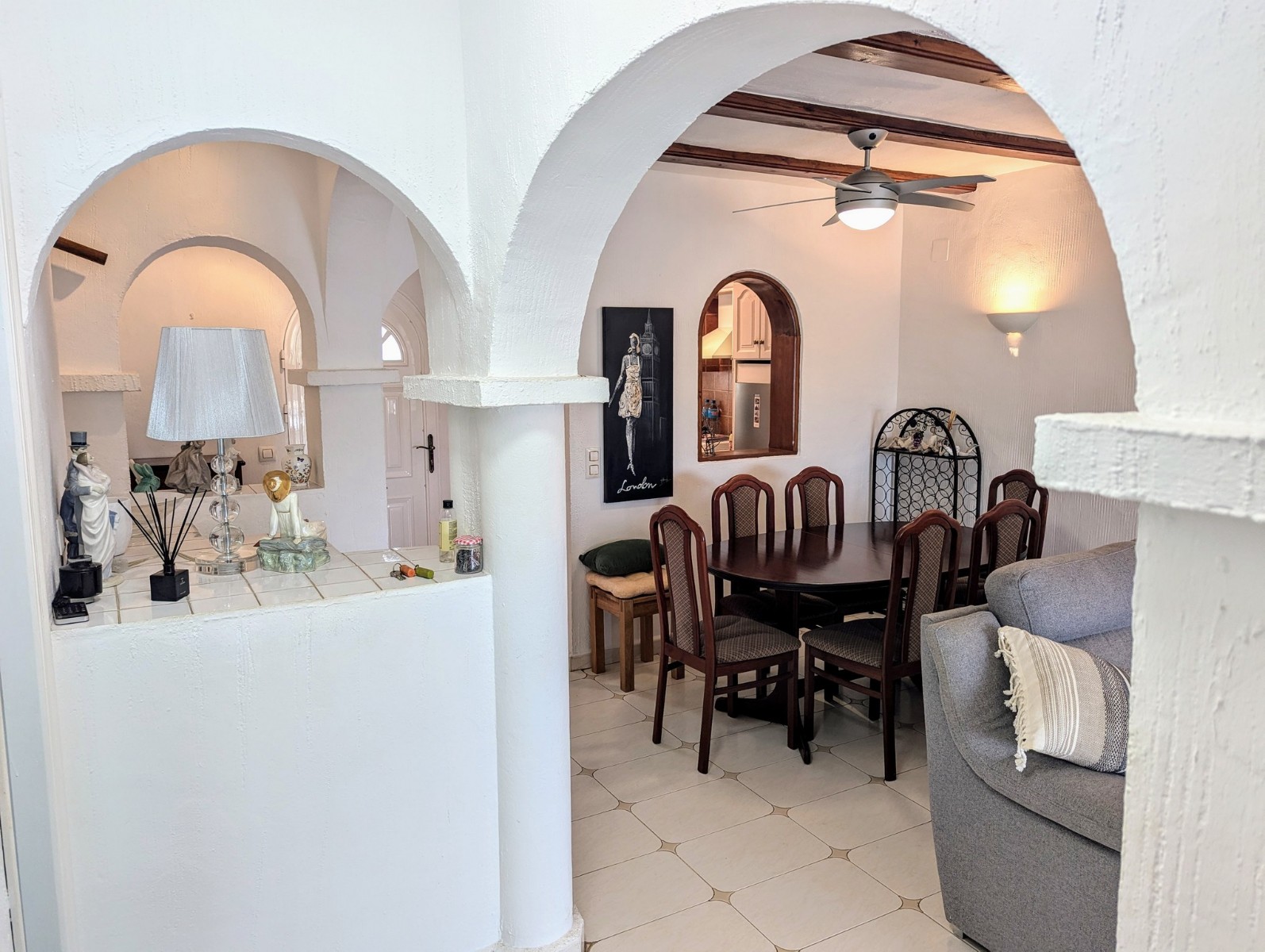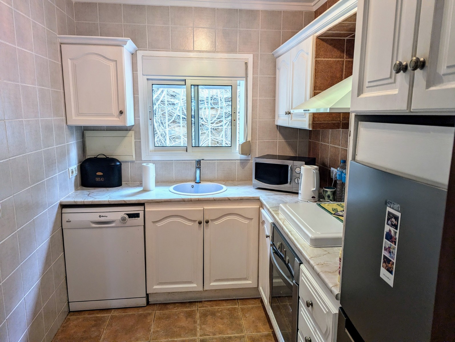 Price Negotiable.This lovely townhouse is located in the Maryvilla urbanisation in Paichi, close to all of the amenities and just a short drive to the beach and town centre. Close to the property there is a residents parking area, a flat walk to the front door. You enter into a small hallway, to the right is a walk-in pantry and to the left you enter the kitchen through an archway. The kitchen is compact, but fully fitted with oven, gas hob, extractor, dishwasher and fridge/freezer, and it also includes an arched opening for serving directly to the dining area. After the kitchen you enter a spacious living/dining room and at the far end there is a glazed naya where you can relax and enjoy the lovely views, a perfect place to enjoy the sunsets. Off the living area there is a double bedroom with built-in wardrobe and lovely views through the window. Next to the bedroom is a shower room which includes a vanity unit and a large linen cupboard. Up the staircase from the entrance you reach the first floor, to the left is another double bedroom with a large dressing room and to the right is the second bathroom which includes a vanity unit, bath with shower attachment and storage cupboards. At the end of the hallway you will find the third double bedroom which has a built-in wardrobe and good views through the window, this room is currently used as a reading room. At the other end of the landing there is a glass door that leads to the staircase to the roof terrace. Here there are wonderful views from the Penon de Ifach all the way to the Montgo, a built-in barbecue and built-in seating. Down the external steps from the glazed naya you reach a terrace, perfect for alfresco dining or just relaxing. From here you access the spacious basement which is used as a utility room and for dry storage, it includes a washing machine, fridge/freezer and a large water heater. It is a very short walk to the communal pool area, which includes a lawn, pool terrace and pool shower, and also enjoys views to the mountains. - Key points:- Built: 1990 - Bedrooms: 3, one with large dressing room- Bathrooms: 2, one with linen cupboard- Glazed naya- Open terrace- Well maintained and recently painted by the present owners- Furniture included- Air conditioning H/C in living/dining room and 1 upstairs bedroom- Heated towel radiators in both bathrooms- Double glazed windows with shutters and mosquito screens- Roof terrace with barbecue and wonderful views- Community fees 680€ per year- Annual taxes 406.82€ (total of property tax and rubbish tax)- Do not delay your visit to this lovely home.- Distances:- Supermarket 900m- Bakery and chemist 1.1km- Town centre 2.5km- Beach 2.7km- Golf 5.6km- Motorway access in Benissa 8.9km