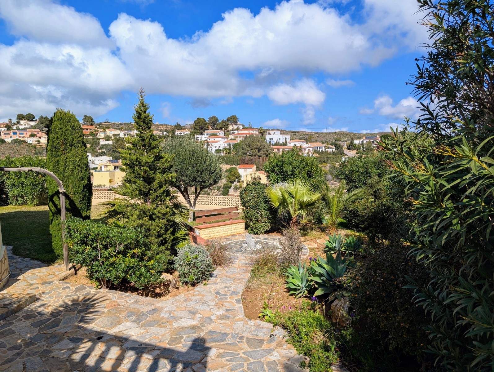This beautifully maintained villa offers the perfect blend of Mediterranean charm and versatile living. Nestled in the peaceful Girasoles zone of Cumbre del Sol, the property sits on the edge of a lush green zone, providing a serene backdrop and from the garden there are stunning views that stretch across the landscape to the sea. With two entirely independent floors, this home is an ideal choice for a large family, a holiday getaway, or a savvy rental investment. A Home of Two Halves: Elegance & Independence The villa is thoughtfully distributed over two separate levels, each with its own character and direct access from a quiet residential street. The Upper Level: Poolside Sophistication Arrive via the street-level detached garage or one of the two pedestrian gates. The upper floor is designed for relaxation and effortless flow: The Living Spaces: Enter through a bright, glazed naya that leads into a wide, welcoming entrance hall—both perfectly suited as sun-drenched reading nooks. The heart of the home is a spacious living/dining area featuring a cozy wood-burner for atmospheric evenings.Modern Amenities: Enjoy a superb, newly renovated shower room and separate guest toilet. The fully fitted pine kitchen is a chef’s delight, complete with modern appliances and calming views over the green zone.Outdoor Connection: Step out to a covered terrace, which includes a handy utility/storage room and leads directly to a secondary barbecue terrace for sunset grilling. The Lower Level: The Ultimate Guest Retreat Accessible via a staircase by the pool or its own private entrance, the lower level offers complete independence: A Second Home: This floor features its own fully equipped light-wood kitchen with a glazed door leading to an intimate courtyard terrace—the perfect spot for a quiet breakfast.Luxurious Comfort: A massive double bedroom with sliding wardrobes is served by a large, renovated "spa" bathroom, featuring both a walk-in shower and a jacuzzi corner bath.Practicality: A spacious guest toilet also doubles as a laundry and boiler room for maximum efficiency. Your Private Oasis: Gardens & Sun-Drenched Terraces The outdoor spaces are designed to celebrate the Mediterranean climate: The Pool: Centre stage is the 8 x 4m swimming pool, surrounded by a generous terrace with ample room for sun loungers and an outdoor shower. The boundary would benefit from extra trees to provide more privacy.The Gardens: Unlike many properties, this villa boasts a large, lush lawn framed by Mediterranean plants and a variety of fruit trees, including fig, almond, and nespiro.Secret Spaces: Discover a tranquil seating area centered around a fountain and the under-pool store room which keeps all your equipment neatly tucked away. Property Highlights & Specifications Built/Ownership: Constructed in 1996; well maintained by the current owners since 2015.Capacity: 3 Bedrooms (2+1) plus space for two sofa beds; 2 Bathrooms (1+1) and 2 Guest Toilets (1+1).Climate Control: Gas central heating throughout, air conditioning in the upper living room and master bedroom, and ducted air conditioning on the lower floor.Quality Finishes: Double-glazed windows (wood upper/PVC lower) with mosquito nets and shutters.Turn-Key: Offered fully furnished and equipped—ready for you to move in and enjoy immediately.Financials: Low annual taxes of €805 (IBI and rubbish). Perfectly Positioned Everything you need is just a short journey away: Convenience: Shopping centre (800m) and Benitachell town (3.8km).Leisure: The iconic Cala Moraig beach (2km) and Javea Golf (5.5km).Exploration: Moraira (9.2km) and the vibrant Javea Arenal (10.6km) are within easy reach. Whether you are looking for a tranquil family sanctuary or a high-potential rental property, this villa for sale in Cumbre del Sol is ready to exceed your expectations. Contact us today to arrange a viewing!