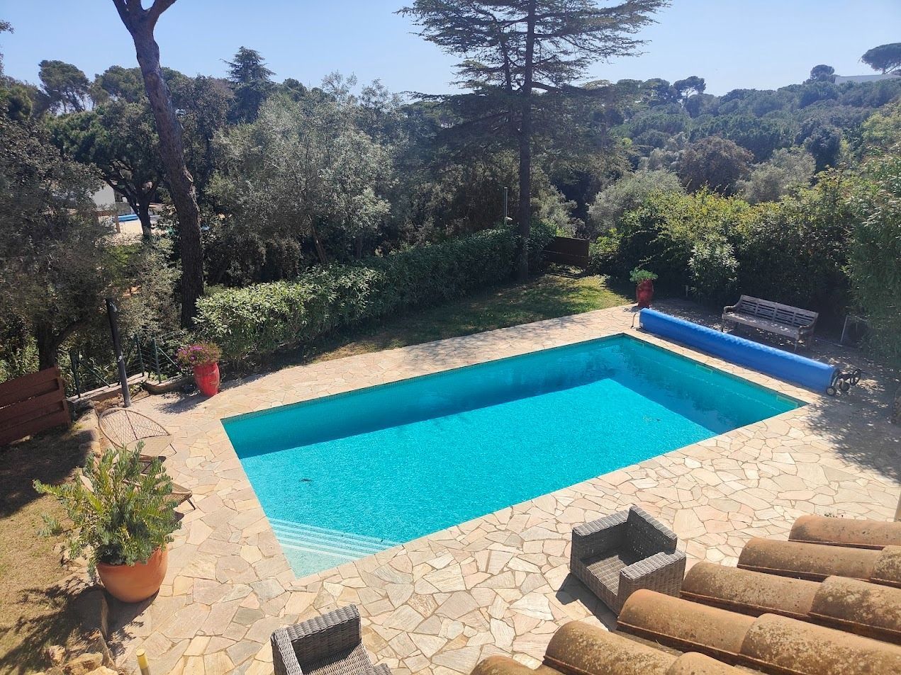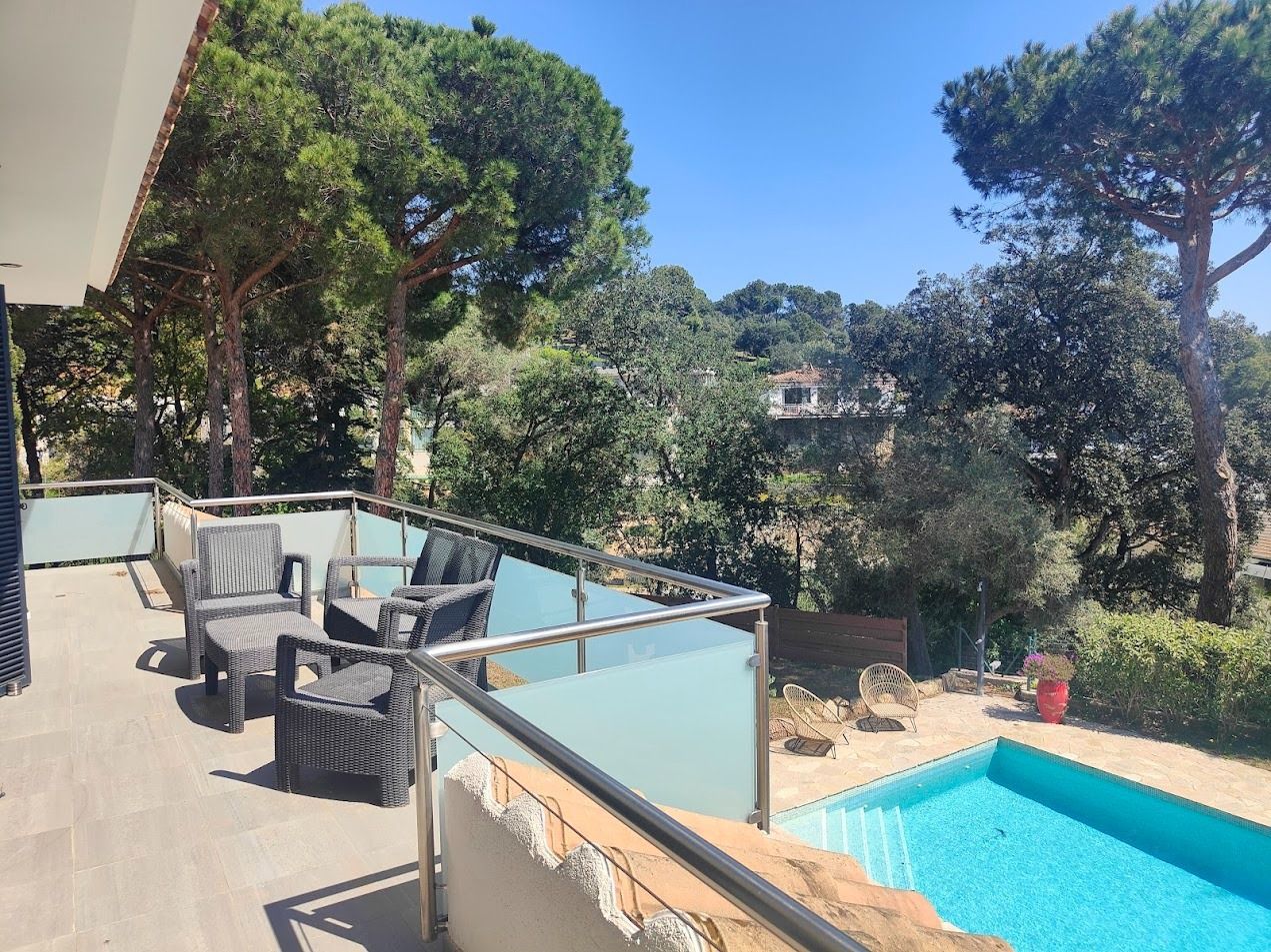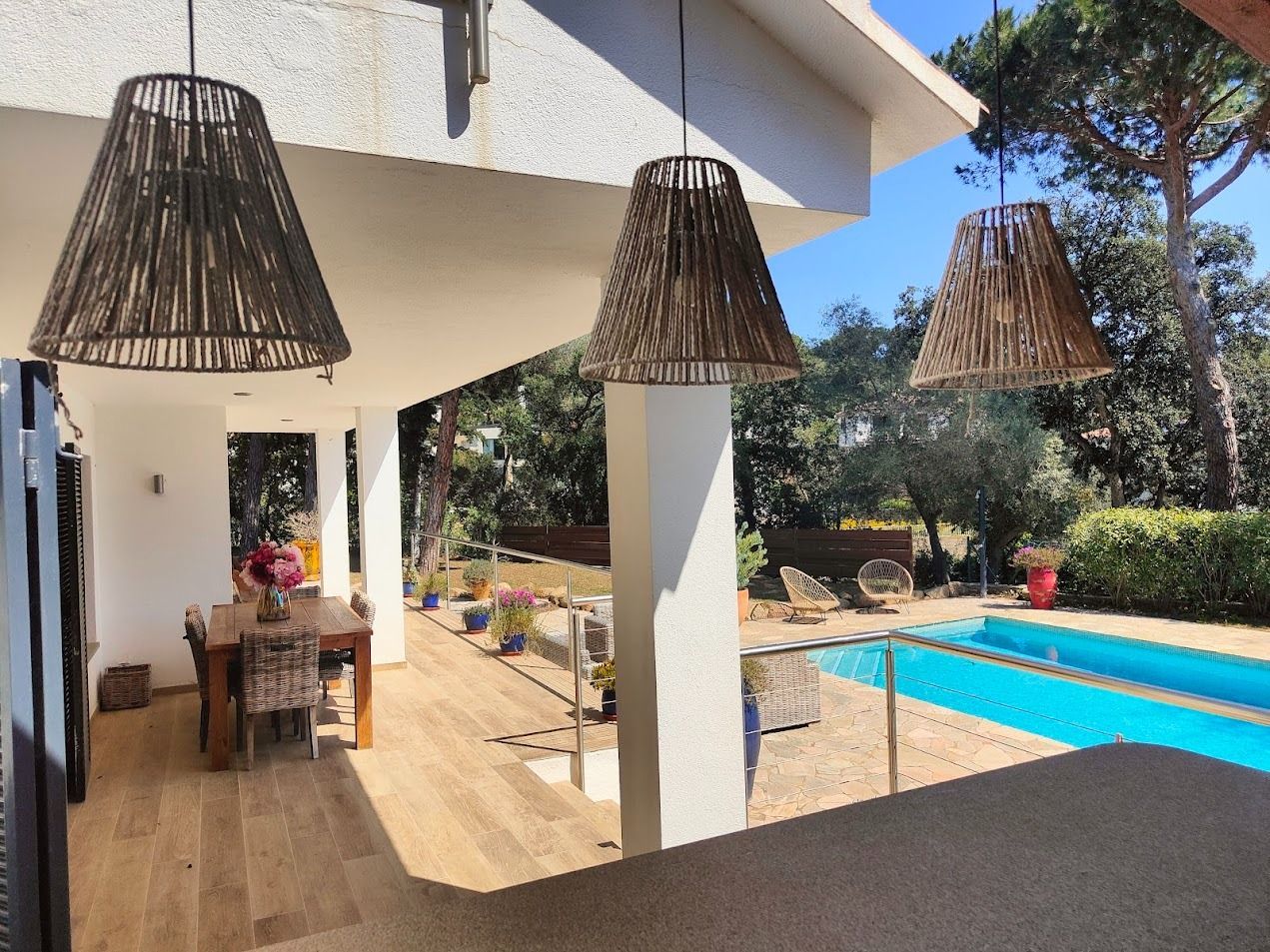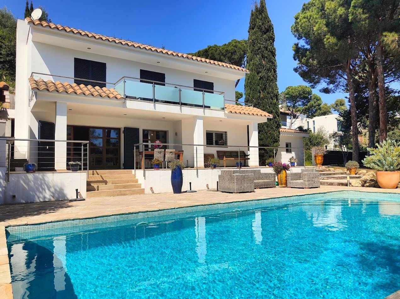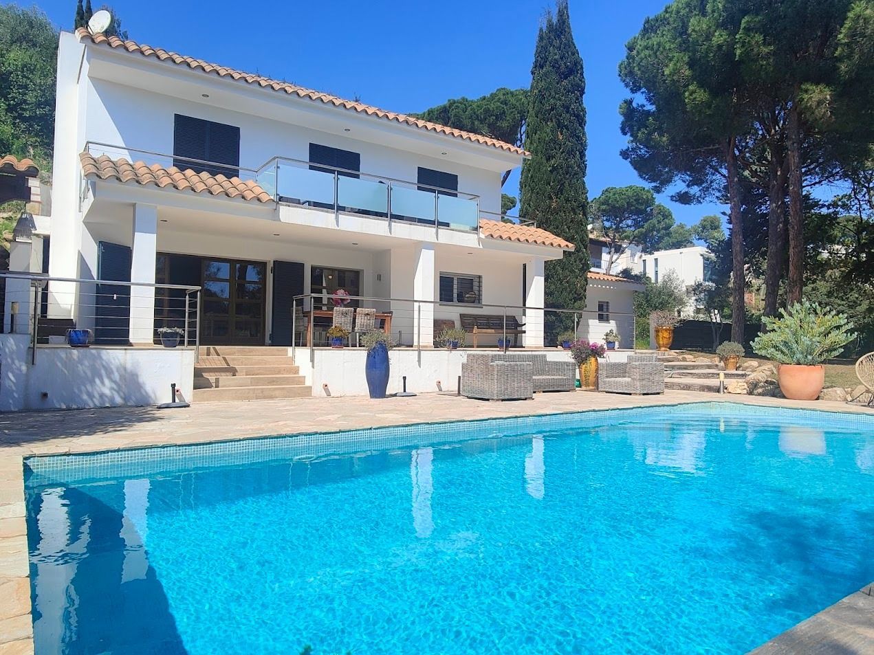Just 800 metres from the beach and 2 kilometres from the lively centre of Platja d’Aro, this beautiful detached villa is situated in the exclusive residential area of Mas Treumal. Here you can enjoy the perfect balance between peace, privacy and the vibrant life on the Costa Brava. The villa is situated in a dead-end street in a green, quiet area and offers complete privacy. Thanks to its location, you can easily walk to the beach or cycle to the centre. The house has been completely renovated in recent years and has also been expanded with a separate guest room with private bathroom on the ground floor and a newly constructed swimming pool (10 x 5 metres, approx. 2015). This stylish villa has a total built-up area of 257 m² and is situated on a generous plot of 1,451 m². Ground floor: - Representative entrance - Spacious and bright living/dining room with wood stove and direct access to the covered terrace - Luxurious open kitchen, fully equipped with modern built-in appliances - Guest toilet First floor: - Master bedroom with bathroom en suite - Two comfortable double bedrooms - Modern shared bathroom All bedrooms on the upper floor give access to a terrace with a beautiful view of the green surroundings of the urbanization. Adjacent to the house is a separate guest bedroom with private bathroom and private entrance - ideal for guests. You also have a spacious separate storage room. An absolute eye-catcher is the cozy covered barbecue area with bar - the perfect place to spend long summer evenings with family or friends. Special features: - Aluminum frames with double glazing - Aluminum shutters for windows and doors - Built-in wardrobes in the bedrooms - Air conditioning in the bedrooms - Electric radiators - Automatic garden irrigation - Recently renovated infrastructure in the area (including roads and sewer) This villa combines Mediterranean charm with modern living comfort and a fantastic location - an ideal (second) home under the Spanish sun. Taxes, notary fees and registration costs are not included in the sales price.[IW]