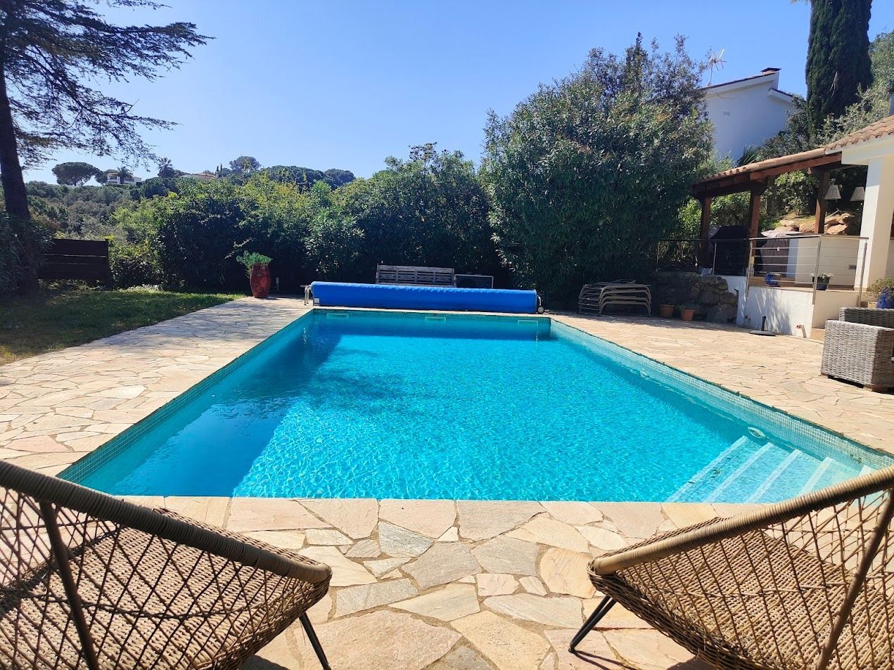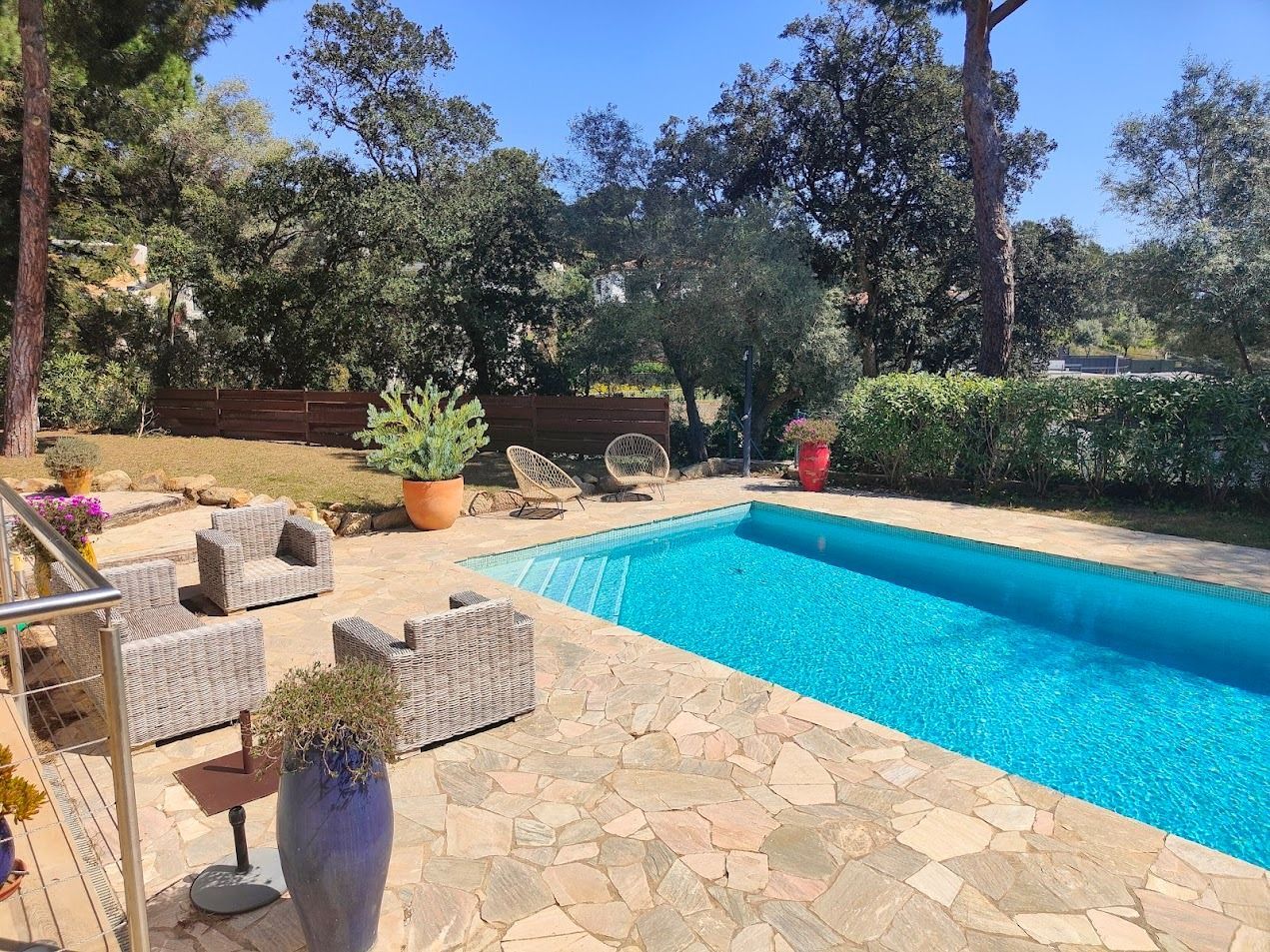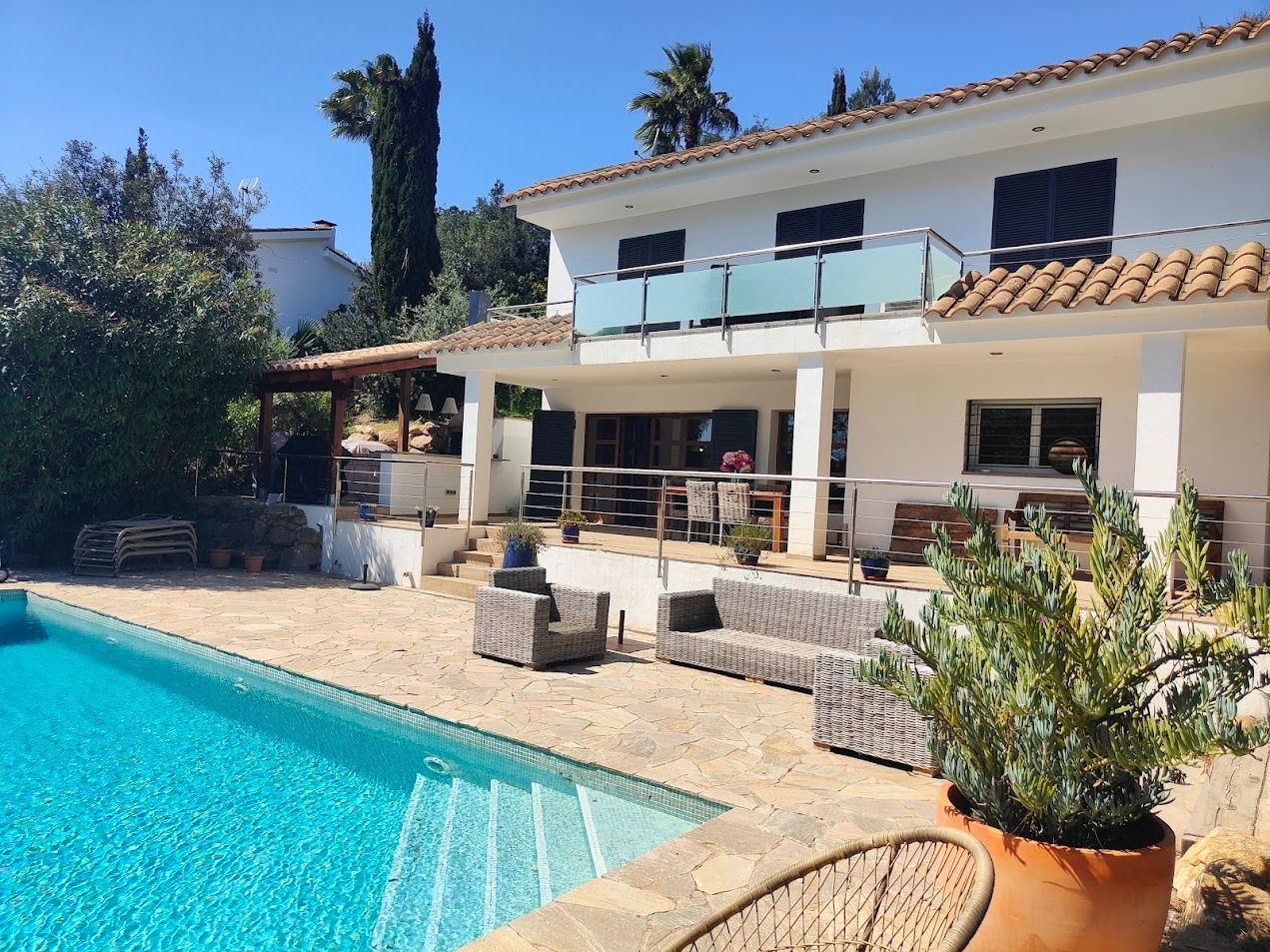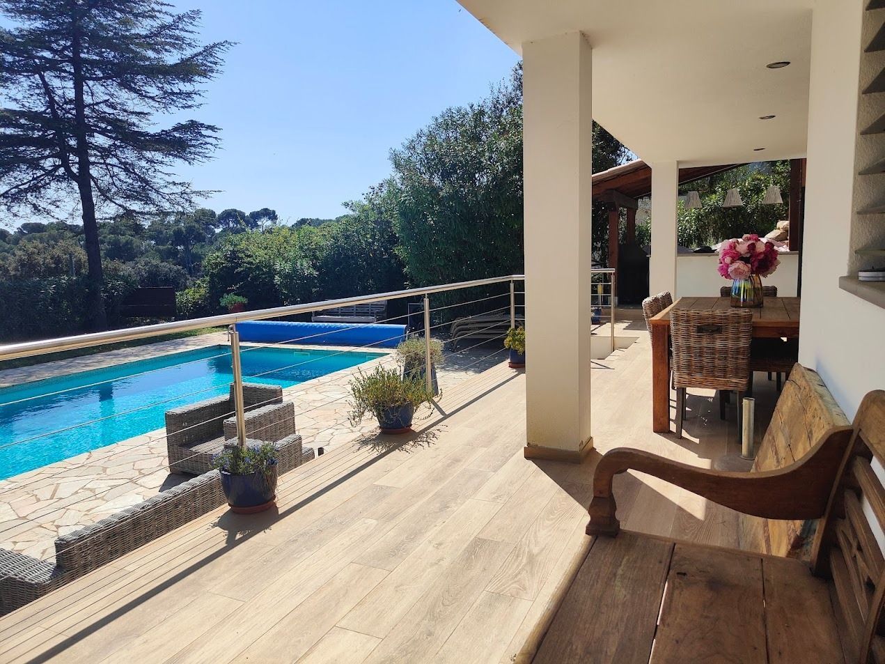 Just 800 metres from the beach and 2 kilometres from the lively centre of Platja d’Aro, this beautiful detached villa is situated in the exclusive residential area of Mas Treumal. Here you can enjoy the perfect balance between peace, privacy and the vibrant life on the Costa Brava. The villa is situated in a dead-end street in a green, quiet area and offers complete privacy. Thanks to its location, you can easily walk to the beach or cycle to the centre. The house has been completely renovated in recent years and has also been expanded with a separate guest room with private bathroom on the ground floor and a newly constructed swimming pool (10 x 5 metres, approx. 2015). This stylish villa has a total built-up area of 257 m² and is situated on a generous plot of 1,451 m². Ground floor: - Representative entrance - Spacious and bright living/dining room with wood stove and direct access to the covered terrace - Luxurious open kitchen, fully equipped with modern built-in appliances - Guest toilet First floor: - Master bedroom with bathroom en suite - Two comfortable double bedrooms - Modern shared bathroom All bedrooms on the upper floor give access to a terrace with a beautiful view of the green surroundings of the urbanization. Adjacent to the house is a separate guest bedroom with private bathroom and private entrance - ideal for guests. You also have a spacious separate storage room. An absolute eye-catcher is the cozy covered barbecue area with bar - the perfect place to spend long summer evenings with family or friends. Special features: - Aluminum frames with double glazing - Aluminum shutters for windows and doors - Built-in wardrobes in the bedrooms - Air conditioning in the bedrooms - Electric radiators - Automatic garden irrigation - Recently renovated infrastructure in the area (including roads and sewer) This villa combines Mediterranean charm with modern living comfort and a fantastic location - an ideal (second) home under the Spanish sun. Taxes, notary fees and registration costs are not included in the sales price.[IW]