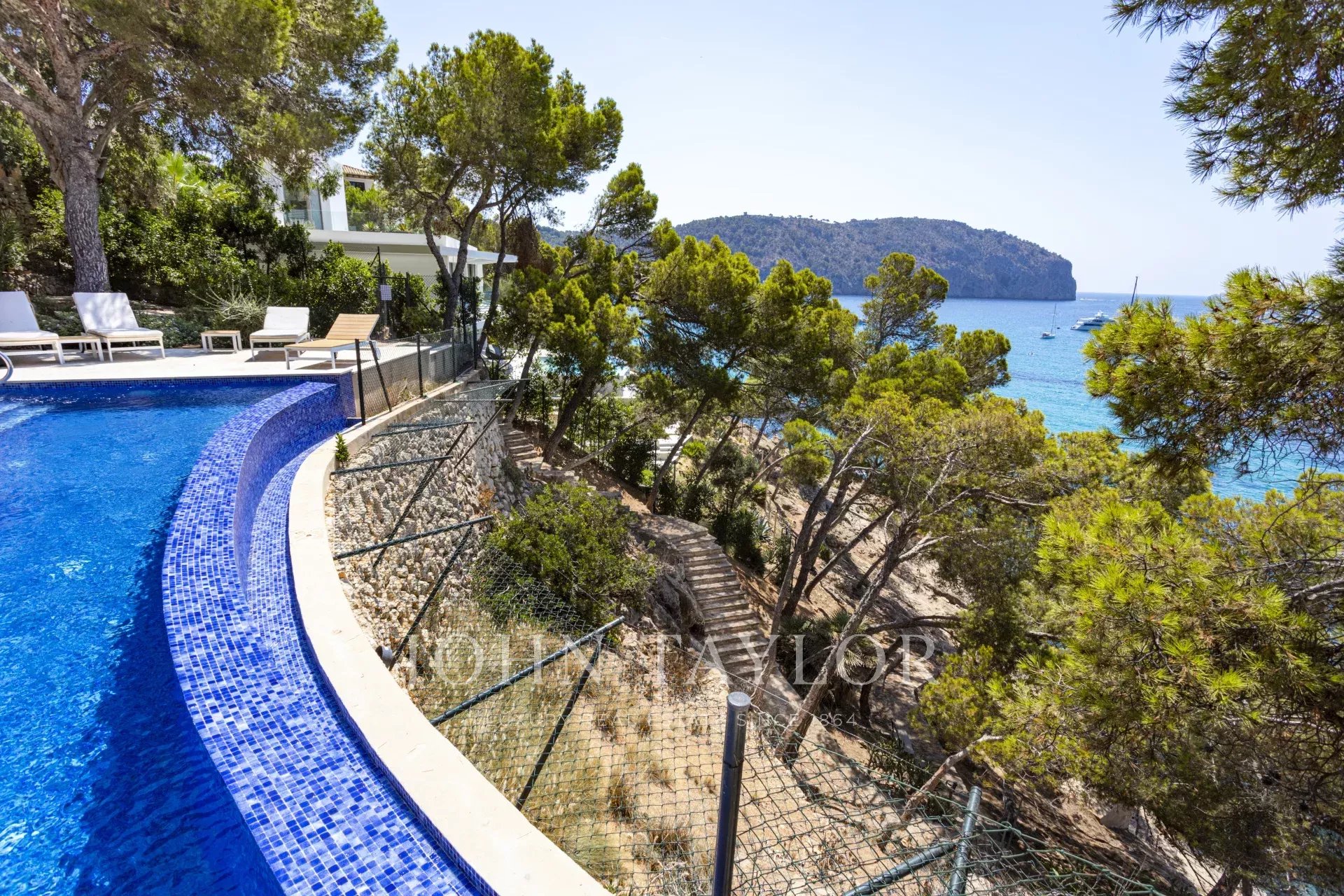 Luxury villa on the first line of Camp de Mar (Andratx) with sea access This exclusive seafront villa in Camp de Mar, Majorca, offers unrivalled panoramic views of the Mediterranean Sea and direct access to the sea from the property. Situated in a privileged and tranquil location at the end of a cul de sac, this property was built in 1981 and is distinguished by its attractive exterior design which reflects the architectural charm of the period. With a constructed area of 431 m² and set on a spacious plot of 1864 m², the villa has four bedrooms, three bathrooms and a garage for two cars. Outside, there is a spectacular swimming pool with sea views and spacious terraces with porch on both the ground floor and the first floor, ideal for enjoying the Mediterranean climate and the sea views that only Camp de Mar can offer. This unique property in Mallorca is perfect for those looking for an exclusive residence in one of the most sought after areas of the island. The municipality of Andratx is located in the southwest of Mallorca and borders with the towns of Calvia and Estellencs. It is also made up of six population centres; Andratx, Port d'Andratx, Sa Coma, s'Arracó, San Telmo and Camp de Mar. The municipality belongs to the Sierra de Tramuntana region. One of the charms of this locality is located in front of the coast of the municipality, the islet of Sa Dragonera, declared a Natural Park in 1995, which can be reached by sea. Andratx has a diverse landscape, made up of beautiful mountains, welcoming valleys and rugged coastlines with small coves. Every Wednesday of the month, except public holidays, a traditional market with more than 200 stalls takes place in the streets of Andratx. You can find a wide variety of products such as fresh fruit, vegetables, sausages, knick-knacks, handicrafts, leather goods, clay utensils, typical Mallorcan products, among other things.