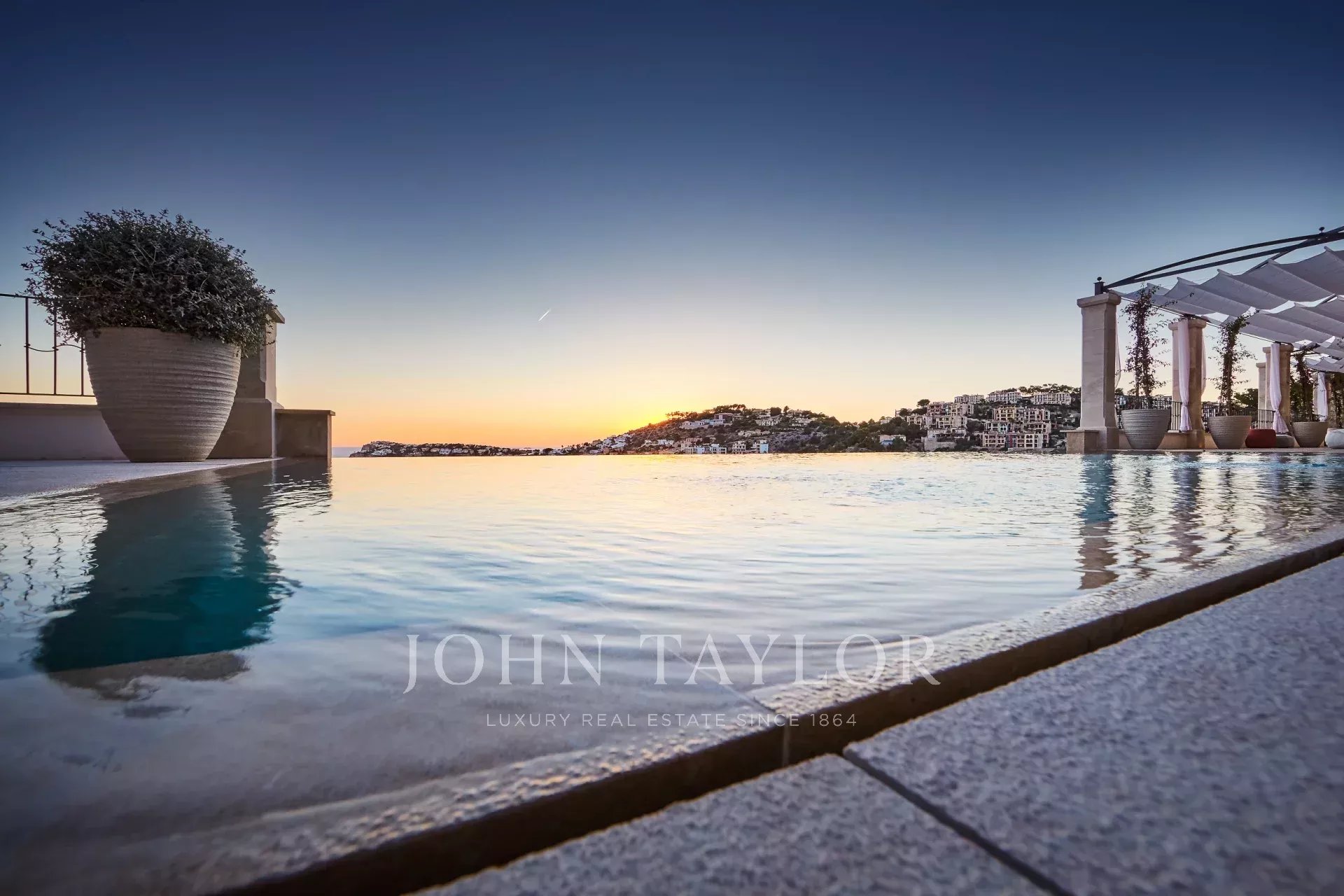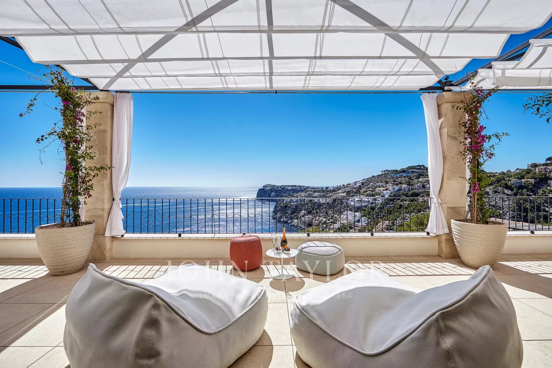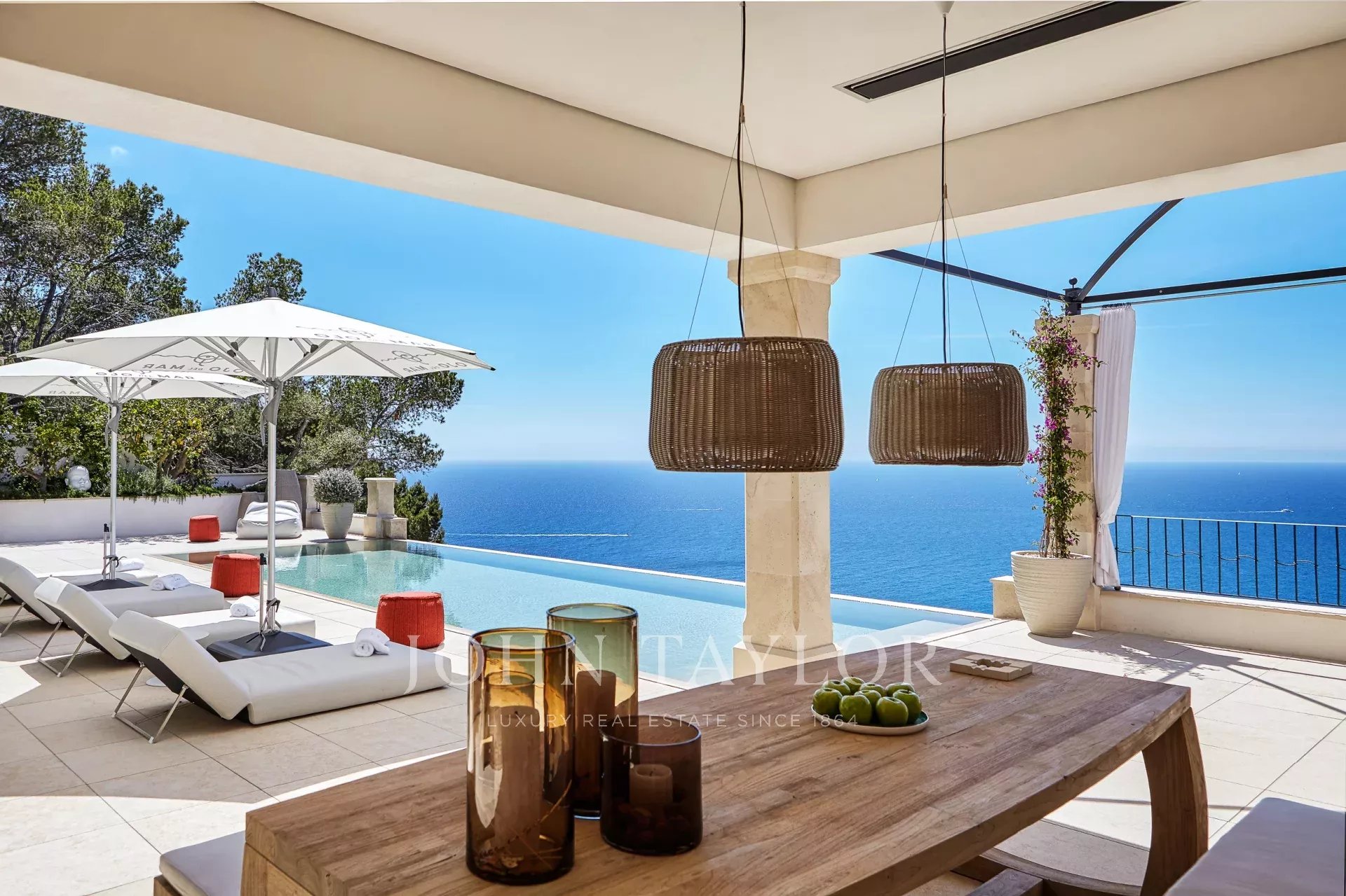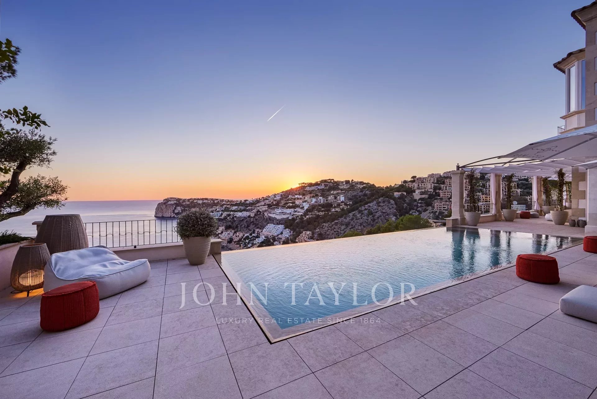 Stunning Sea View Villa in Cala Llamp This luxurious property is situated in a sought-after location above the bay of Cala Llamp and offers breathtaking panoramic sea views. The villa has a constructed area of 700m2 on three levels. On the ground floor, there is an elegant entrance hall leading to the TV lounge, living room, dining room, and kitchen. The spacious living area is extended through the pergolas onto the terraces, where there are two outdoor kitchens with barbecue grills and a large dining table as well as a bathroom. Another highlight is the 60m2 infinity pool. The outdoor area is designed to allow you to perfectly enjoy the Mediterranean climate. The upper floor can be reached via the lift or the elegantly lit staircase, where the sleeping area is located. This consists of two bedrooms with en-suite bathrooms and a comfortable master suite. This consists of an anteroom, a spacious sleeping area, and a luxurious bathroom with a bathtub in the bay window. In the basement, in addition to the 100m2 garage, which offers space for at least 5 cars, there is a bodega, a fitness area with sauna, a home cinema, a service bedroom with en-suite bathroom, a further bathroom, a laundry room, a utility room, and a storage room. The property will be sold including the furniture. Photos courtesy of Marco Richter. The Port of Andrach (officially and in Catalan Port d'Andratx) is a natural port of the Balearic Islands, surrounded by coves with transparent waters such as Cala Llamp, Cala Moragues, and Cala d'Egos. This modern port town, with 3,000 inhabitants, has gone from being a former fishermen's refuge to being one of the most important and visited tourist centers in Mallorca, thanks to its nautical activity, which is conducive to very exclusive residential tourism. El Puerto is a cosmopolitan and lively place, where many cultures mix and shopping, sun, and nightlife are combined. It also offers an infinity of activities related to the sea. However, it has one of the best-equipped marinas on the Islands, the Puerto de Andrach Sailing Club, with about 500 berths occupied by sports and pleasure boats. Shops and restaurants with pleasant terraces overlooking the sea overlook the promenade, which leads to the lighthouse and the Club de Vela, passing through the small torrent des Saluet. The Port of Andrach has a select hotel infrastructure and also some of the most renowned establishments in the island's gastronomic offer. In the afternoon, it becomes one of the liveliest areas of the municipality. From the port, it is possible to go to Sa Mola, from where you can admire a splendid sunset and the open sea with the island of Dragonera.
