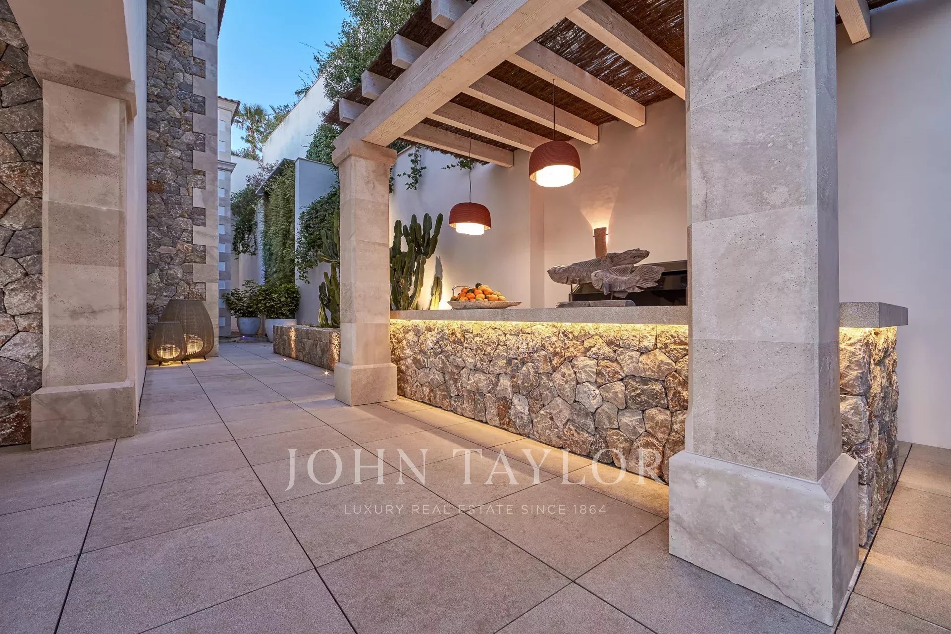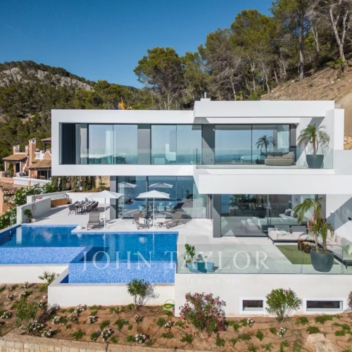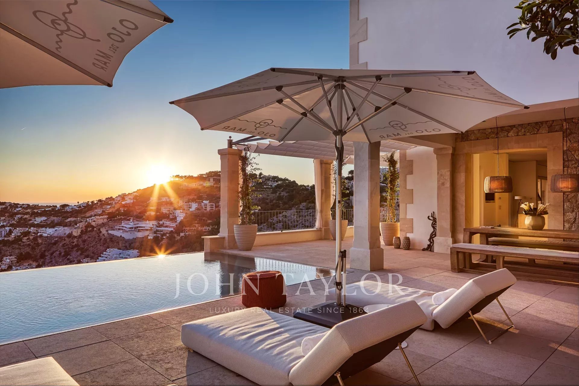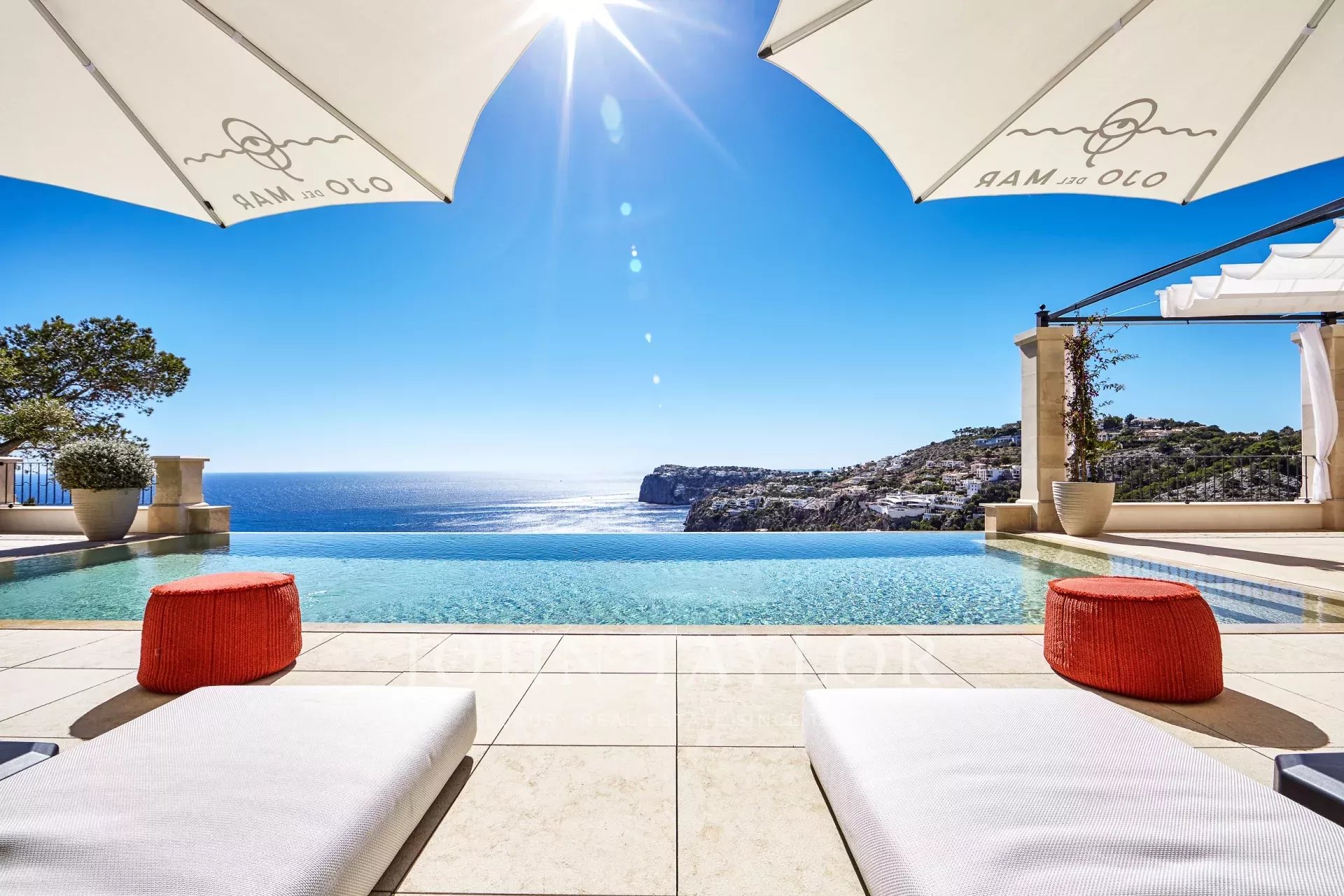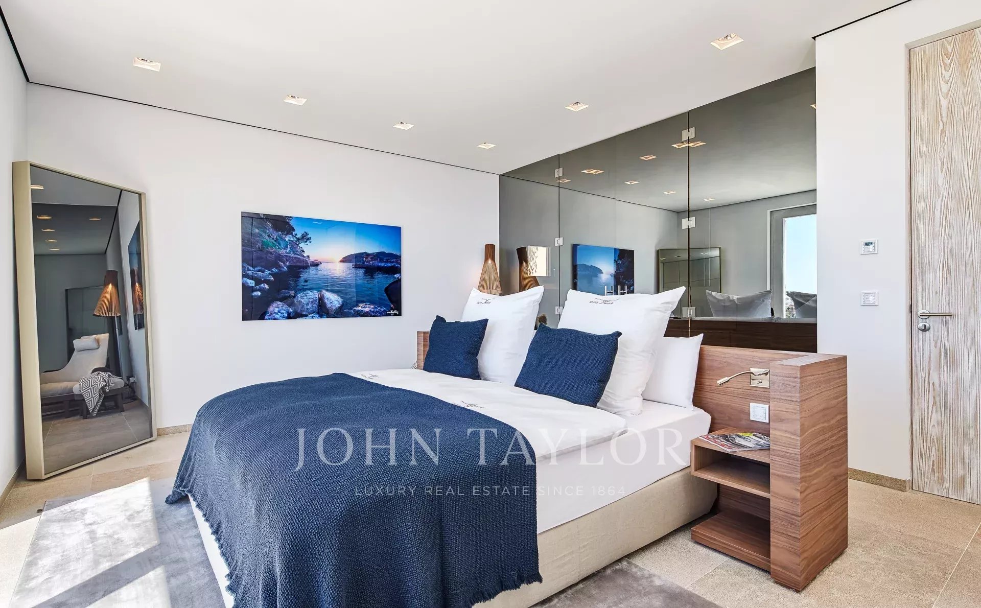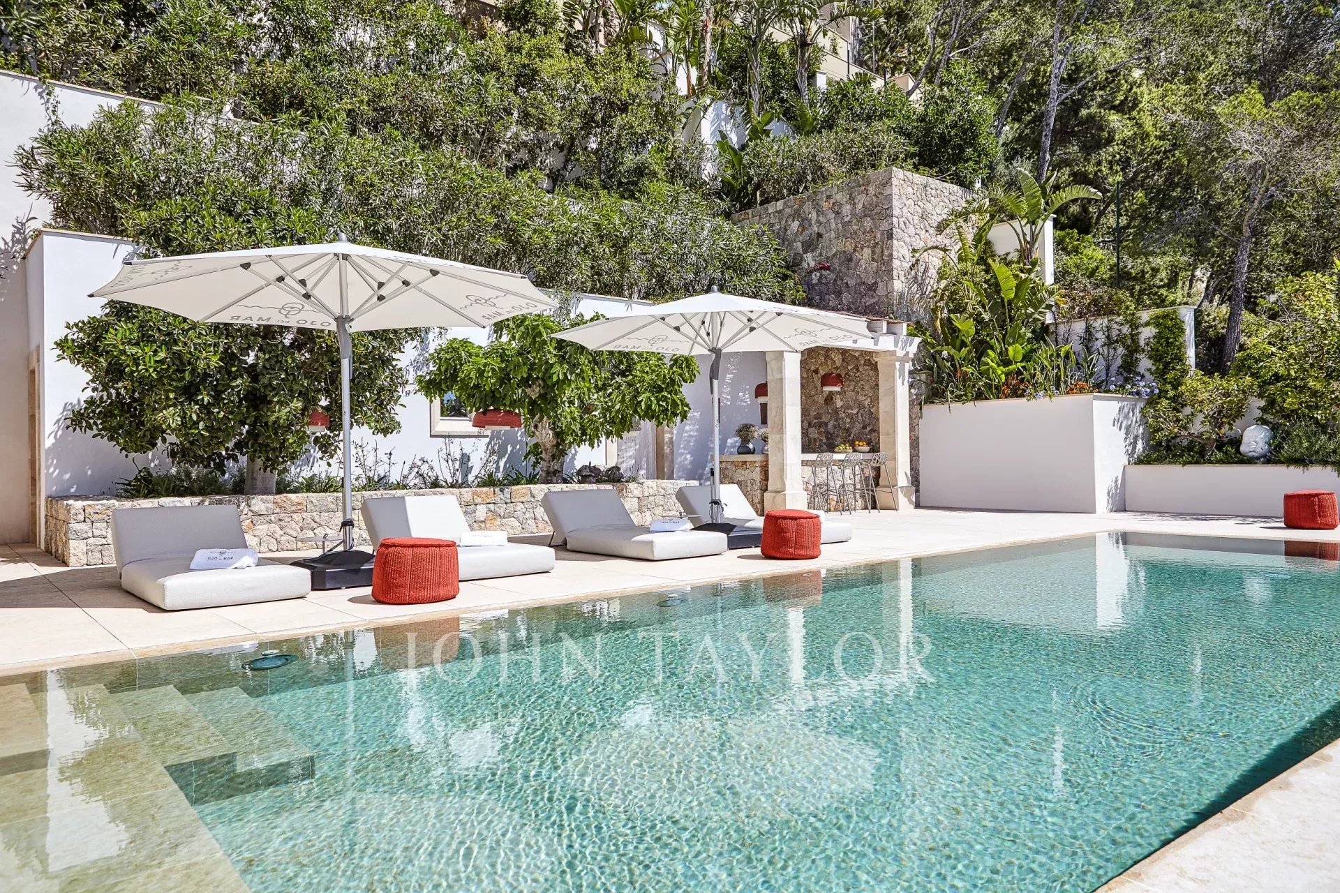Stunning Sea View Villa in Cala Llamp This luxurious property is situated in a sought-after location above the bay of Cala Llamp and offers breathtaking panoramic sea views. The villa has a constructed area of 700m2 on three levels. On the ground floor, there is an elegant entrance hall leading to the TV lounge, living room, dining room, and kitchen. The spacious living area is extended through the pergolas onto the terraces, where there are two outdoor kitchens with barbecue grills and a large dining table as well as a bathroom. Another highlight is the 60m2 infinity pool. The outdoor area is designed to allow you to perfectly enjoy the Mediterranean climate. The upper floor can be reached via the lift or the elegantly lit staircase, where the sleeping area is located. This consists of two bedrooms with en-suite bathrooms and a comfortable master suite. This consists of an anteroom, a spacious sleeping area, and a luxurious bathroom with a bathtub in the bay window. In the basement, in addition to the 100m2 garage, which offers space for at least 5 cars, there is a bodega, a fitness area with sauna, a home cinema, a service bedroom with en-suite bathroom, a further bathroom, a laundry room, a utility room, and a storage room. The property will be sold including the furniture. Photos courtesy of Marco Richter. The Port of Andrach (officially and in Catalan Port d'Andratx) is a natural port of the Balearic Islands, surrounded by coves with transparent waters such as Cala Llamp, Cala Moragues, and Cala d'Egos. This modern port town, with 3,000 inhabitants, has gone from being a former fishermen's refuge to being one of the most important and visited tourist centers in Mallorca, thanks to its nautical activity, which is conducive to very exclusive residential tourism. El Puerto is a cosmopolitan and lively place, where many cultures mix and shopping, sun, and nightlife are combined. It also offers an infinity of activities related to the sea. However, it has one of the best-equipped marinas on the Islands, the Puerto de Andrach Sailing Club, with about 500 berths occupied by sports and pleasure boats. Shops and restaurants with pleasant terraces overlooking the sea overlook the promenade, which leads to the lighthouse and the Club de Vela, passing through the small torrent des Saluet. The Port of Andrach has a select hotel infrastructure and also some of the most renowned establishments in the island's gastronomic offer. In the afternoon, it becomes one of the liveliest areas of the municipality. From the port, it is possible to go to Sa Mola, from where you can admire a splendid sunset and the open sea with the island of Dragonera.