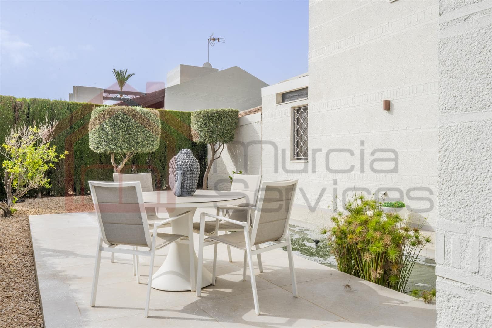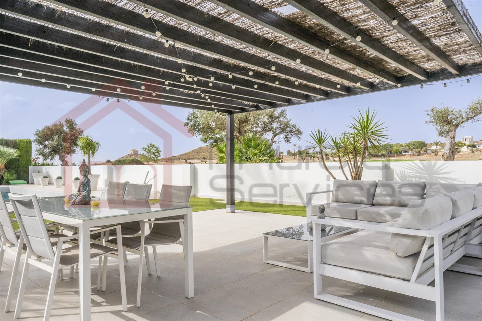 Four bed Villa Peraleja Golf Outstanding south west facing detached Villa Zambra on a 1,000 m2 plot which overlooks the golf course. The villa has been upgraded and has four bedrooms, three bathrooms plus a guest toilet. On the ground floor the glass entrance door leads into a spectacular lounge/dining area with wooden beamed ceilings and a glass balcony staircase. Wood burning fire and large glass sliding doors that lead out to the garden and swimming pool. There is also a large side window with glass door leading out to garden area with a pond ideal for breakfast in the morning sun. A glass panel in the lounge to the front of the house lets in more light making the lounge nice and bright. The master bedroom is to the left of the house and has a wooden beamed ceiling. Adressing area and bathroom with jacuzzi bath and large shower and bidet/toilet. There are corner glass sliding doors from the bedroom into the garden. private pool and golf views To the right of the house there are a further two double bedrooms with fitted wardrobes. Wooden beamed ceilings and glass sliding doors out to the garden. There is a shower room, guest toilet and large laundry/storage area. The fully fitted kitchen is in white gloss with integrated fridge/freezer, dishwasher, NEFF hob. Oven Microwave with a spacious pantry. The large glass sliding door in the kitchen allows plenty of light and a great view into the garden. The garden is private with mature hedging up the sides, olive and fruit trees and a 10m x 5m swimming pool. There is a covered pergola area for outdoor dining with seating area. Double driveway with electric gate and electric car charging point. Peraleja Golf Resort, located in the beautiful region of Murcia, Spain, is an exceptional destination for those seeking a blend of luxury living and serene natural beauty Contact us today to know more or to view this fantastic four bed Villa on Peraleja Golf!