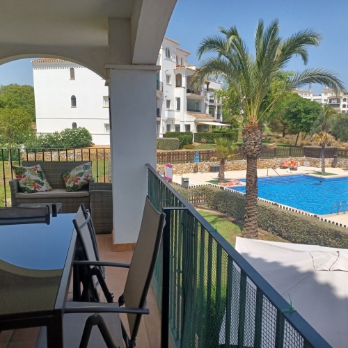 We are thrilled to offer this rare two bedroom two bathroom end apartment on the stunning Hacienda Riquelme Golf Resort.  The property is in a prime location, close to the El Cason clubhouse and supermarket.  It is being sold furnished, with aircon in the lounge, gas central heating throughout, lift and stair access and allocated underground parking.  The village of Sucina is a 5 minutes drive which offers an array of bars, restaurants and amenities. There is a bike path which would take 15 minutes to get to Sucina.This second floor apartment is like a top floor as it does not have another property above only the terrace of the penthouse. On entering the apartment there is an L shaped lounge diner with lots of light due to having three windows and large patio doors to the covered terrace which has views over the pool and golf. There is a galley kitchen with cupboards on both sides, this could easily be open planned to the lounge.  The utility room has had a window installed to keep everything clean and ideal for storage. Opposite the kitchen is a family shower room which benefits from a window giving great ventilation. Both double bedroom have fitted wardrobe and doors leading to their own private juliet balconies. The master bedroom has an ensuite which also has a window.True two bathroom properties on Riquelme are very rare as they only built a few blocks with these types of apartments in them. Contact us to arrange to view this superb property.
