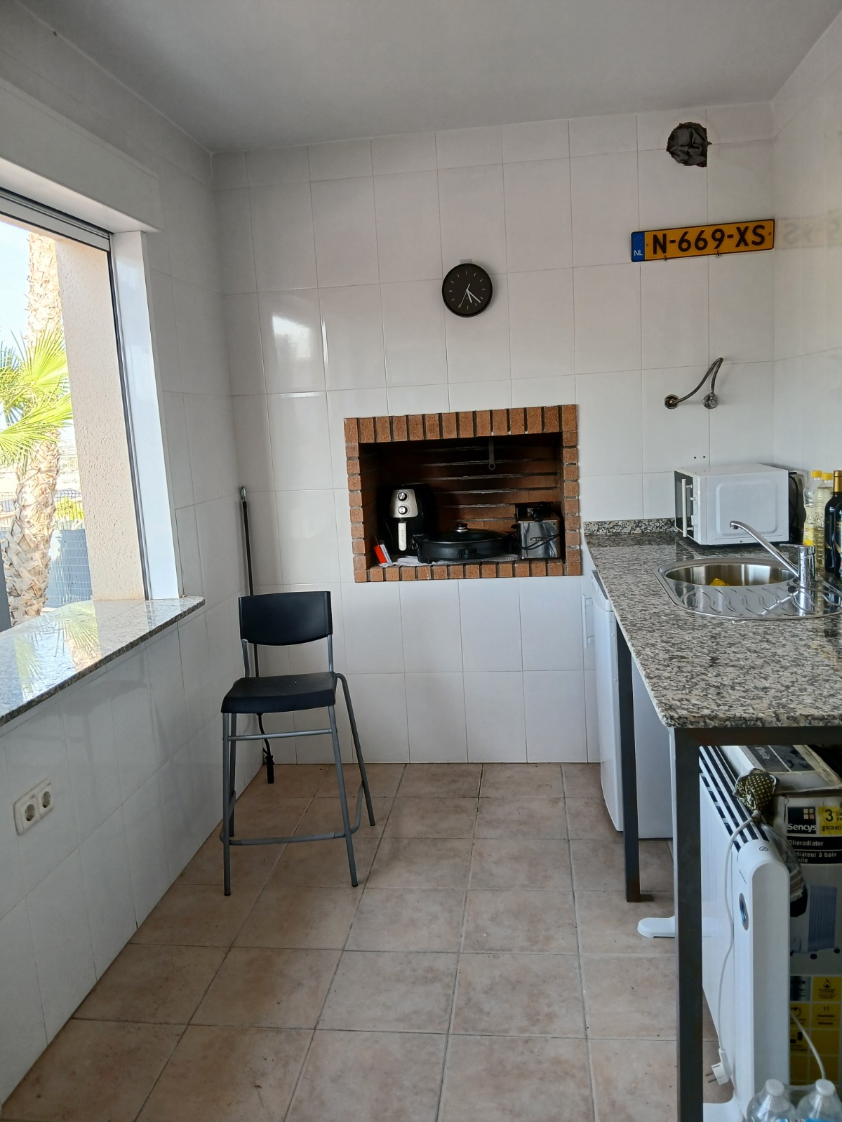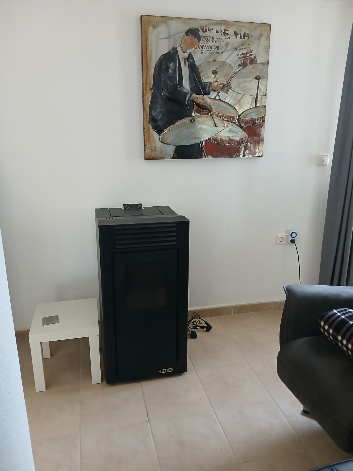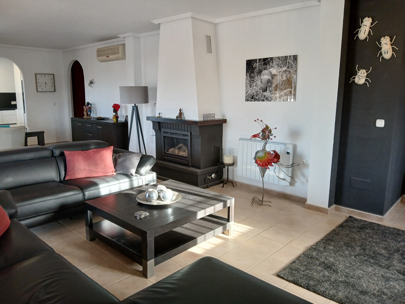 Beautiful detached villa in urbanization in Campos del Rio. In the urbanization of +/- 50 houses live English, Dutch, Belgian, Spanish and French people. The plot of 2000m2 is fully fenced and you have beautiful views of the mountains. You can enter the house through the front door or back door. At the back you enter the house by stairs to a large porch from where you can see the pool and enjoy the view. You then enter the house into the spacious living-dining room of 52.8m2, heated via an 8kw pallet stove installed in December 2023. There is also a gas fireplace, however the gas connection is currently disconnected, this can of course be reconnected. The Formas Cocinas open kitchen of 7.85m2 was installed in February 2023 and is equipped with an oven, microwave, eye-level Siemens dishwasher and large Siemens refrigerator. There are also 3 bedrooms (13.37m2, 13.58m2 and 15.56m2), the largest bedroom has a private bathroom of 6.8m2. The bedrooms have custom-made closets, these remain. There is also a 2nd bathroom with bath of 7.54m2. In the hall by the front door there are also 2 large custom-made wardrobes, these also remain. Next to the pool is a pool house with bar, here is another bathroom, so you don't have to walk through the house with your wet swimwear. Adjacent you will find the in June 2024 newly installed pergola with aluminum slats so you can sit in the shade by the pool. The pool itself was retiled in May 2024 and new lighting was installed. In April 2023, the current owner also had a 35m2 garage built in the same style as the house. You can thus put your car/motorbike/bikes inside.Furthermore, a wooden garden shed of 9m2 for extra storage space was installed in June 2024. The house is powered by 16x 420 watt solar panels with Huawei inverter which were installed in July 2023. The energy costs are therefore only 28 euros per month. The entire house is equipped with air conditioning, double glazing, mosquito nets (May 2023), (mostly electric) shutters, decorative grills (May 2023) and electric heaters. The house is being sold unfurnished. There are no urbanization fees.