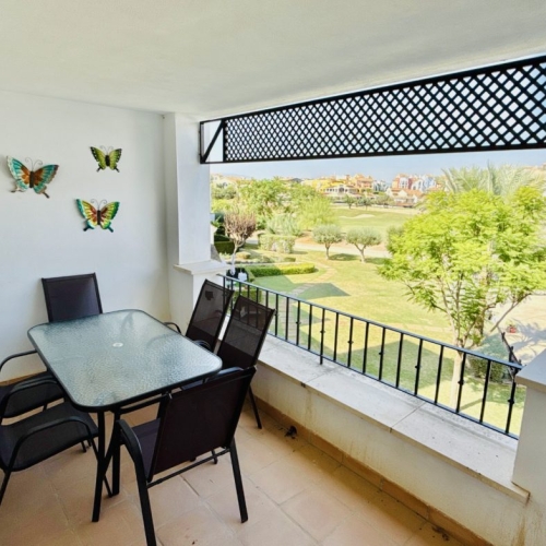 We are pleased to present this 2 bed, 1 bath, second floor apartment in an enviable location within the prestigious La Torre Golf Resort. A fully fitted kitchen A spacious room Two generously sized double bedrooms each with doors that lead out to the front balcony Both bedrooms with built-in wardrobes for extra convenience. Large rear terrace area, overlooking the serene communal pool and the meticulously maintained golf course, offering breathtaking views and a tranquil ambiance. Additional features: – 3 Hot & Cold air- conditioning units – Underground designated parking space Being sold furnished La Torre Golf offers a championship golf course, communal pools, 24 hour security, tennis courts, and a variety of dining and shopping options. It is conveniently located near Murcia-Corvera Airport, offering a seamless travel experience. Enjoy the beaches, Large Shopping Centers, at just a short 15-minute drive. Explore the vibrant city of Murcia ad Cartagena, rich in history and culture, at only a 15-20 minute drive.