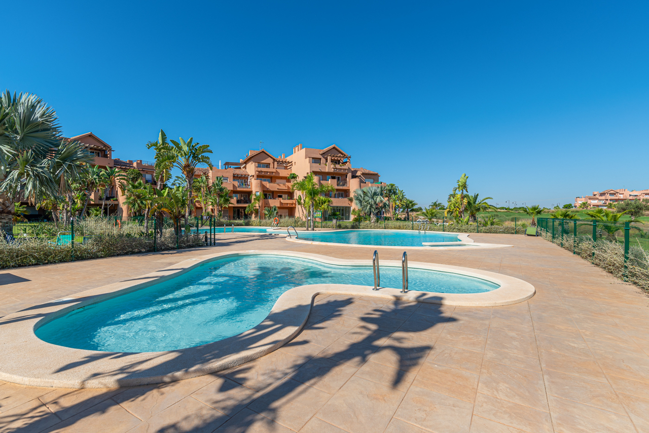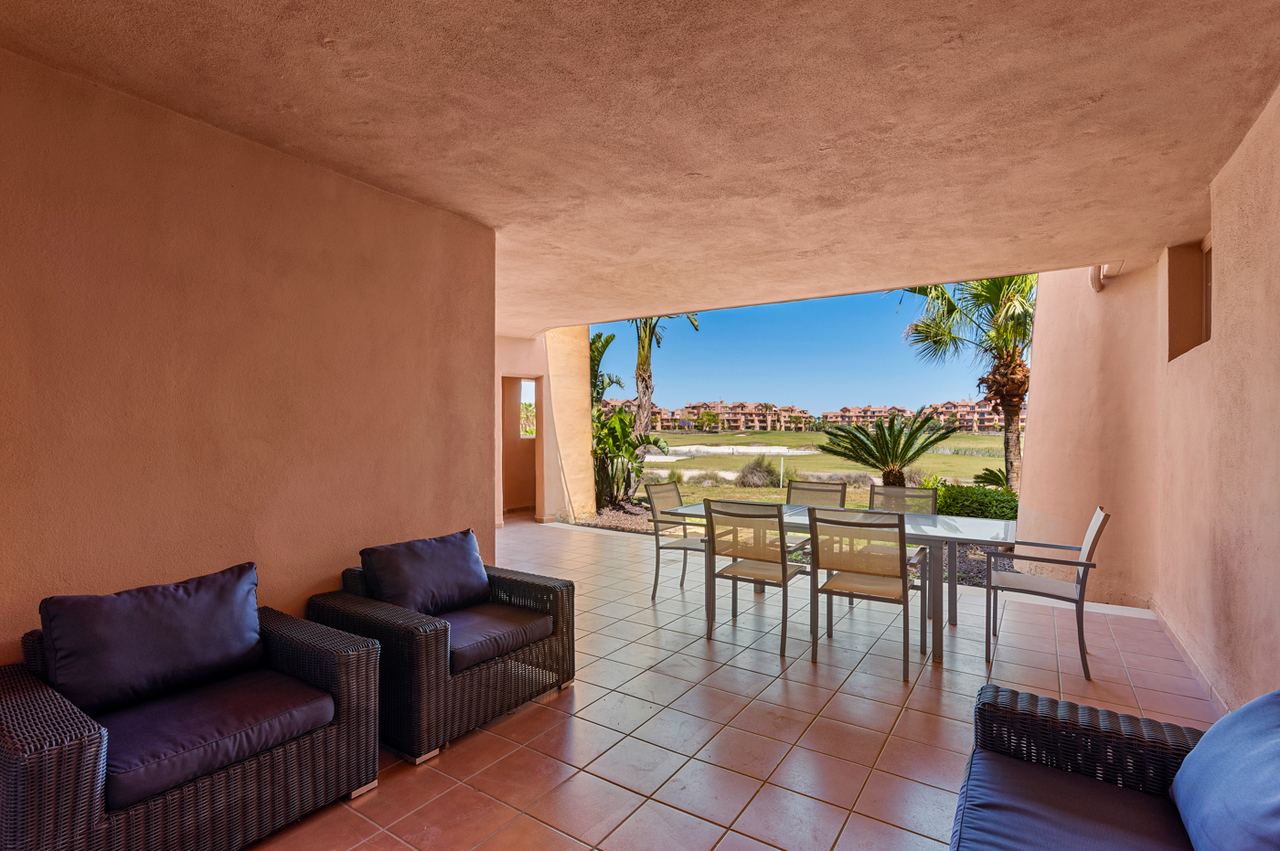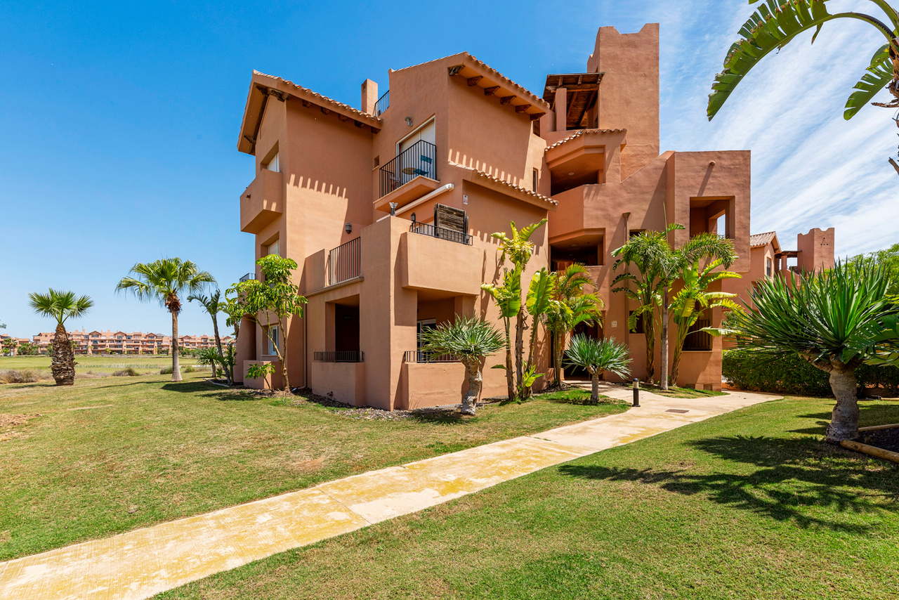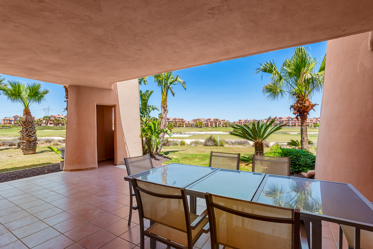 This ground floor apartment is located in an almost paradisiacal environment!A beautiful project on the Mar Menor Golf Resort in Murcia.There are several swimming pools, a restaurant, a golf course and beautifully landscaped gardens/terraces for free use.An underground parking space is included in the price.The layout of the apartment is as follows:Entrance with bright living room with access to the private terrace with open views of the grounds with beautifully landscaped gardens with golf and swimming facilities. A semi-open fully equipped kitchen, 2 bathrooms, 3 spacious bedrooms with fitted wardrobes and each with their terraces!Here you can completely relax!EXTREMELY CAREFUL AND CLEAN ENVIRONMENT! INSTANT HOLIDAY FEELS!FURNITURE INCLUDED IN THE PRICE! (excluding works of art and paintings)GREAT OPPORTUNITY!!!!!+/- €180/month common costs