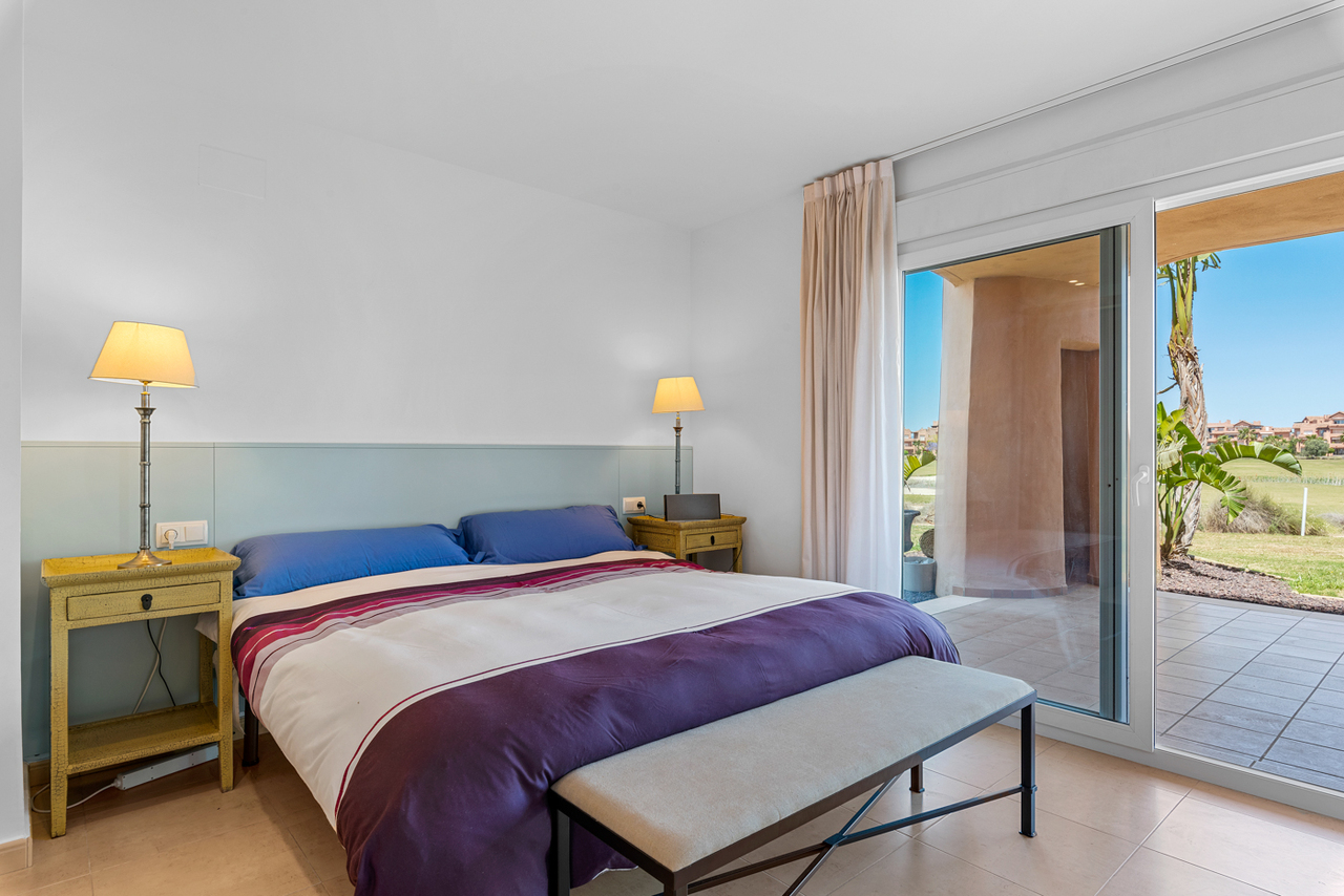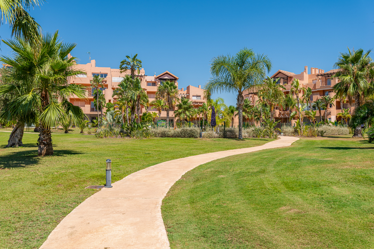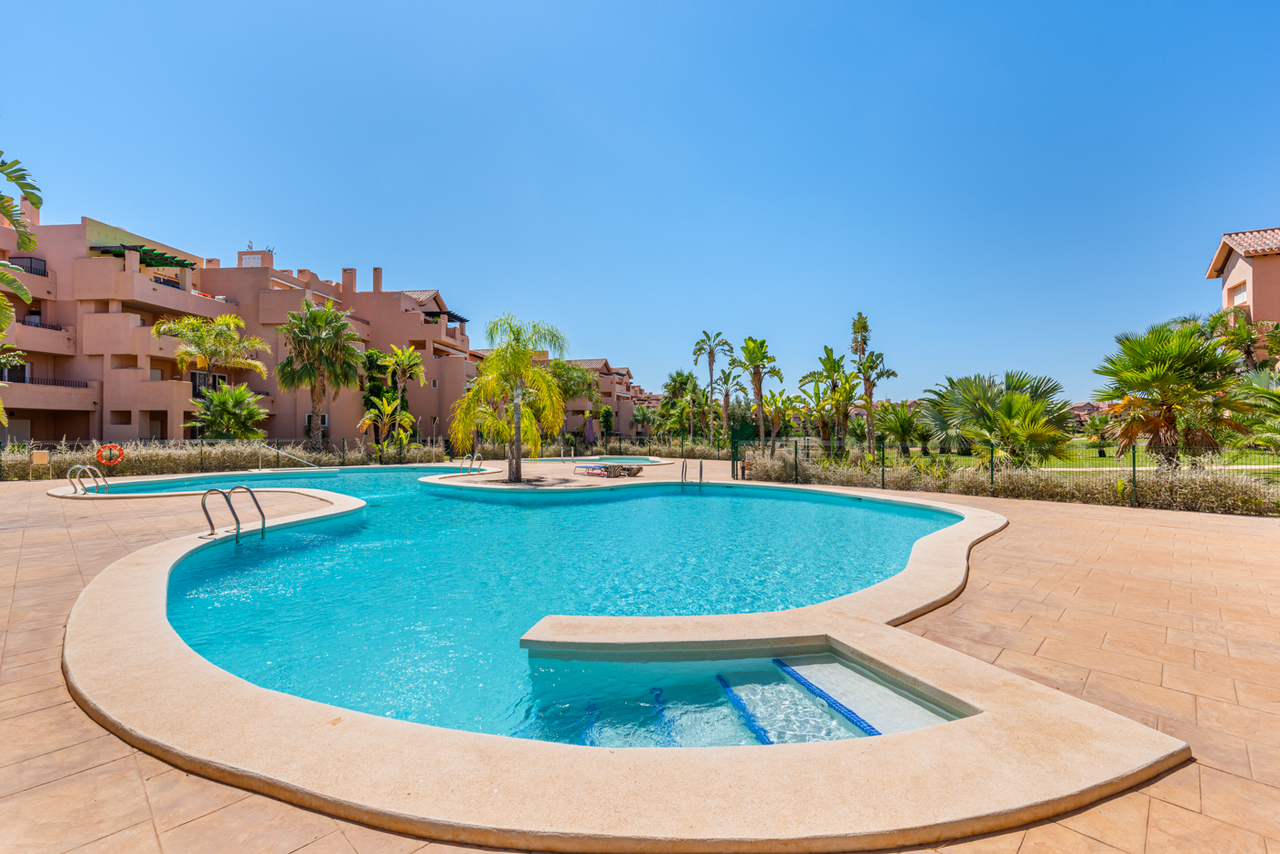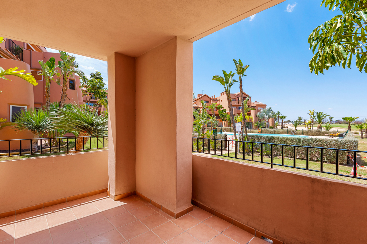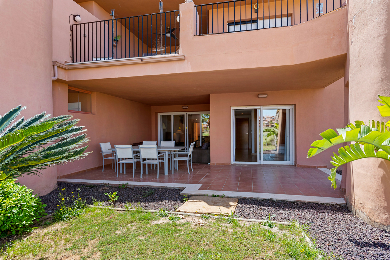 This ground floor apartment is located in an almost paradisiacal environment!A beautiful project on the Mar Menor Golf Resort in Murcia.There are several swimming pools, a restaurant, a golf course and beautifully landscaped gardens/terraces for free use.An underground parking space is included in the price.The layout of the apartment is as follows:Entrance with bright living room with access to the private terrace with open views of the grounds with beautifully landscaped gardens with golf and swimming facilities. A semi-open fully equipped kitchen, 2 bathrooms, 3 spacious bedrooms with fitted wardrobes and each with their terraces!Here you can completely relax!EXTREMELY CAREFUL AND CLEAN ENVIRONMENT! INSTANT HOLIDAY FEELS!FURNITURE INCLUDED IN THE PRICE! (excluding works of art and paintings)GREAT OPPORTUNITY!!!!!+/- €180/month common costs