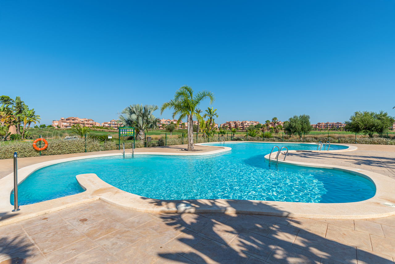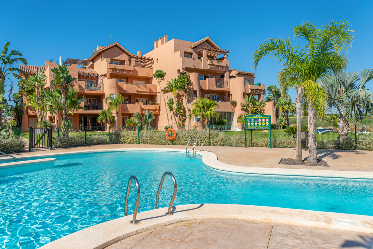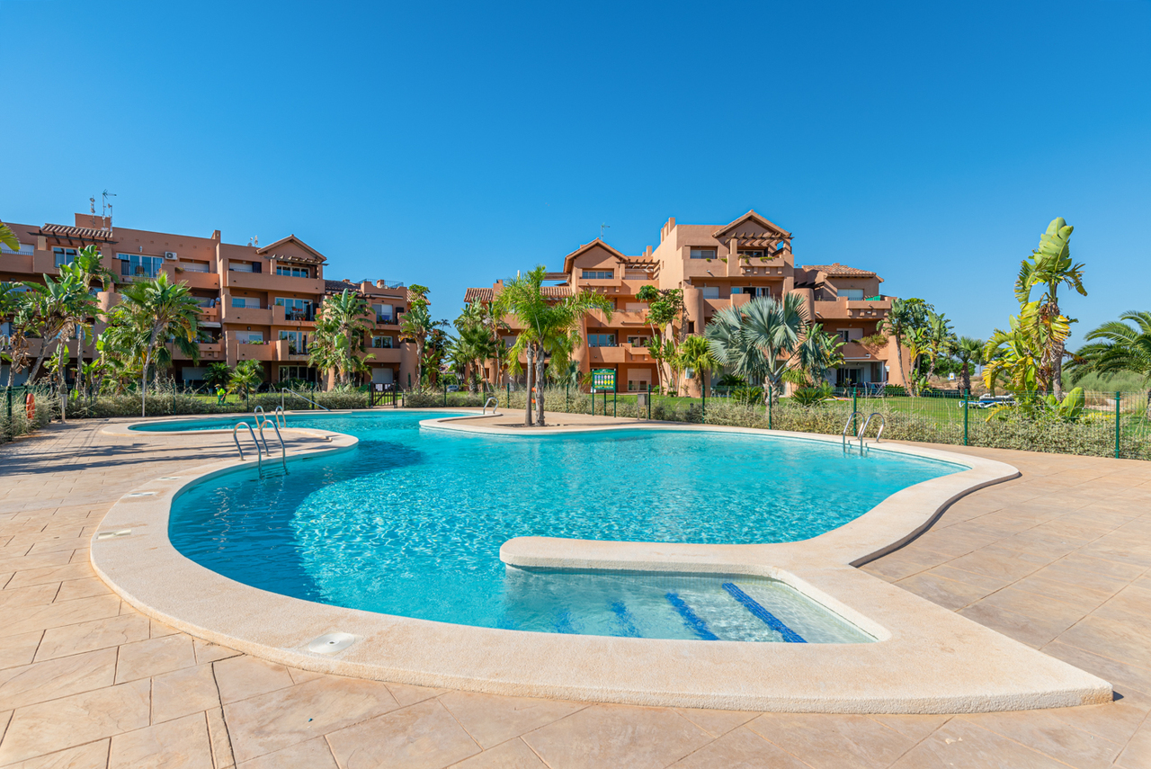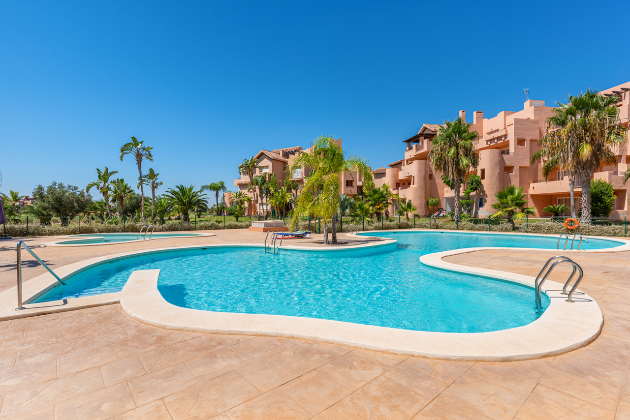 This ground floor apartment is located in an almost paradisiacal environment!A beautiful project on the Mar Menor Golf Resort in Murcia.There are several swimming pools, a restaurant, a golf course and beautifully landscaped gardens/terraces for free use.An underground parking space is included in the price.The layout of the apartment is as follows:Entrance with bright living room with access to the private terrace with open views of the grounds with beautifully landscaped gardens with golf and swimming facilities. A semi-open fully equipped kitchen, 2 bathrooms, 3 spacious bedrooms with fitted wardrobes and each with their terraces!Here you can completely relax!EXTREMELY CAREFUL AND CLEAN ENVIRONMENT! INSTANT HOLIDAY FEELS!FURNITURE INCLUDED IN THE PRICE! (excluding works of art and paintings)GREAT OPPORTUNITY!!!!!+/- €180/month common costs