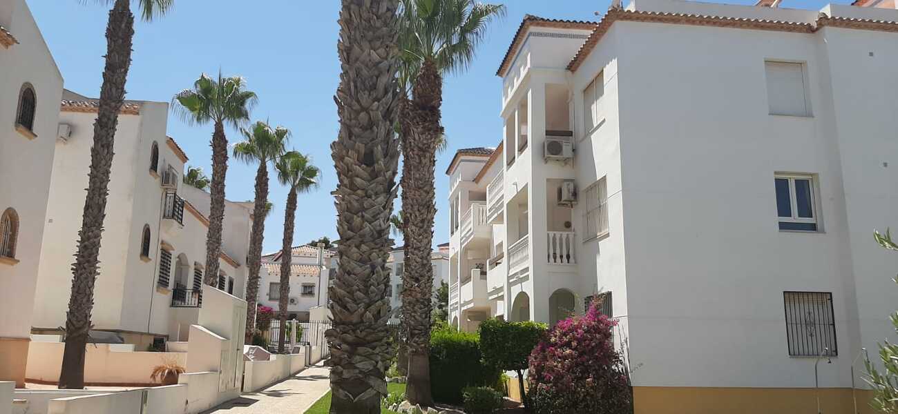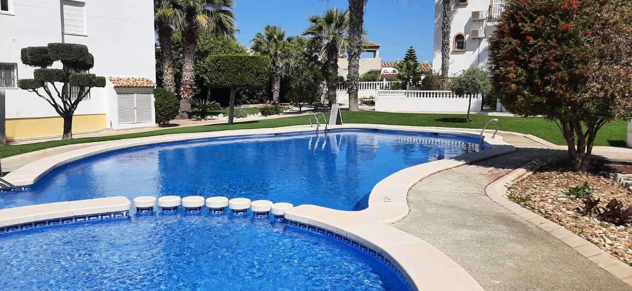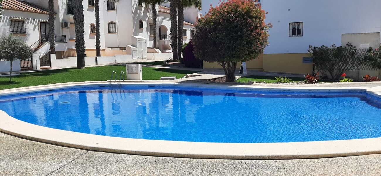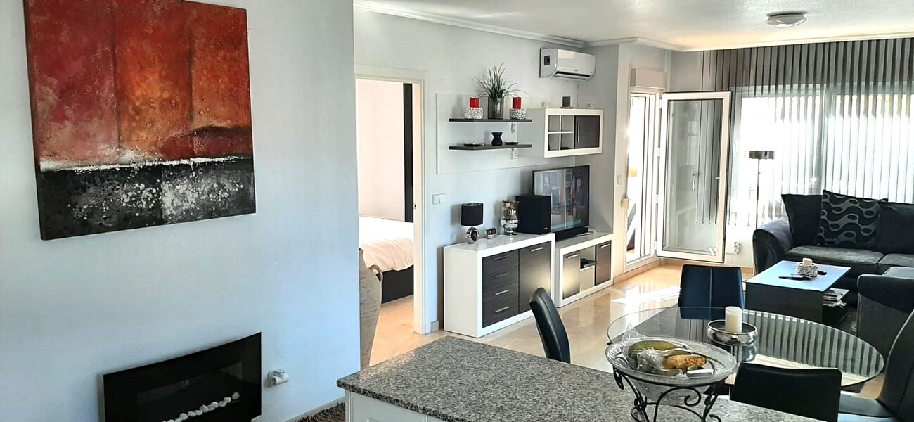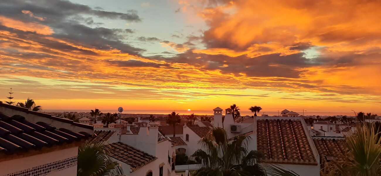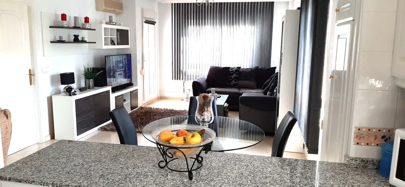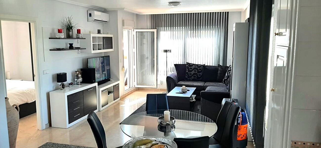Stunning Top Floor corner apartment situated on the popular urbanisation of Las Violetas. Offering views from the large lounge and terrace. Situated on a gated complex close to Villamartin plaza and all the local amenities and Villamartin golf course. This apartment offers a spacious open plan kitchen, leading to the beautifully furnished lounge and a covered terrace where you can sit and enjoy a cooling drink and tapas. Both bedrooms offer built in wardrobes with an en-suite on the master bedroom. There is a family bathroom with a bath and shower. There is a large communal rooftop solarium. A Fantastic apartment for holiday and winter sun with lift access.