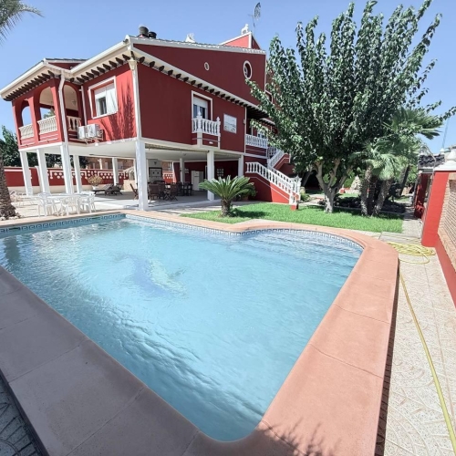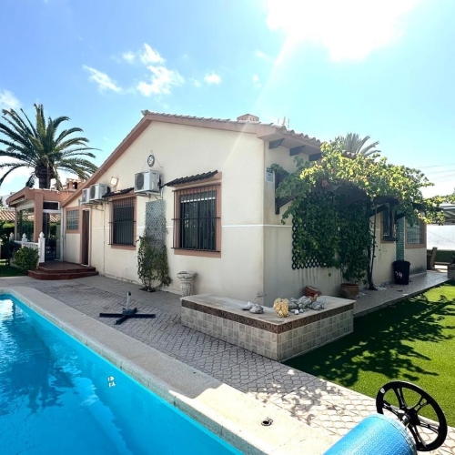 Completed in 2022, this fabulous 3 bed (potentially 5), 4 bath contemporary style new-build villa is the finest example of the Don Benito style villas, incorporating every conceivable ‘extra’ and the very highest specification.  Conveniently located in the El Galan urbanisation nr Villamartin and close to all amenities and numerous golf courses, it’s situated only a few minutes to both the Villamartin Plaza and La Fuente Commercial Centre as well as being less than a 7 minute drive from the fabulous La Zenia Boulevard and those amazing Costa Blanca beaches!Internally, this incredible property comprises two stories with an additional under-build and rooftop solarium, all of which benefit from hot/cold air conditioning.  On the ground floor you will find one of the three double bedrooms together with a full family bathroom including shower. There is a spacious open-plan kitchen and dining area incorporating a well appointed modern kitchen equipped with all of the modern facilities you would expect and giving access out to the covered utility and storage area which also houses a washing machine.  The lounge area enjoys full height, double-glazed sliding doors along the length of the external wall giving direct access out onto the sun drenched covered terrace area and large 6x3m private swimming pool.  Fully tiled and privacy screened, the outside area offers usable space around the entirety of the property and incorporates a useful utility area to the rear as well as a covered car parking space and driveway to the left of the villa.  This outside space is what Spanish living is all about – sunshine, socialising and relaxing with a fantastic pool (with outdoor shower) to take a dip in when the sunshine gets too much!Stairs lead to the first floor accommodation which features two double bedrooms both of which benefit from their own en-suite bathrooms, fitted wardrobes and retractable insect window screens.  The master bedroom also offers access via glazed sliding doors onto a private balcony – the perfect spot to enjoy your morning cafe au lait.  A second internal stairway leads to the amazing private rooftop solarium complete with aluminium pergola for shade, a BBQ area also complete with pergola and a handy shower area.  This privileged spot offers the perfect relaxation and entertaining space with views across the parkland – as well as guaranteeing the perfect year round sunbathing spot.In addition to the superb internal and outdoor living accommodation, this fantastic villa also benefits from an incredible 56 sqm under-build which was a built as part of the original construction as a developer ‘extra’.  This incredible space is fully finished and comes complete with a fully fitted bathroom.  Currently being used as a workshop and a music & cinema room, this space offers the flexibility to be used as additional self-contained guest accommodation and would easily provide two further bedrooms in addition to the existing three, potentially making this a five bedroom, four bathroom luxury home…….  Or you could just leave it as every husbands (and wife’s!) dream ‘Man Cave’!Location, quality and value combine to make this property a truly exceptional prospect for anyone seeking the ultimate villa with easy access to all that the Costa Blanca has to offer – walking distance to the best bars, restaurants and shopping and only a few minutes drive from the Mediterranean and  those golden beaches – what more could you want?The property comes part furnished with most items included as shown.