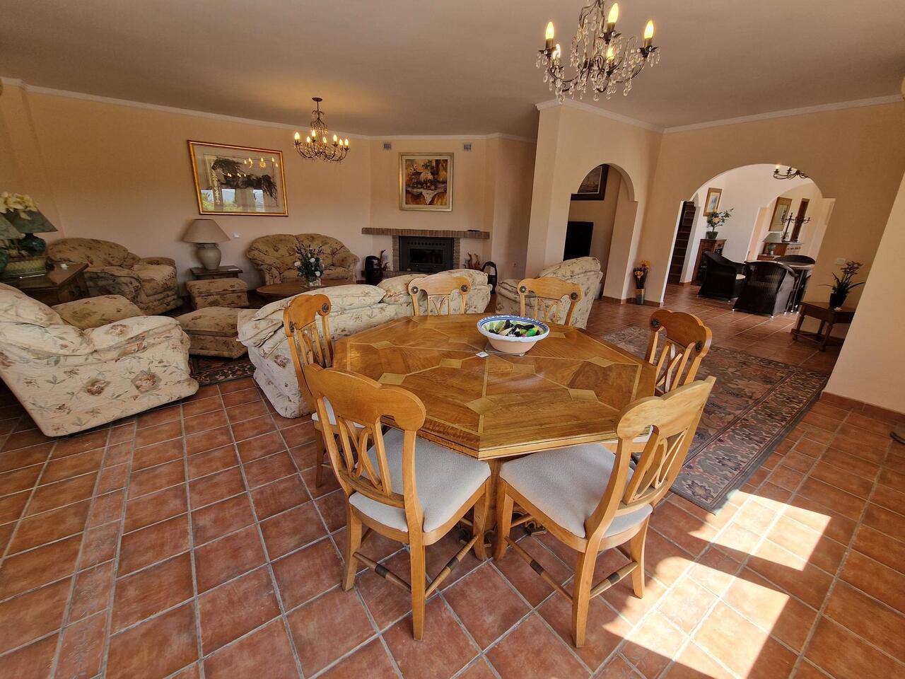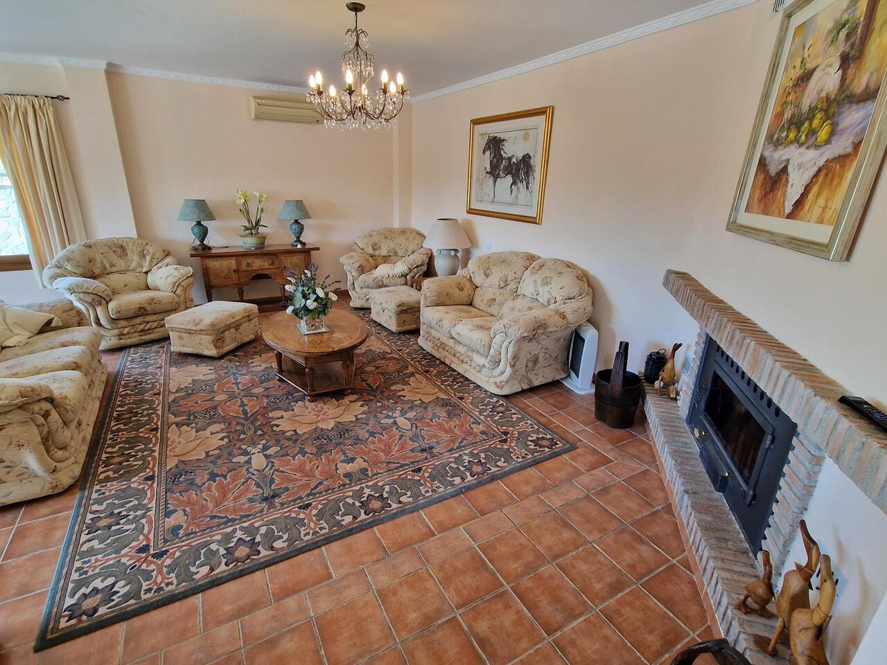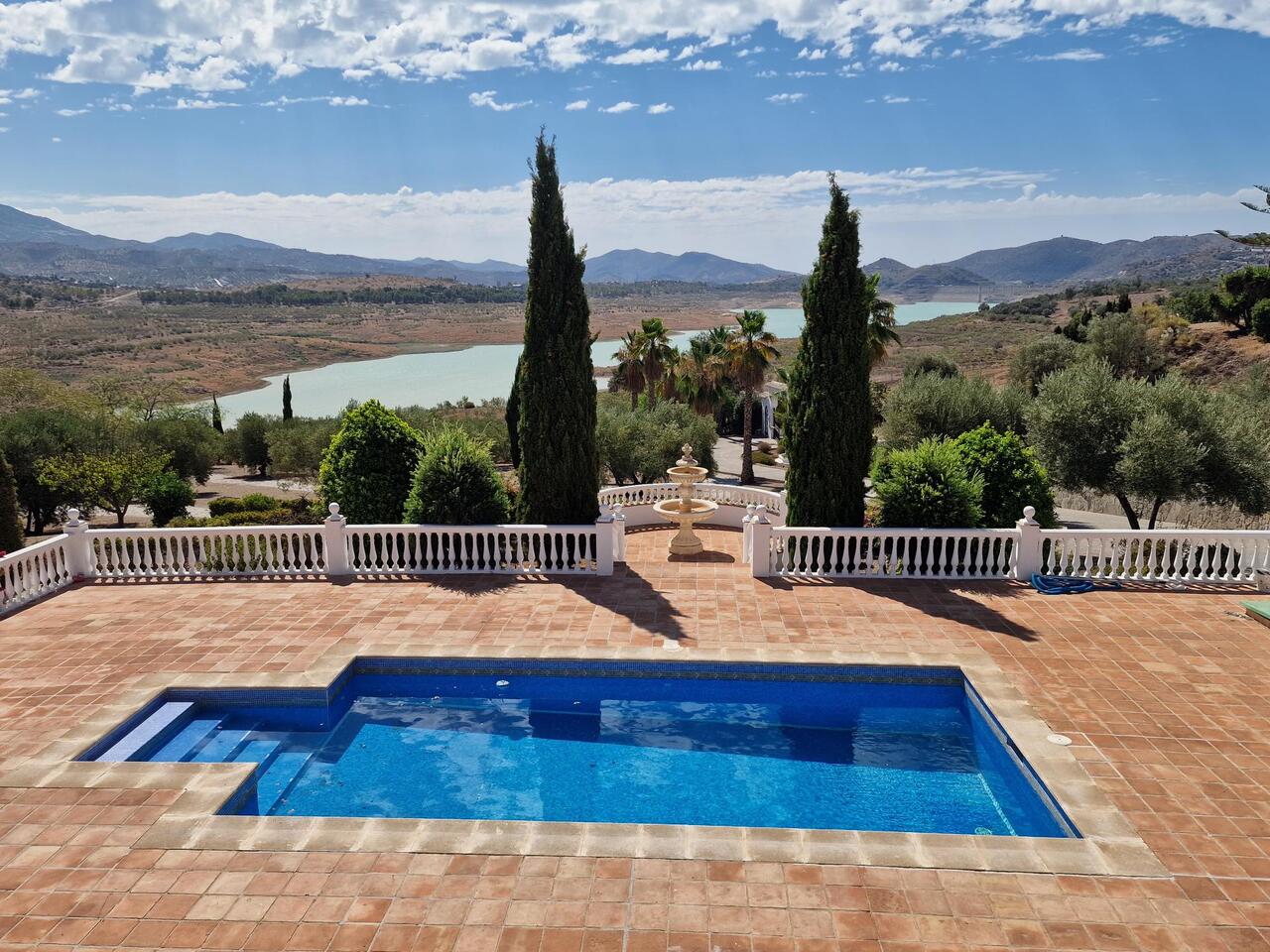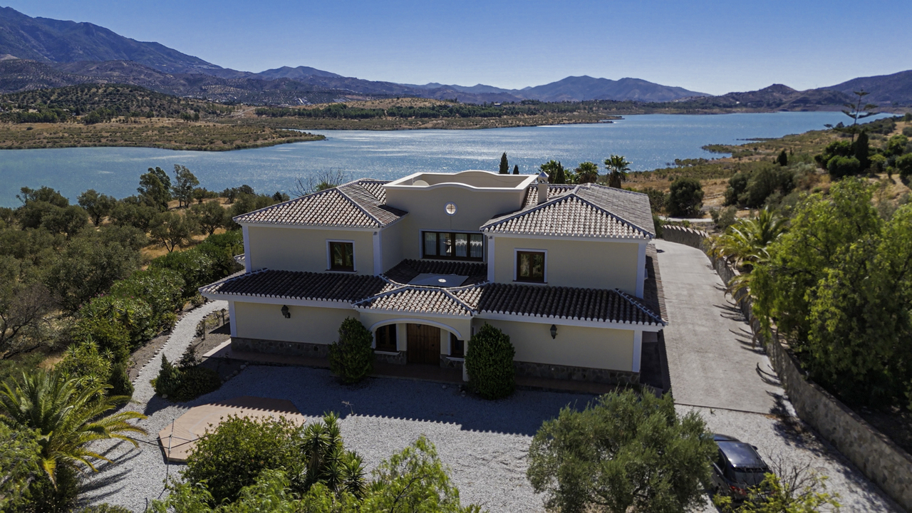 EXCLUSIVE - Cortijo Galvez is a large 2 storey, 5 bedroom, 6 bathroom property, in a prime location, situated very close to lake Vinuela. You can access the property via a partly concreted track. The entrance is very impressive with an electric gate and printed concrete driveway leading to the house. The plot is very secure and private with established gardens, trees and access down to the lake. To the front of the property there is a 10 metre swimming pool with a very large terrace around it, ideal for sun loungers and al fresco dining. The views from here are of the gardens, lake Vinuela and the surrounding mountains. There is a double garage with automatic door, a storage shed outside for outdoor furniture etc and the plot has been finished with pathways, balustrade with water fountain and a decorative sun ray  feature. On the first level there is an entrance hall/patio area that has access to the garage. The lounge and dining room are very big with a woondburner, AC and patio doors onto the outside terrace all of the windows and patio doors are quality upvc and double gazed with security glass. The kitchen has plenty of units, a granite work top, double oven and a separate utility room. One of the 5 ensuite bedrooms is on this level and the other four are on the 2nd level which is accessed via a staircase with wrought iron banister. At the top of the staircase is a landing with patio doors leading to a large terrace and an atrium with plants. All 5 bedrooms are large, with ensuite bathrooms and fitted wardrobes. This is an impressive, turn key opportunity for anyone wishing to secure one of the best front line lake view properties weve seen in 21 years!