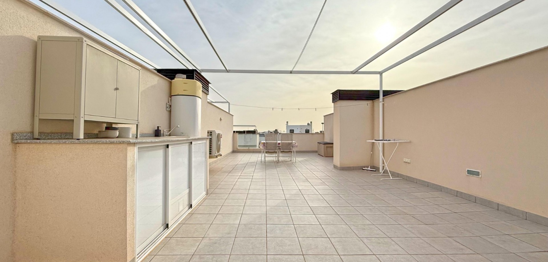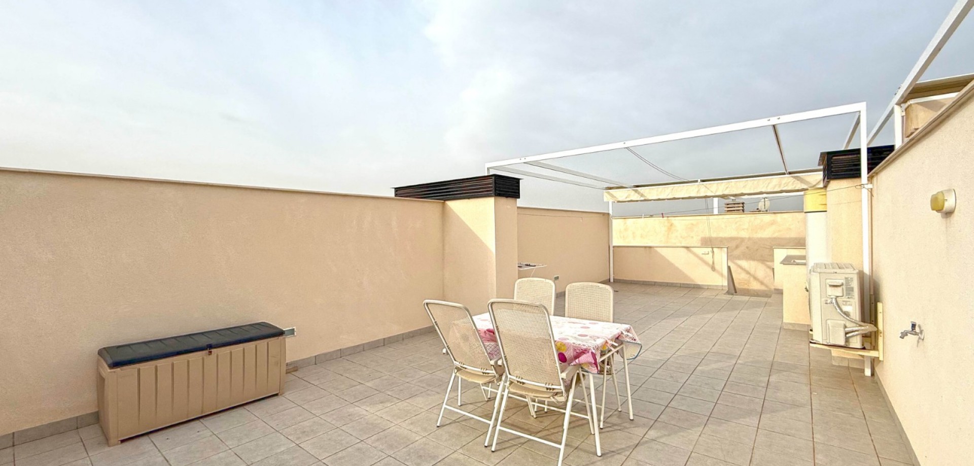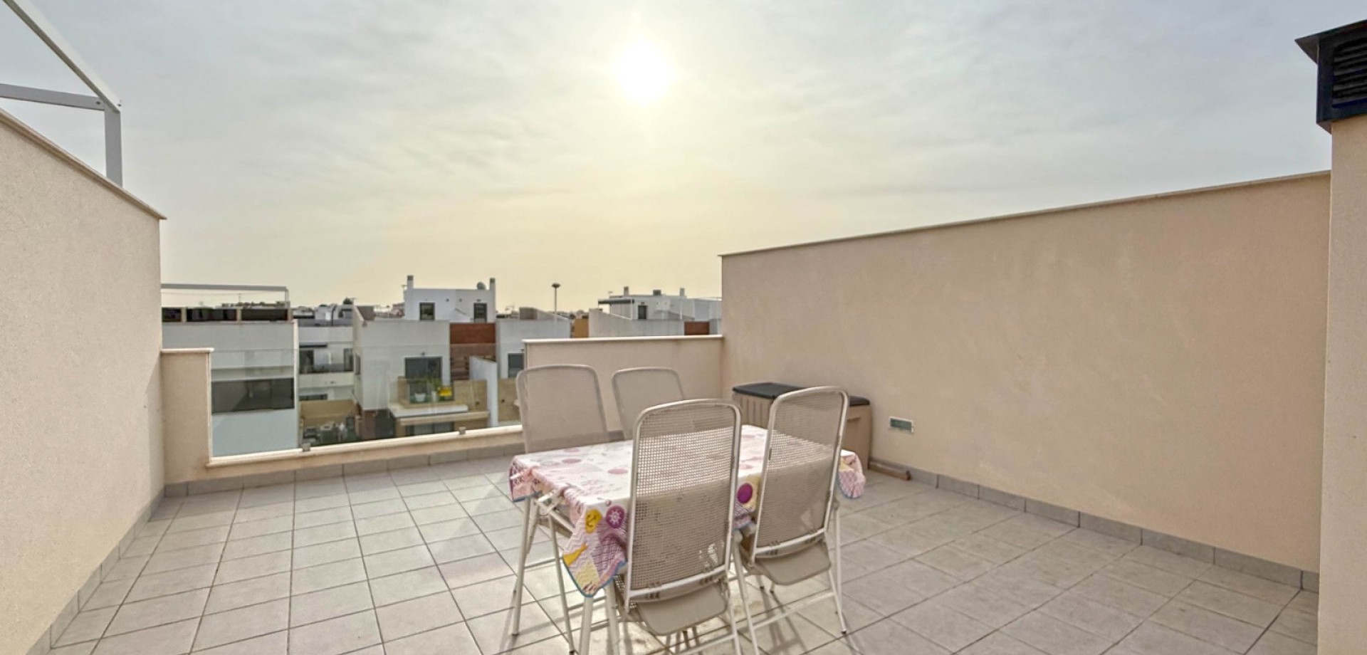 Discover this stunning, recently built top-floor apartment in the sought-after area of Lo Pagán, San Pedro del Pinatar. With its contemporary design and excellent location, this property is perfect for those seeking a stylish home close to the beach. Key Features: 2 Bedrooms & 2 Bathrooms: Includes a spacious master bedroom with an en-suite bathroom and a second bedroom ideal for guests or family. Both bathrooms are finished to a high standard with modern fittings.Private Outdoor Spaces: Enjoy your morning coffee on the sunny balcony or entertain friends on your expansive private roof terrace, perfect for relaxing under the Mediterranean sun.Fully Furnished: The apartment comes tastefully furnished, so you can move in and start enjoying your new home right away.Communal Heated Pool: Take a dip year-round in the beautifully maintained communal heated pool, surrounded by lush landscaping.Prime Location: Situated within walking distance to the pristine beaches of Lo Pagán and close to local amenities, restaurants, and shops. This property offers the ideal blend of comfort and convenience, perfect as a holiday retreat or a permanent home. Don’t miss this opportunity to live the coastal dream!
