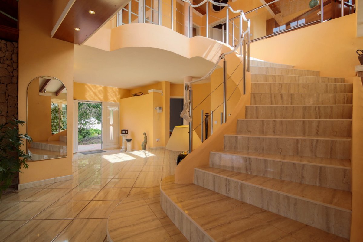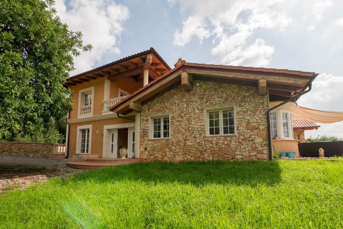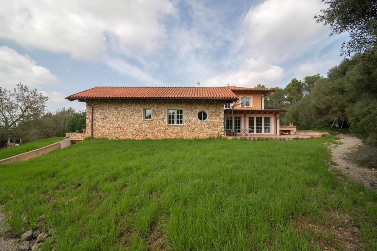 We present a charming house located on an extensive rustic property in Montuiri, surrounded by the serenity and natural beauty of the typical almond and carob trees of the island. This property is distinguished by its tranquility, with almost no close neighbors, and offers a perfect refuge for those seeking privacy and contact with nature.. . The ground floor is distributed in a large entrance hall with a semicircular staircase with a stainless steel railing, which connects the three floors, a large living room with a biomass fireplace and direct access to a large terrace, a large open kitchen with a pantry, a large dining room with direct access to another terrace, two double bedrooms with built-in wardrobes and two complete bathrooms with walk-in showers and bathtubs, one of them en suite. One of the bedrooms has direct access to one of the terraces.. . The upper floor is distributed in an open area used as an office, a double bedroom with a built-in wardrobe and a large bathroom with shower and bathtub and a covered terrace. On the semi-basement floor, it is distributed in a double bedroom with a built-in wardrobe, a storage room with the facilities prepared to convert into a toilet, a large garage with space for 1 vehicle, a laundry room and a machine room for heating.. . Outside the house there is a large swimming pool surrounded by terraces with a covered summer kitchen with toilets and storage room, there are also several sheds used as storage rooms and an artificial pond. The house is equipped with PVC double-glazed security windows, alarm, air conditioning and underfloor heat pump, heating with biomass fireplace, water softener, vacation rental license and is sold fully furnished and ready to move into. to live.. . The property has a water well, but the electricity is through a solar panel system.. . This property in Montuiri is a unique opportunity to acquire a house that combines modern comfort with rustic charm, offering a relaxed and sustainable lifestyle. Perfect both as a permanent residence and as a vacation rental investment, this estate is ready to welcome its new owners and offer them an oasis of peace and natural beauty.