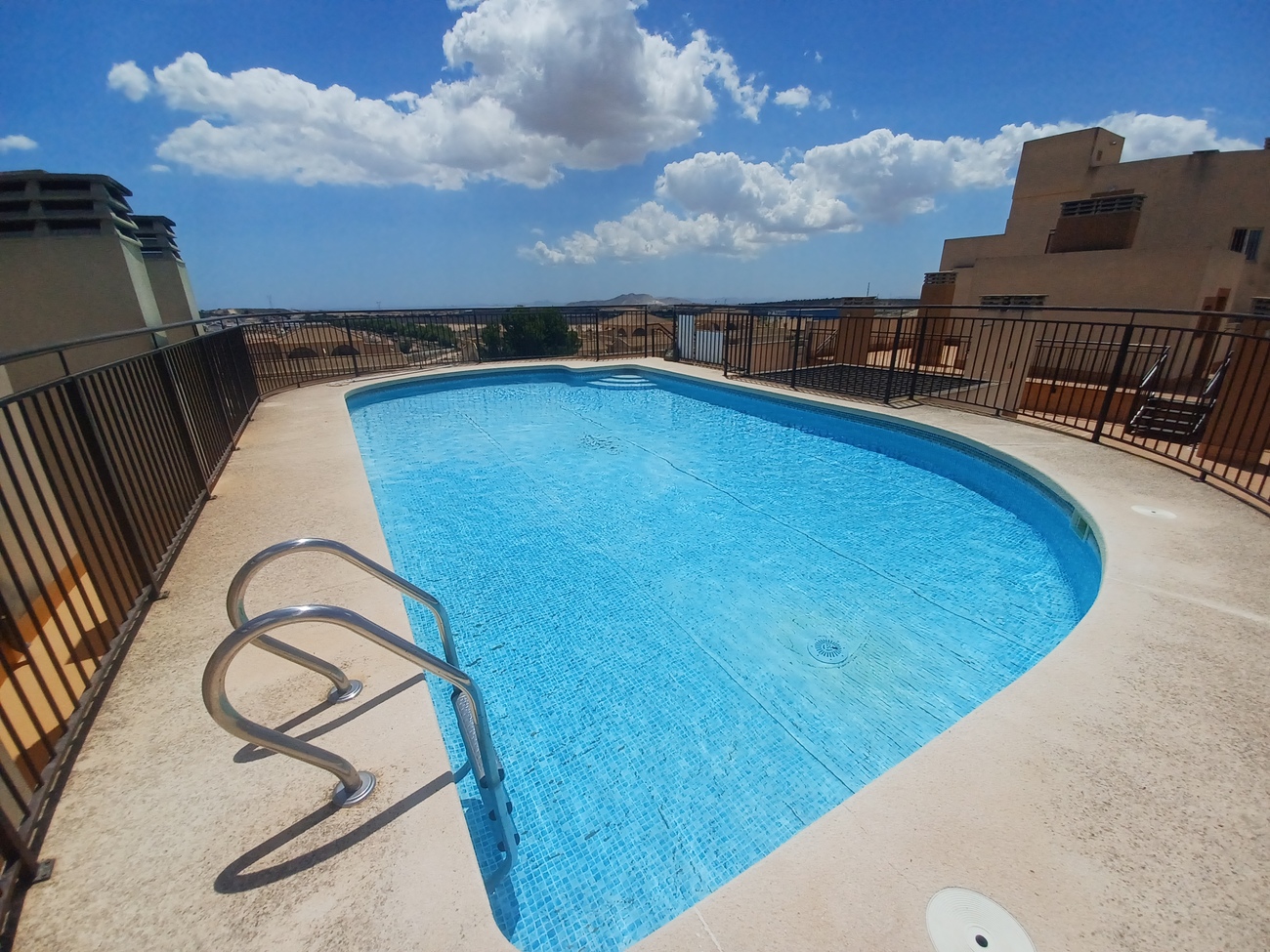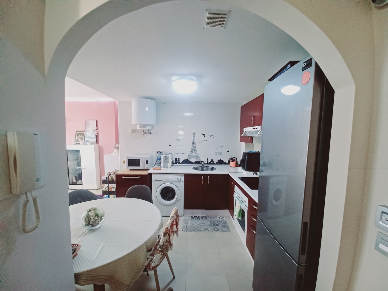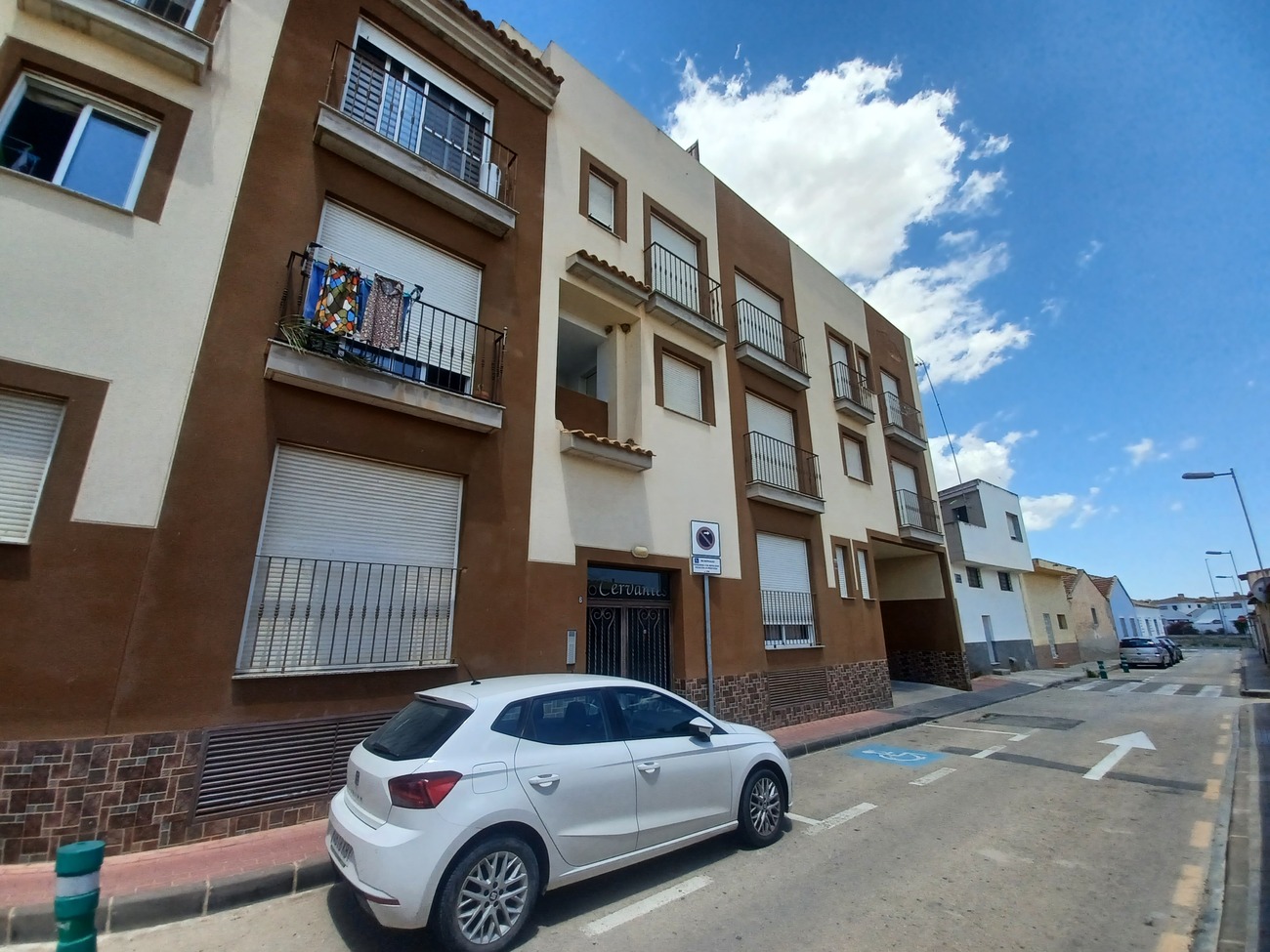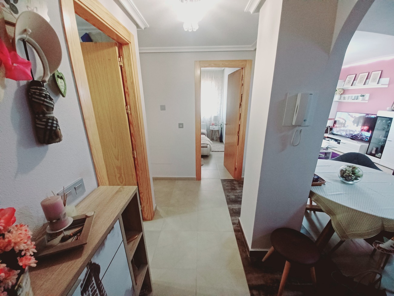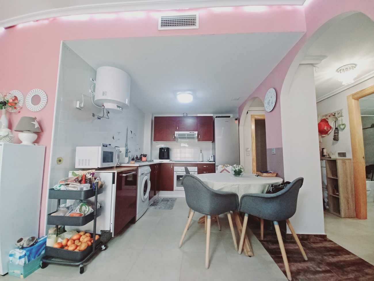 This modern apartment in Sucina really has it all for quality living; it is spacious with high qualities throughout and it is sold furnished.  The apartment is located on the ground floor with plenty of windows and natural light and off street parking outside the living room.  The apartment enters into a hallway which leads to open plan modern kitchen with quality wood finish  fitted kitchen with cream worktop with high quality electro-domestic, oven, hob, canopy dishwasher and washing machine included in the the sale.  The living room is furnished with L shaped sofa, coffee table, storage unit, dining table and chairs, the floor is light ceramic tiles  The hallway leads to the bathroom  tiled from floor to ceiling with bath tub/shower, vanity unit and WC.  There are two double bedrooms; the main bedroom has a double bed,bedside cabinets, drawer unit, fitted wardrobes and quality lighting.  The second bedroom  is furnished with ´sleigh´style bed´and fitted wardrobes;  Furniture and high quality light fittings are all included in the sale.  The apartment comes with full integrated air conditioning (hot and cold)  and underground storage unit set in a well maintained building with secure entrance and a lift.  There is a roof terrace with swimming pool and sunbathing terrace with panoramic views.  The village of Sucina has all amenities, live entertainment and just a short drive to the coast and to the airport.