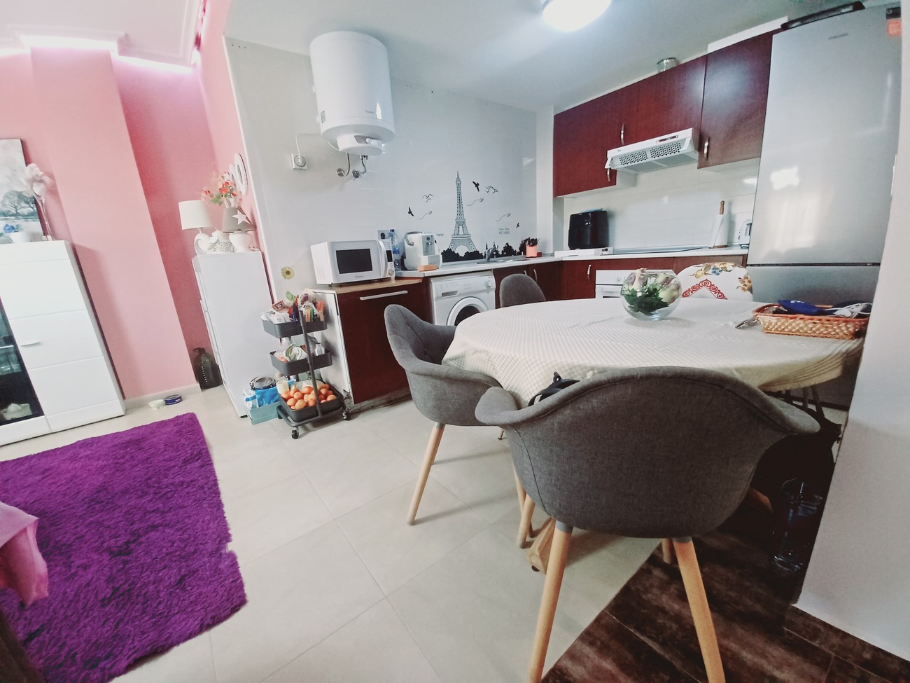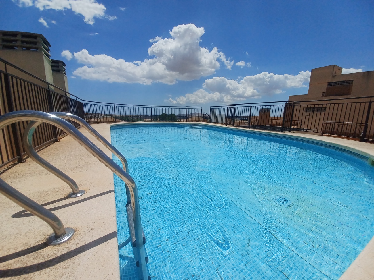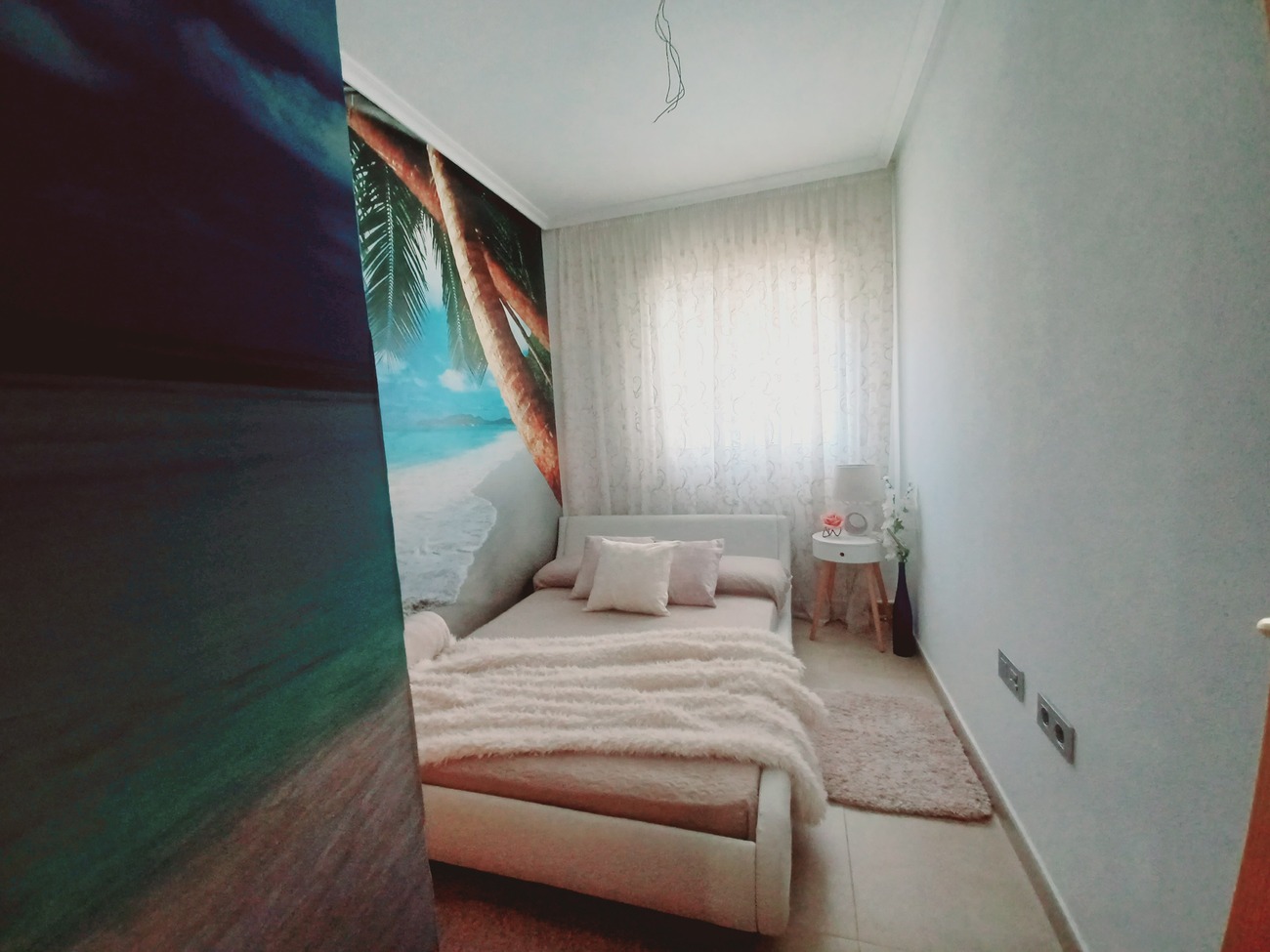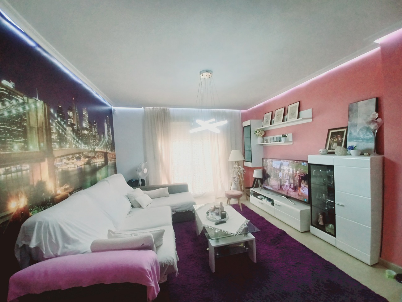 This modern apartment in Sucina really has it all for quality living; it is spacious with high qualities throughout and it is sold furnished.  The apartment is located on the ground floor with plenty of windows and natural light and off street parking outside the living room.  The apartment enters into a hallway which leads to open plan modern kitchen with quality wood finish  fitted kitchen with cream worktop with high quality electro-domestic, oven, hob, canopy dishwasher and washing machine included in the the sale.  The living room is furnished with L shaped sofa, coffee table, storage unit, dining table and chairs, the floor is light ceramic tiles  The hallway leads to the bathroom  tiled from floor to ceiling with bath tub/shower, vanity unit and WC.  There are two double bedrooms; the main bedroom has a double bed,bedside cabinets, drawer unit, fitted wardrobes and quality lighting.  The second bedroom  is furnished with ´sleigh´style bed´and fitted wardrobes;  Furniture and high quality light fittings are all included in the sale.  The apartment comes with full integrated air conditioning (hot and cold)  and underground storage unit set in a well maintained building with secure entrance and a lift.  There is a roof terrace with swimming pool and sunbathing terrace with panoramic views.  The village of Sucina has all amenities, live entertainment and just a short drive to the coast and to the airport.