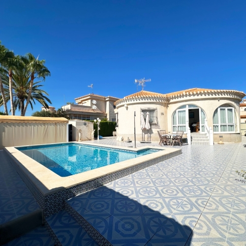 We are proud to present this exceptional 5-bedroom, 3-bathroom detached villa, beautifully situated on the prestigious Las Ramblas Golf Course. Set on a generous 500 m² plot, this property offers a perfect blend of luxury, comfort, and Mediterranean charm. This southwest-facing villa enjoys all-day sunshine and boasts a private swimming pool surrounded by spacious outdoor areas and a low-maintenance garden—ideal for relaxing or entertaining guests. Upon entering the property, you're welcomed into a bright, open-plan living area filled with natural light from large windows. Just off the main living space is a versatile room currently used as a dining area, along with two additional double bedrooms, a fully fitted separate kitchen, and a modern family bathroom. The upper floor features an impressive master suite with ample wardrobe space, a private en-suite bathroom, and large patio doors leading out to a stunning rooftop solarium with panoramic views over the 18th fairway of the golf course. A separate underbuild provides additional accommodation with its own entrance, comprising a spacious bedroom and bathroom—perfect for guests or rental potential. Located just a 5-minute walk from the popular La Fuente Commercial Centre, you'll find a wide selection of bars, restaurants, supermarkets, and amenities all within easy reach. Whether you're looking for a full-time residence, a holiday retreat, or an investment opportunity, this villa ticks all the boxes. This property is a must-see! Contact us today to arrange your private viewing.