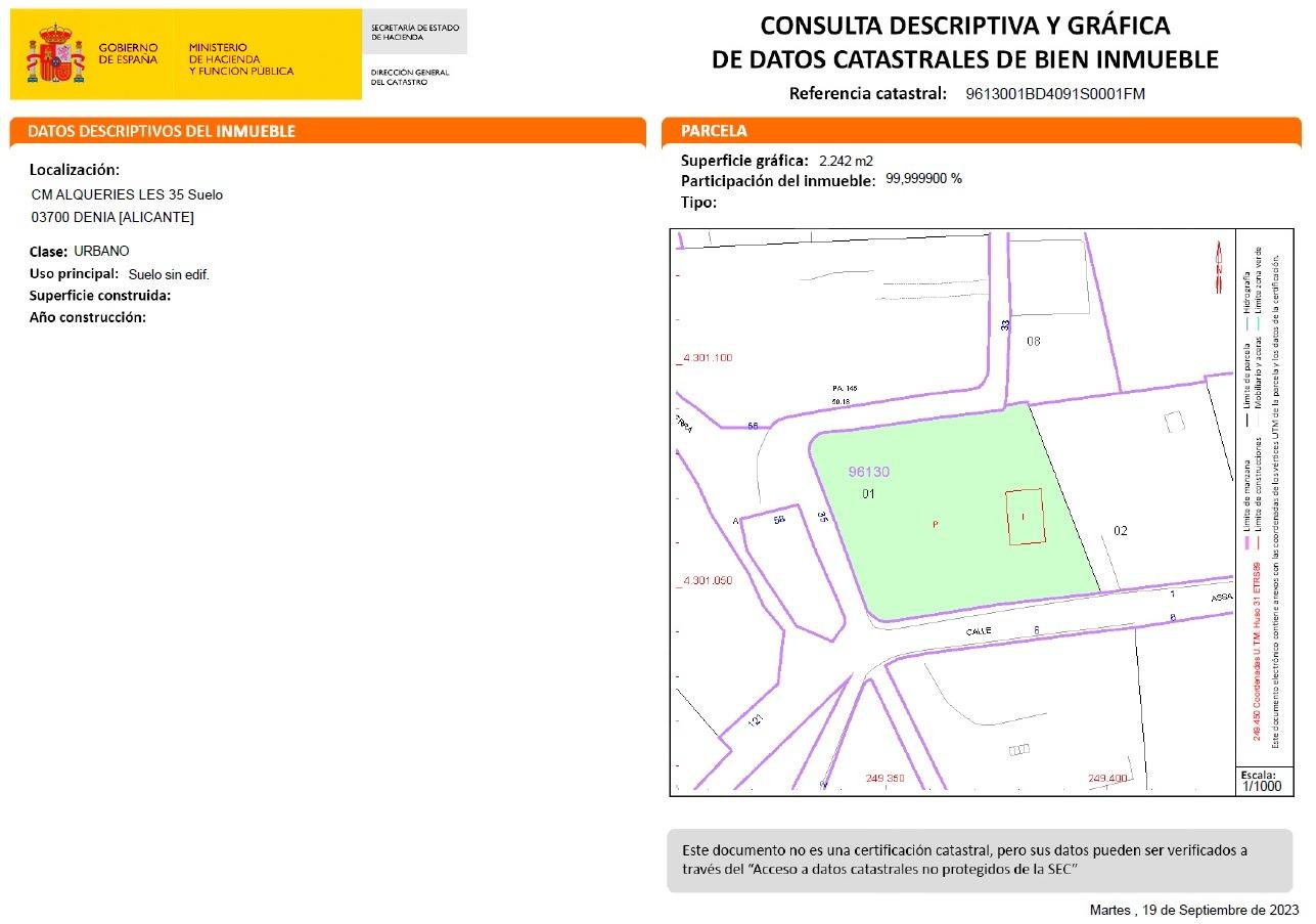 URBAN PLOT IN DENIA Urban plot in Denia of 2.242 m2 with frontage to 3 streets and fenced with stone wall. The plot is on a slight slope (which will allow all the houses to be built to have views) and enjoys wonderful views of the sea and the Montgó. It has an approximate buildable area of 440 m2, so it would be possible to build 4 independent villas of 110m2+basement on plots of 500m2 or 6 semi-independent villas of 75m2+basement on plots of 350 m2. The plot is located about 2km from the beach and town centre and 1km from supermarkets and restaurants. Denia is currently in high demand for new build properties as it is a destination that combines an excellent gastronomic offer, the Montgó natural park with hiking trails, the nature reserve of Las Rotas for snorkelling and the kilometres of fine sandy beaches of Las Marinas. All this combined with a wonderful mild Mediterranean climate in a city with a year-round atmosphere makes this destination gain points every year.