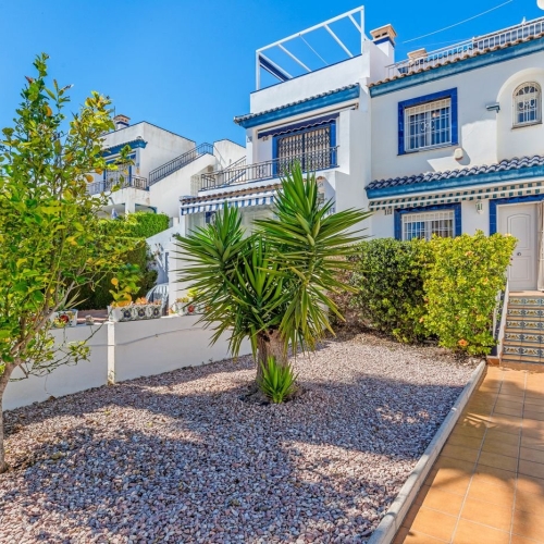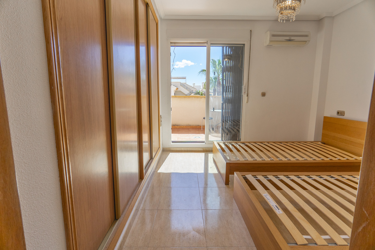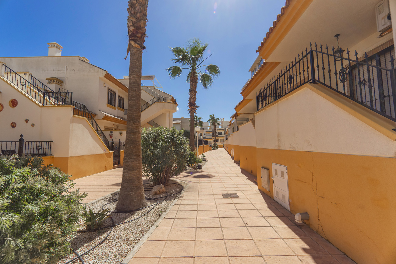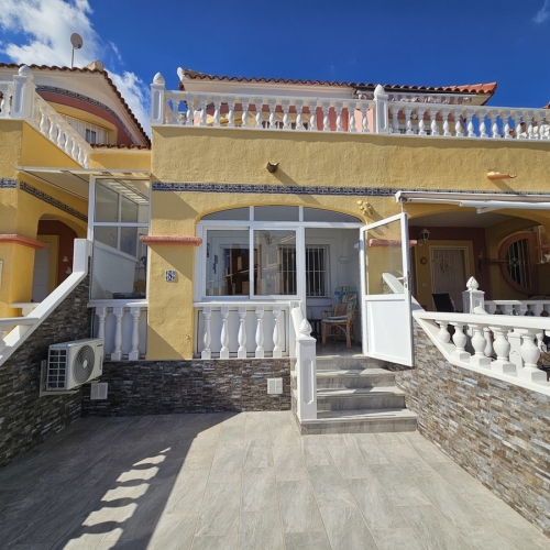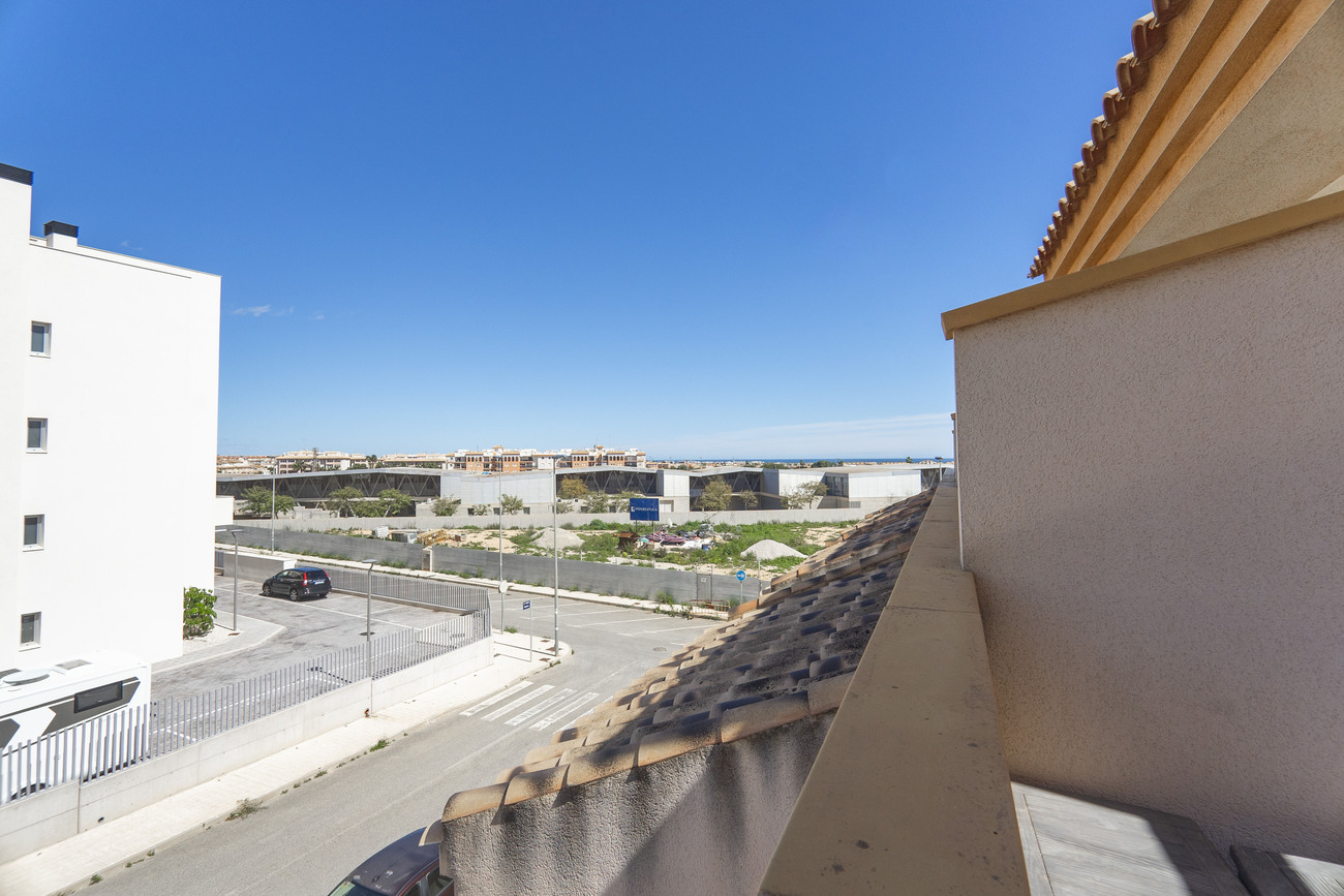 Beautiful Townhouse in Prime Playa Flamenca Location This charming partly furnished townhouse is the perfect blank canvas to create your dream home. Ideally situated in the heart of Playa Flamenca, it offers convenience, comfort, and an unbeatable location just steps from the local school. There is a large patio with a built in BBQ at the front of the house. The ground floor features a bright and spacious living and dining area, a separate kitchen leading to a private terrace with direct access to a large communal pool, a comfortable bedroom, and a bathroom. On the first floor, you'll find two additional bedrooms and a second bathroom, with the master bedroom opening onto a private terrace. The top level boasts a stunning solarium, offering front and back views, perfect for enjoying the sun all day long. Located just 7 minutes from the beach and 5 minutes from La Zenia Boulevard, this home is also surrounded by bars, restaurants, and amenities, ensuring everything you need is within easy reach.