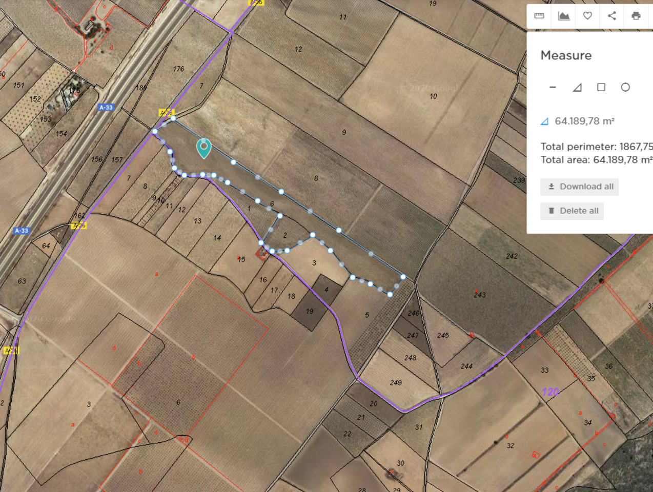Building plot of land in Yecla, it has a main road frontage onto the A26 about 1km from its first junction from Yecla with the A33. This plot is just over 55,000m2, agricultural water is available but not connected and mains electricity is a few meters away which will need to be connected. Solar Panels would be ideal for this plot for those who want to be off-grid and energy-efficient.  This plot and size of the land are ideal if someone wanted their stables, etc., and it is surrounded by many tracks ideal for hacking.