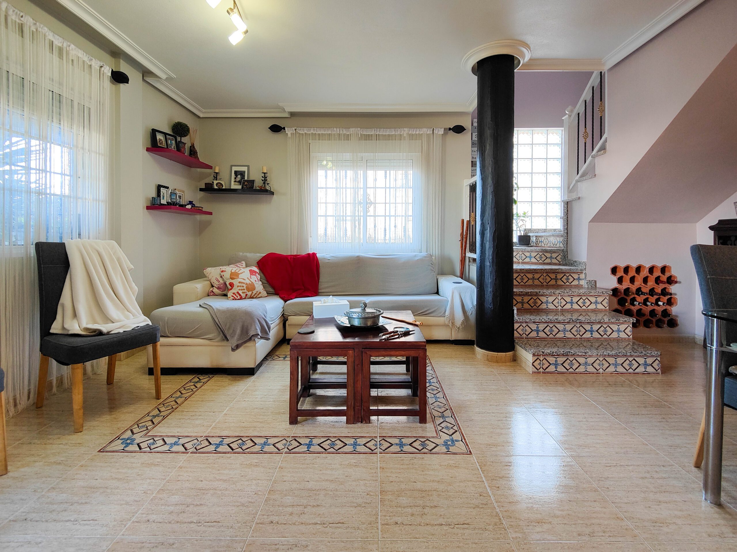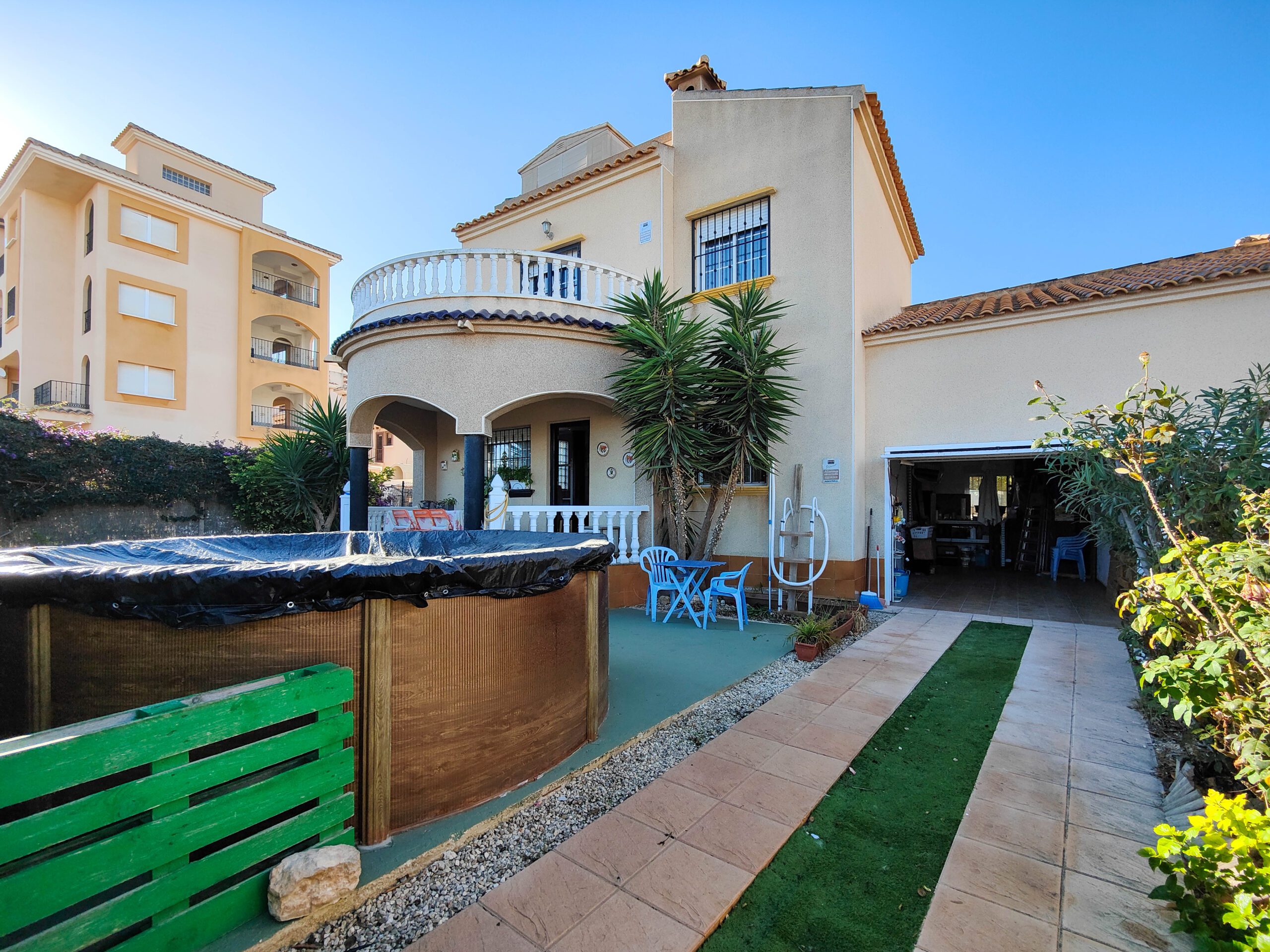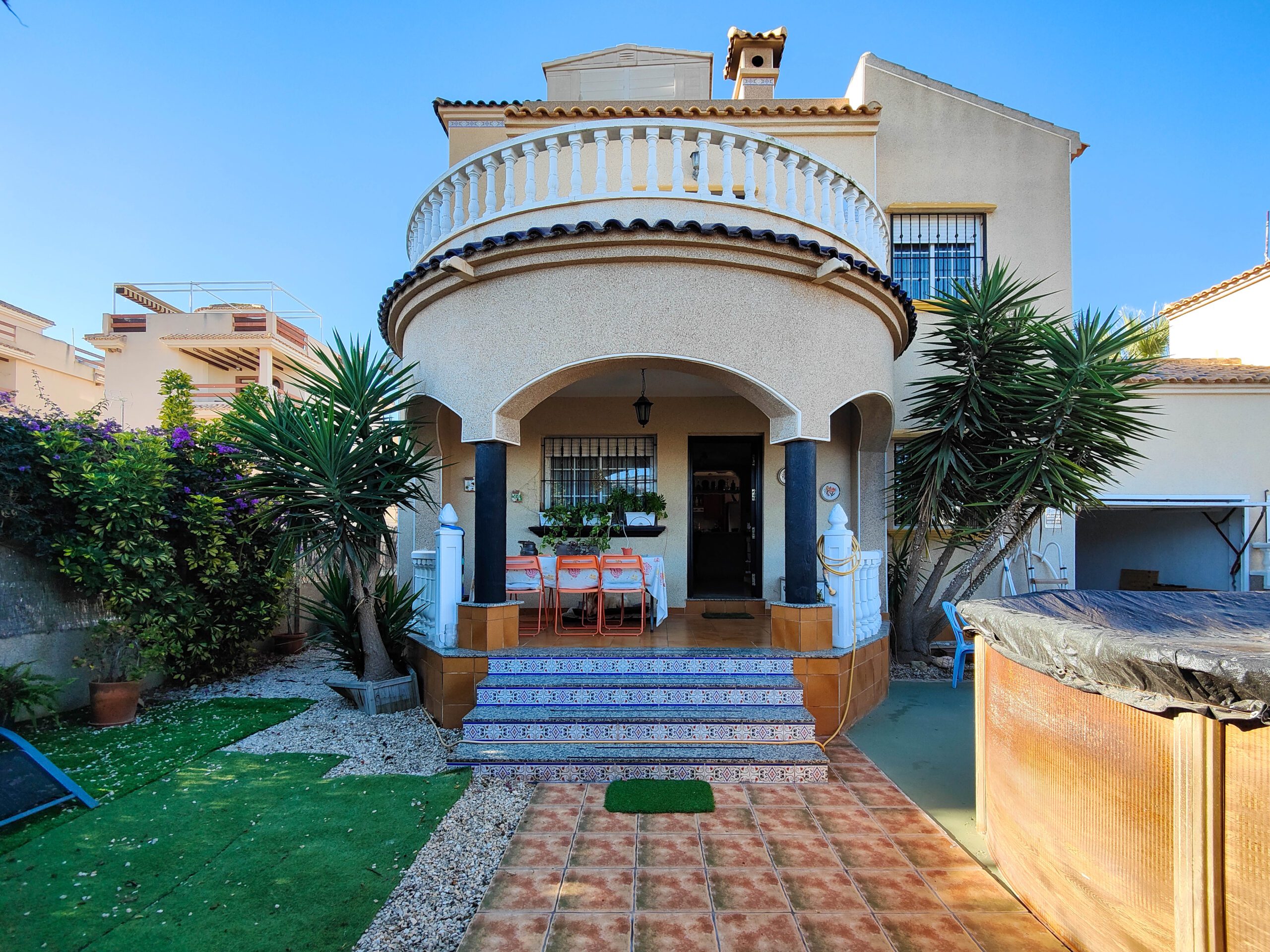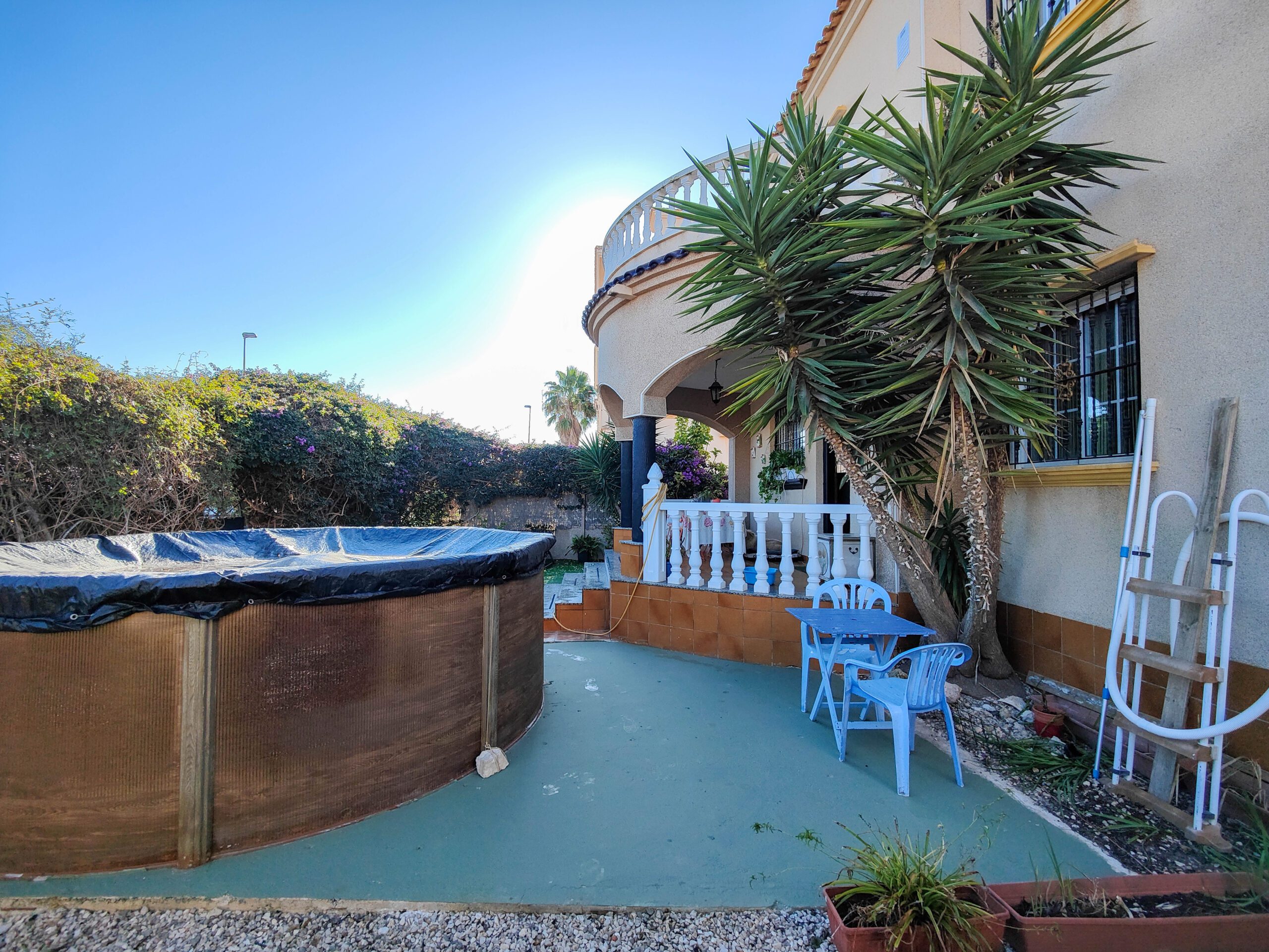 Detached mediterranean corner villa with a closed garage for sale in Villamartin - Orihuela Costa. This villa bellongs to a very small community without community fees. Just a short drive away from the Aldi supermarket, several shopping/comercial centers and the beaches of Orihuela Costa and Torrevieja.This well kept detached villa offers 3 bedrooms and 2 bathrooms distributed as follows:On the ground floor there is 1 bedroom with fitted wardrobes, 1 bathroom with walkin shower, a semi independent kitchen, a storage/laundry area and a spacious living area with a fireplace.On the first floor we find 2 bedrooms, both with fitted wardrobes and one of them with a private balcony, 1 bathroom with a bathtub and a south facing terrace. From this terrace we can access the roofterrace where there are 2 storage rooms.Outside, to the front of the property, there is off road parking, a closed garage, a private swimming pool, a covered terrace and several sitting areas. At the back of the property, which is south facing, there is a sunny tiled garden with direct access to the kitchen.This amazing villa is sold partially furnished. Do not miss the chance to buy this beautiful detached mediterranean villa with a closed garage for sale in Villamartin - Orihuela Costa!
