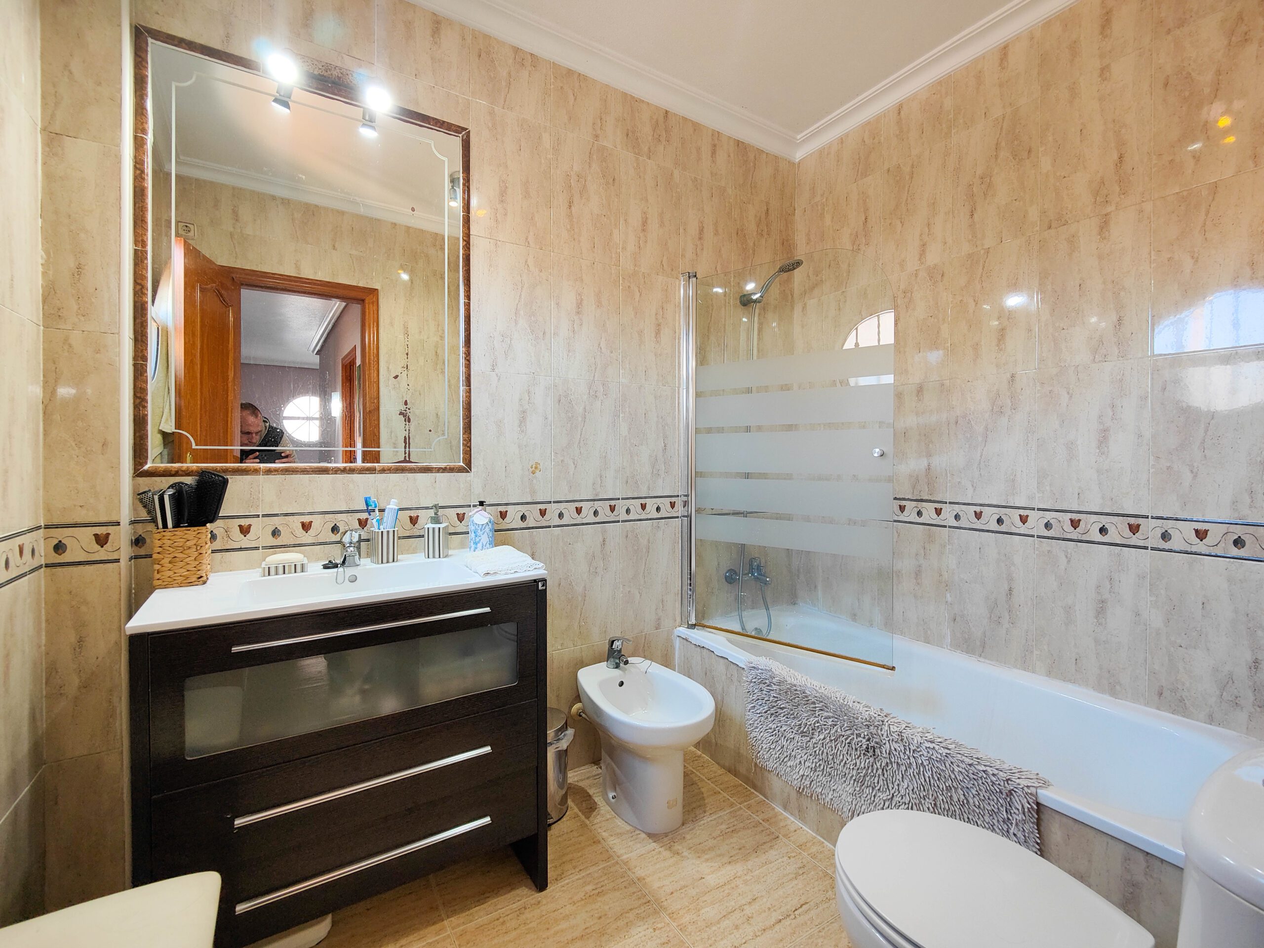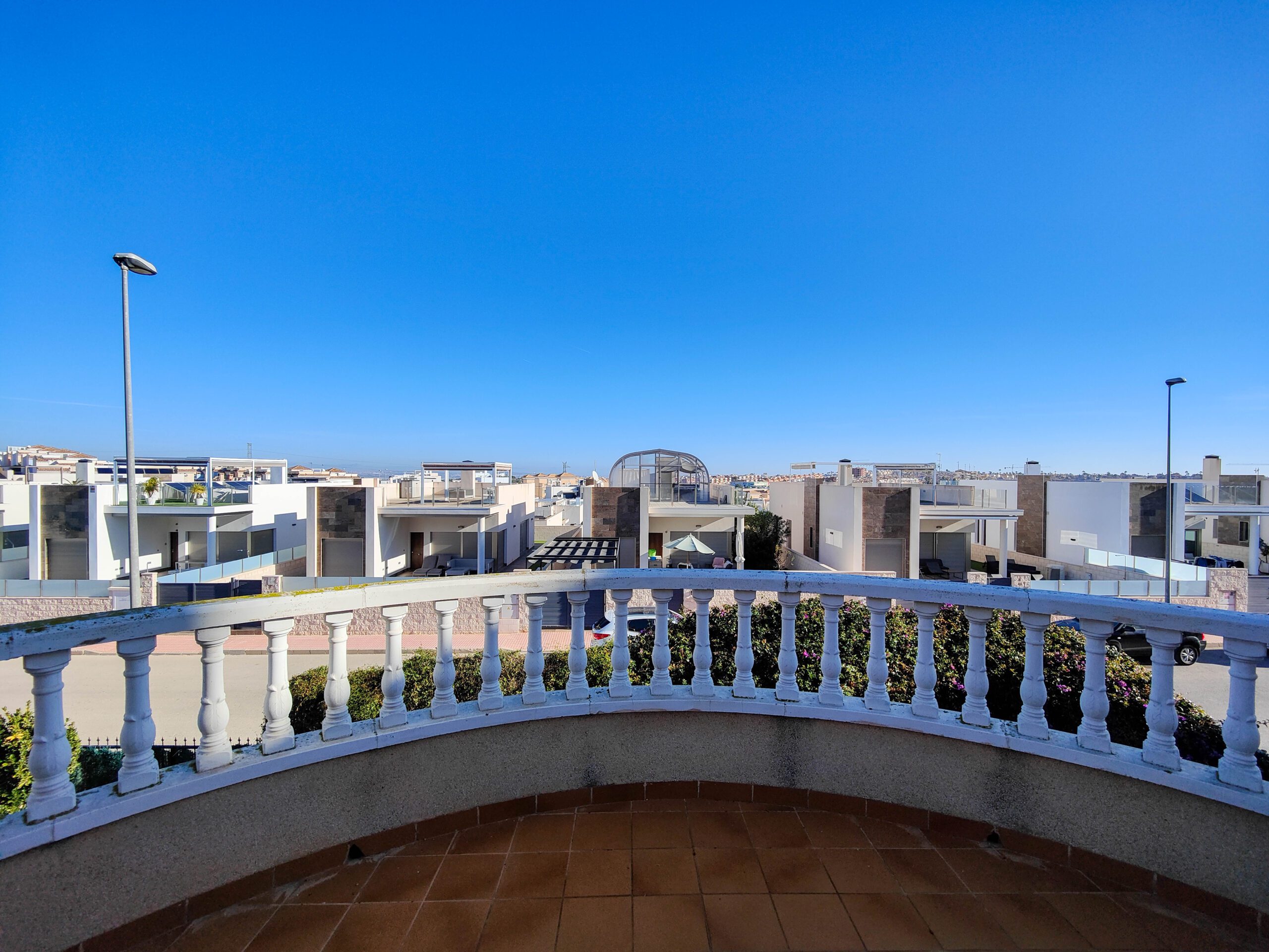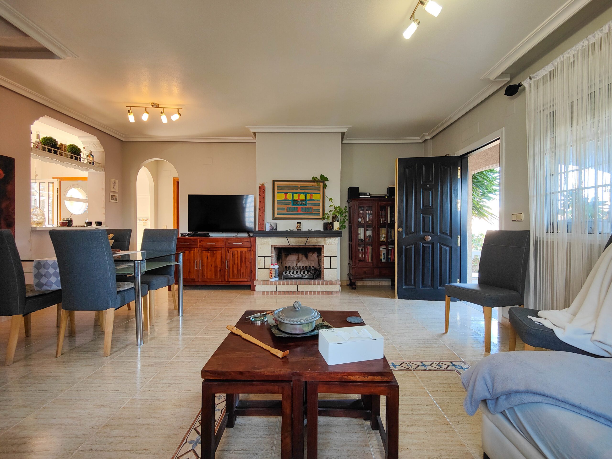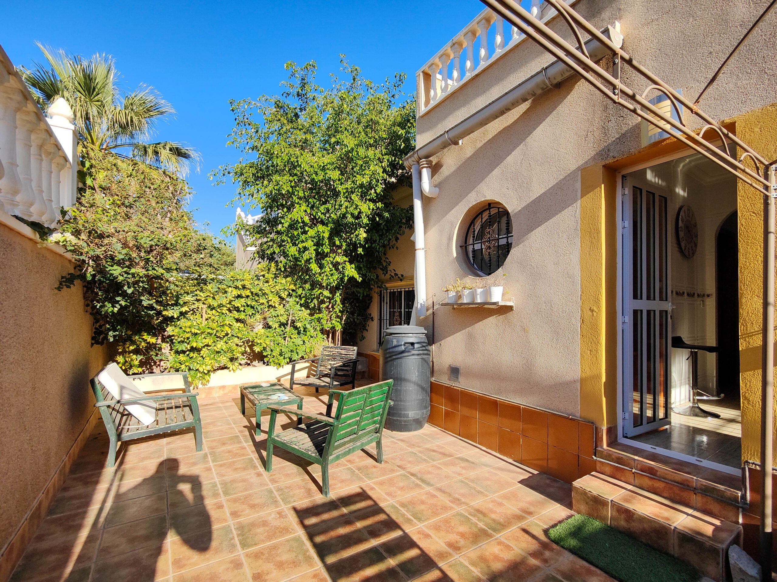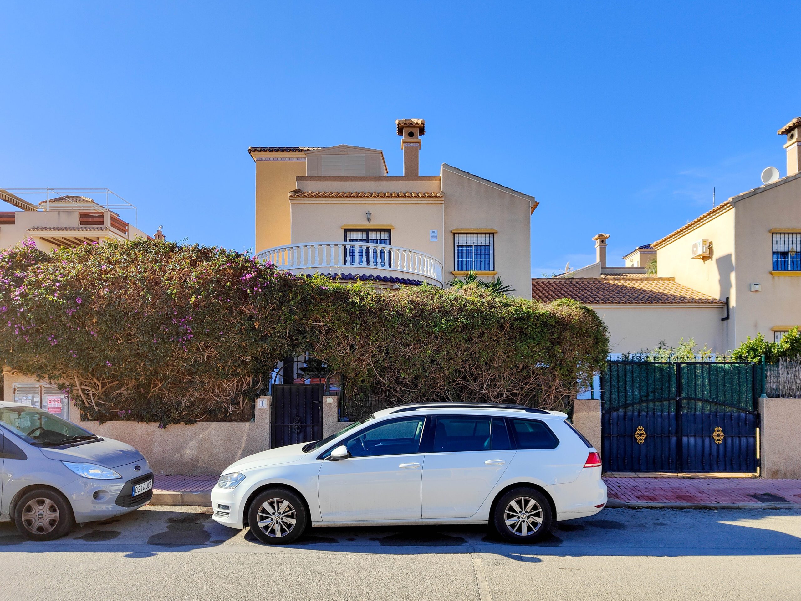 Detached mediterranean corner villa with a closed garage for sale in Villamartin - Orihuela Costa. This villa bellongs to a very small community without community fees. Just a short drive away from the Aldi supermarket, several shopping/comercial centers and the beaches of Orihuela Costa and Torrevieja.This well kept detached villa offers 3 bedrooms and 2 bathrooms distributed as follows:On the ground floor there is 1 bedroom with fitted wardrobes, 1 bathroom with walkin shower, a semi independent kitchen, a storage/laundry area and a spacious living area with a fireplace.On the first floor we find 2 bedrooms, both with fitted wardrobes and one of them with a private balcony, 1 bathroom with a bathtub and a south facing terrace. From this terrace we can access the roofterrace where there are 2 storage rooms.Outside, to the front of the property, there is off road parking, a closed garage, a private swimming pool, a covered terrace and several sitting areas. At the back of the property, which is south facing, there is a sunny tiled garden with direct access to the kitchen.This amazing villa is sold partially furnished. Do not miss the chance to buy this beautiful detached mediterranean villa with a closed garage for sale in Villamartin - Orihuela Costa!