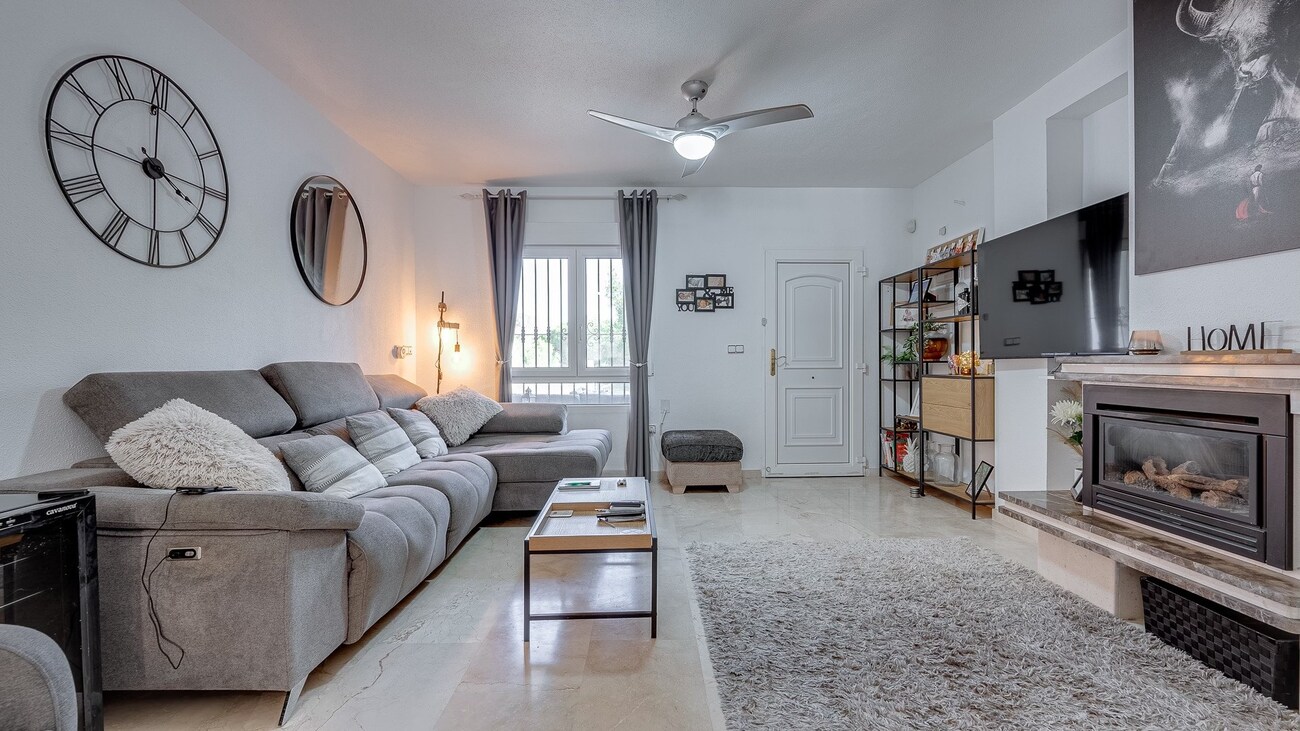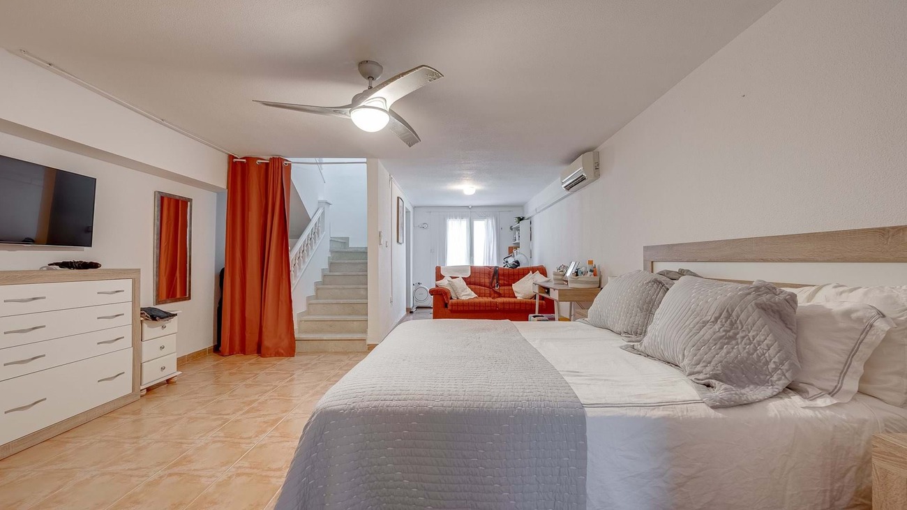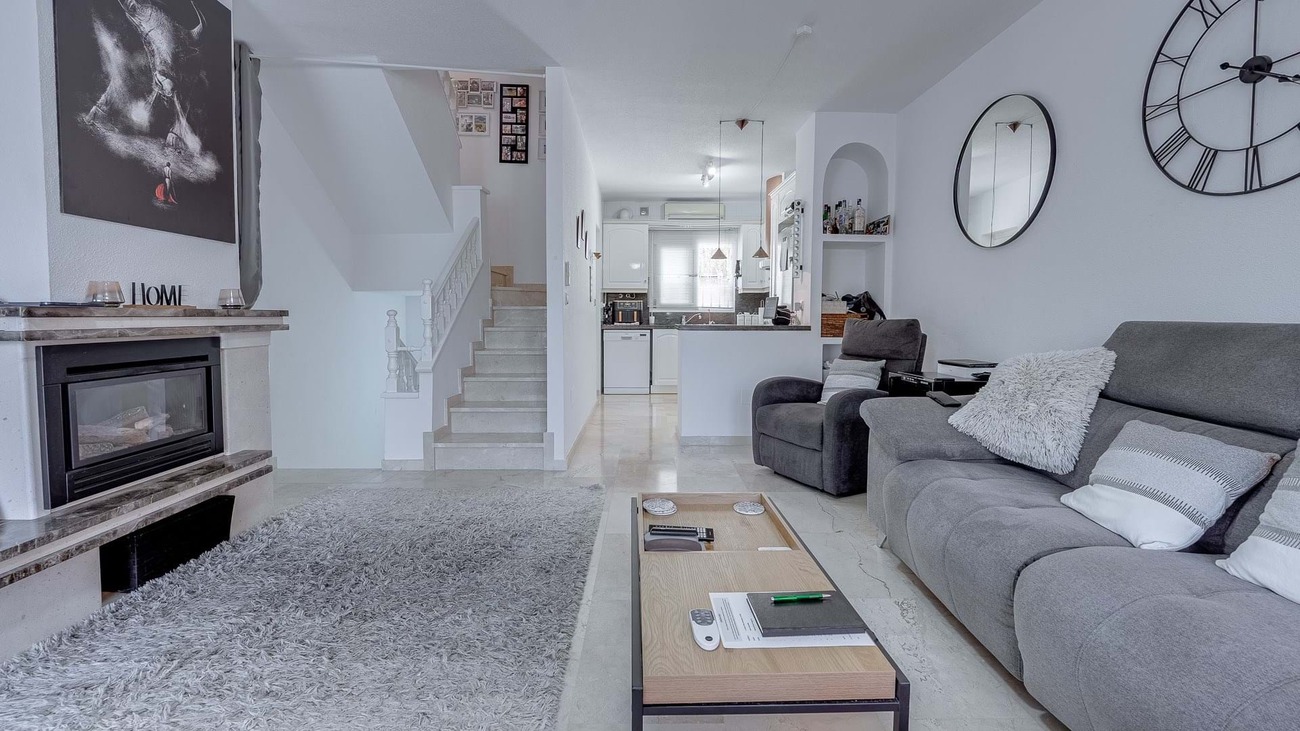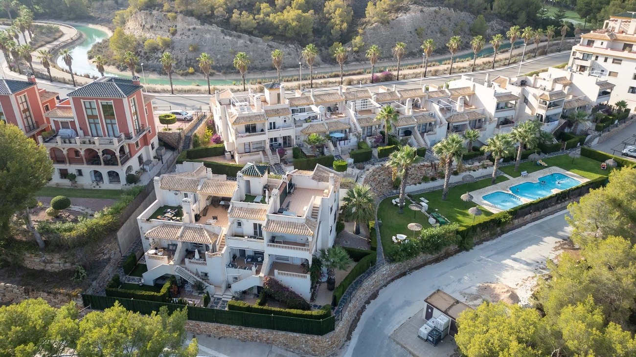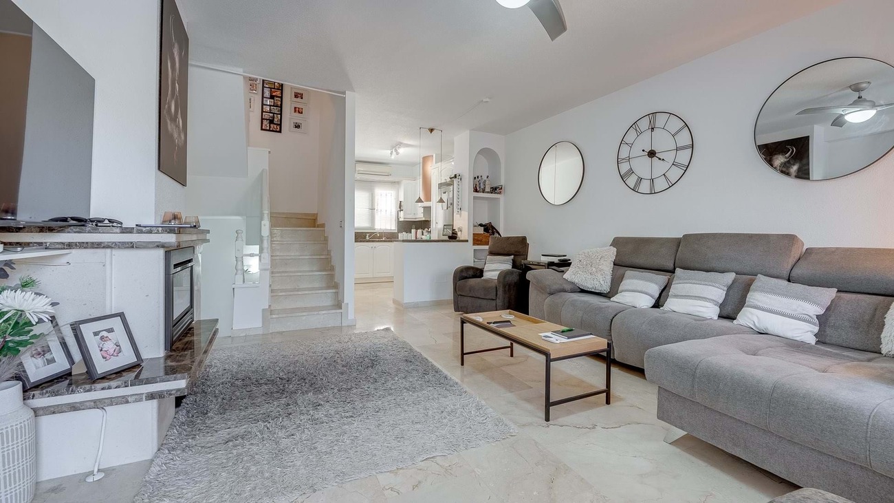 This beautifully designed property is spread over three floors, offering versatile living spaces and breathtaking views. Ground Floor: Ideal as a self-contained bedsit or guest suite Spacious open-plan area with bed and sofa Ample storage space Kitchenette for added convenience Bathroom Direct access to a private courtyard Air conditioning Stairway leading to the main living area First Floor: Large terrace with stunning golf course views Bright and airy lounge with dining area and open fireplace Fully equipped kitchen WC/cloakroom Second Floor: Two double bedrooms, one with a private balcony Family bathroom Third Floor: Rooftop solarium with panoramic golf course views Additional Features: Allocated parking space Partially furnished Air conditioning throughout Security alarm system East-facing for morning sun Access to a communal pool and landscaped gardens Located in a secure gated community Walking distance to the popular C.C. La Fuente, offering a variety of bars and restaurants This exceptional home is perfect for those seeking a combination of comfort, style, and convenience in a sought-after location.