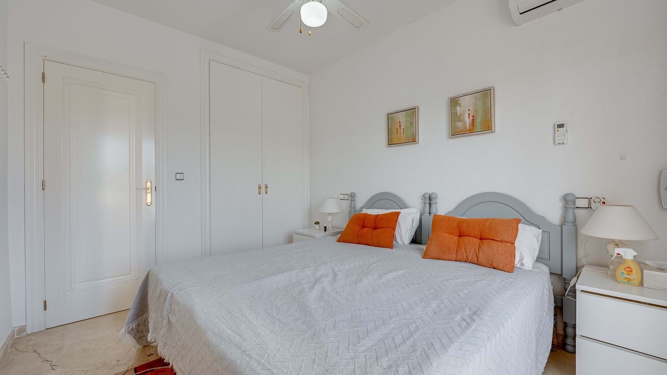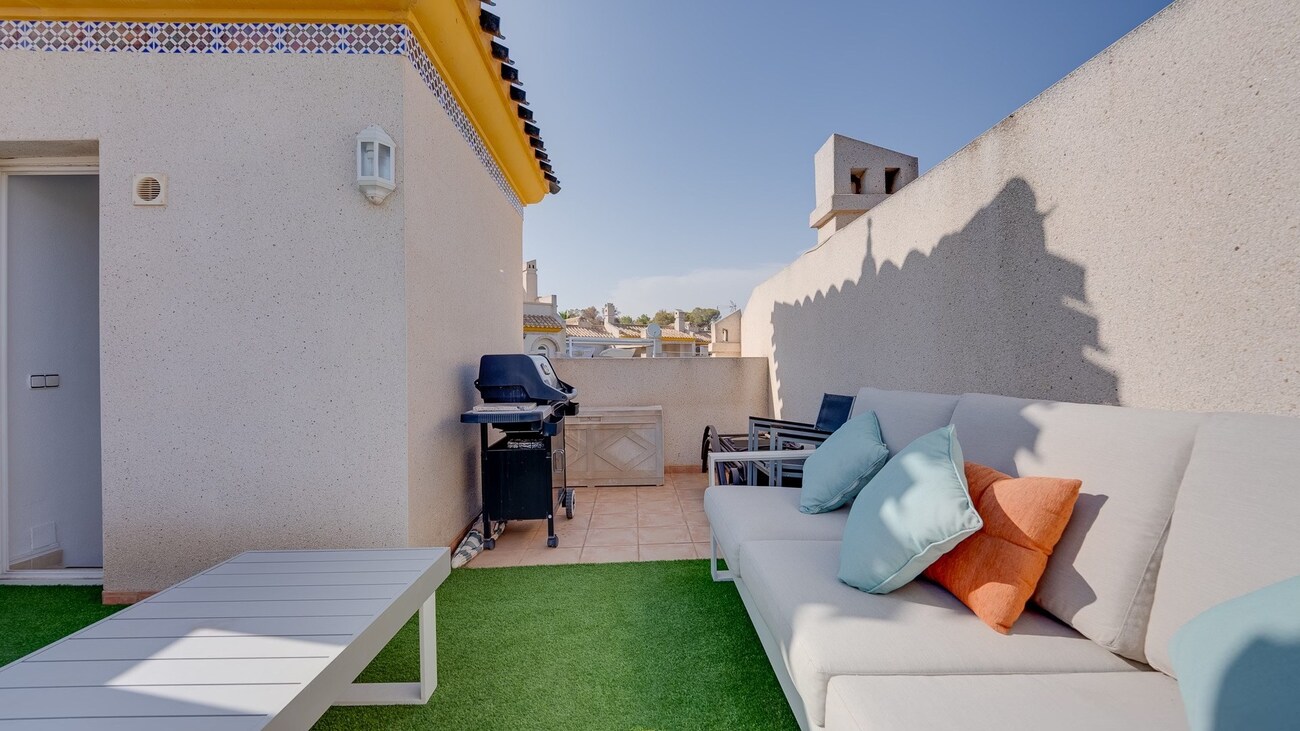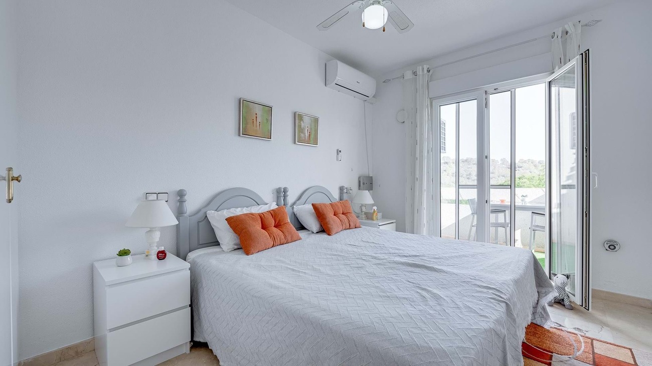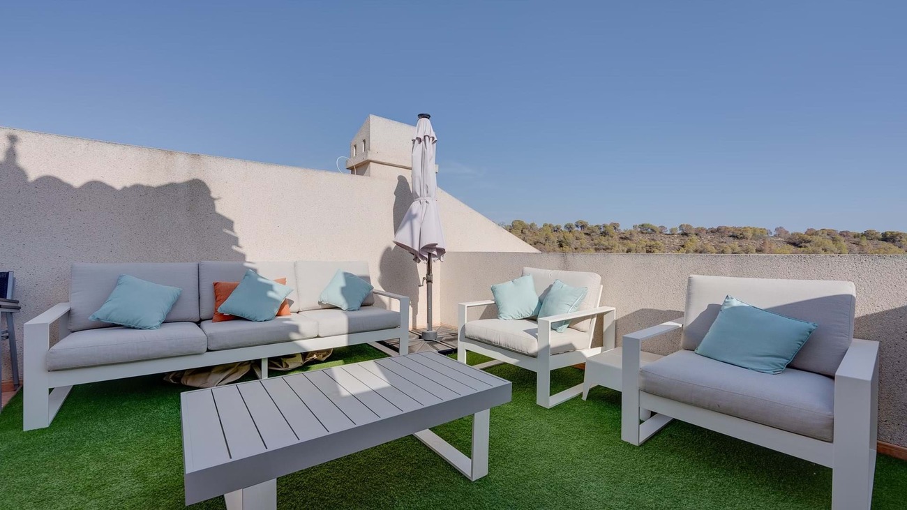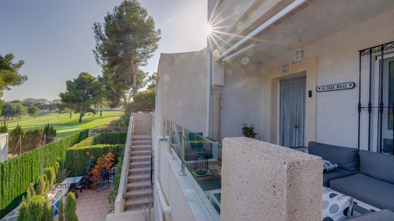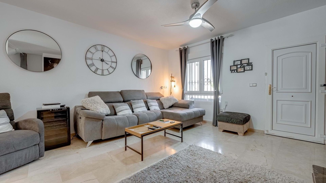 This beautifully designed property is spread over three floors, offering versatile living spaces and breathtaking views. Ground Floor: Ideal as a self-contained bedsit or guest suite Spacious open-plan area with bed and sofa Ample storage space Kitchenette for added convenience Bathroom Direct access to a private courtyard Air conditioning Stairway leading to the main living area First Floor: Large terrace with stunning golf course views Bright and airy lounge with dining area and open fireplace Fully equipped kitchen WC/cloakroom Second Floor: Two double bedrooms, one with a private balcony Family bathroom Third Floor: Rooftop solarium with panoramic golf course views Additional Features: Allocated parking space Partially furnished Air conditioning throughout Security alarm system East-facing for morning sun Access to a communal pool and landscaped gardens Located in a secure gated community Walking distance to the popular C.C. La Fuente, offering a variety of bars and restaurants This exceptional home is perfect for those seeking a combination of comfort, style, and convenience in a sought-after location.