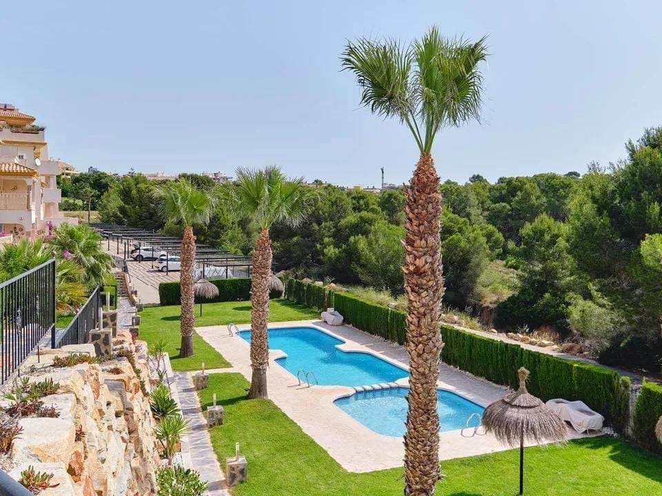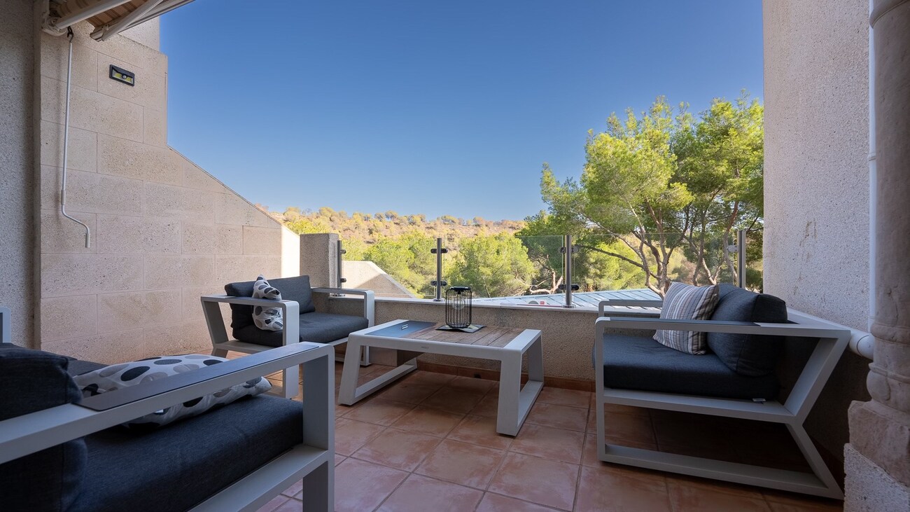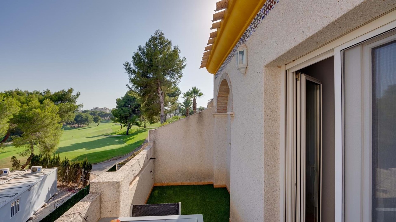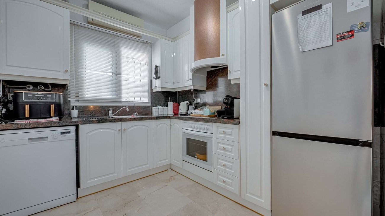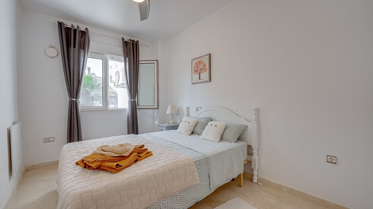 This beautifully designed property is spread over three floors, offering versatile living spaces and breathtaking views. Ground Floor: Ideal as a self-contained bedsit or guest suite Spacious open-plan area with bed and sofa Ample storage space Kitchenette for added convenience Bathroom Direct access to a private courtyard Air conditioning Stairway leading to the main living area First Floor: Large terrace with stunning golf course views Bright and airy lounge with dining area and open fireplace Fully equipped kitchen WC/cloakroom Second Floor: Two double bedrooms, one with a private balcony Family bathroom Third Floor: Rooftop solarium with panoramic golf course views Additional Features: Allocated parking space Partially furnished Air conditioning throughout Security alarm system East-facing for morning sun Access to a communal pool and landscaped gardens Located in a secure gated community Walking distance to the popular C.C. La Fuente, offering a variety of bars and restaurants This exceptional home is perfect for those seeking a combination of comfort, style, and convenience in a sought-after location.