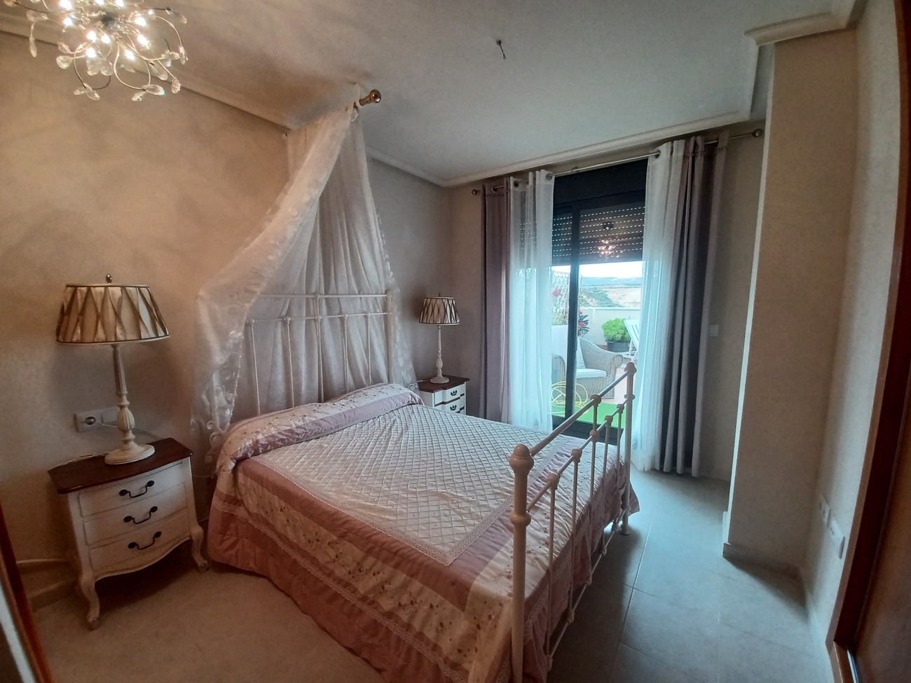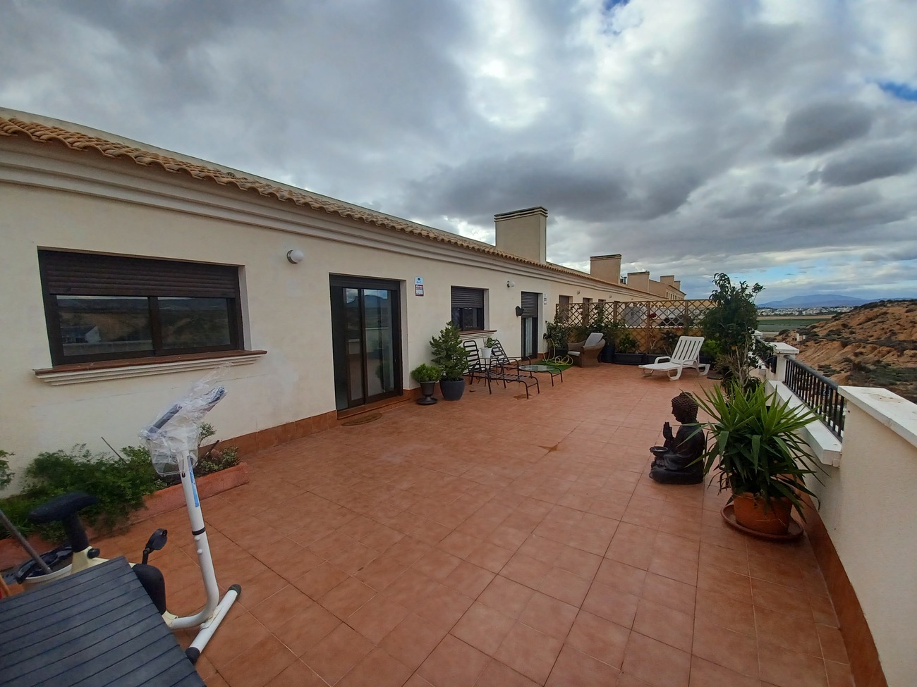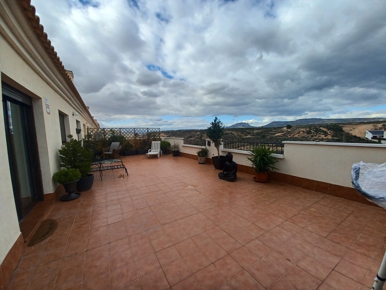 This spacious penthouse apartment offers plenty of outside space and modern interior.  The penthouse enters into a living/dining room with wardrobe storage at the front door, window, patio doors to a spacous outdoor terrace of 60m2, with views over the countryside and plenty of space to enjoy the sunshine and outdoor dining.  The kitchen is next to the living room, fully equipt with fitted kitchen cupboards, oven, hob, extractor, fridge freezer and washing machine.  there is a hallway from the living room leading to 2 double bedrooms, the first on the left hand side is a standard double with fitted wardrobes, window and blind.  The master bedroom is a double with double bed and bedside cabinet included, 2 double wardrobes and ensuite bathroom with double sink, walk in shower and wc.  The main bathroom has a shower, wc and vanity unit. The penthouse is situated on the top floor of La Vereda building with communal swimming pool and lift. Situated in the popular village of Sucina with supermarkets, bars, restaurants and all amenities to hand, it is a very convenient place to stay with everything within a short walk.  Just 20 minutes to the coast and 20 minutes to the airport.