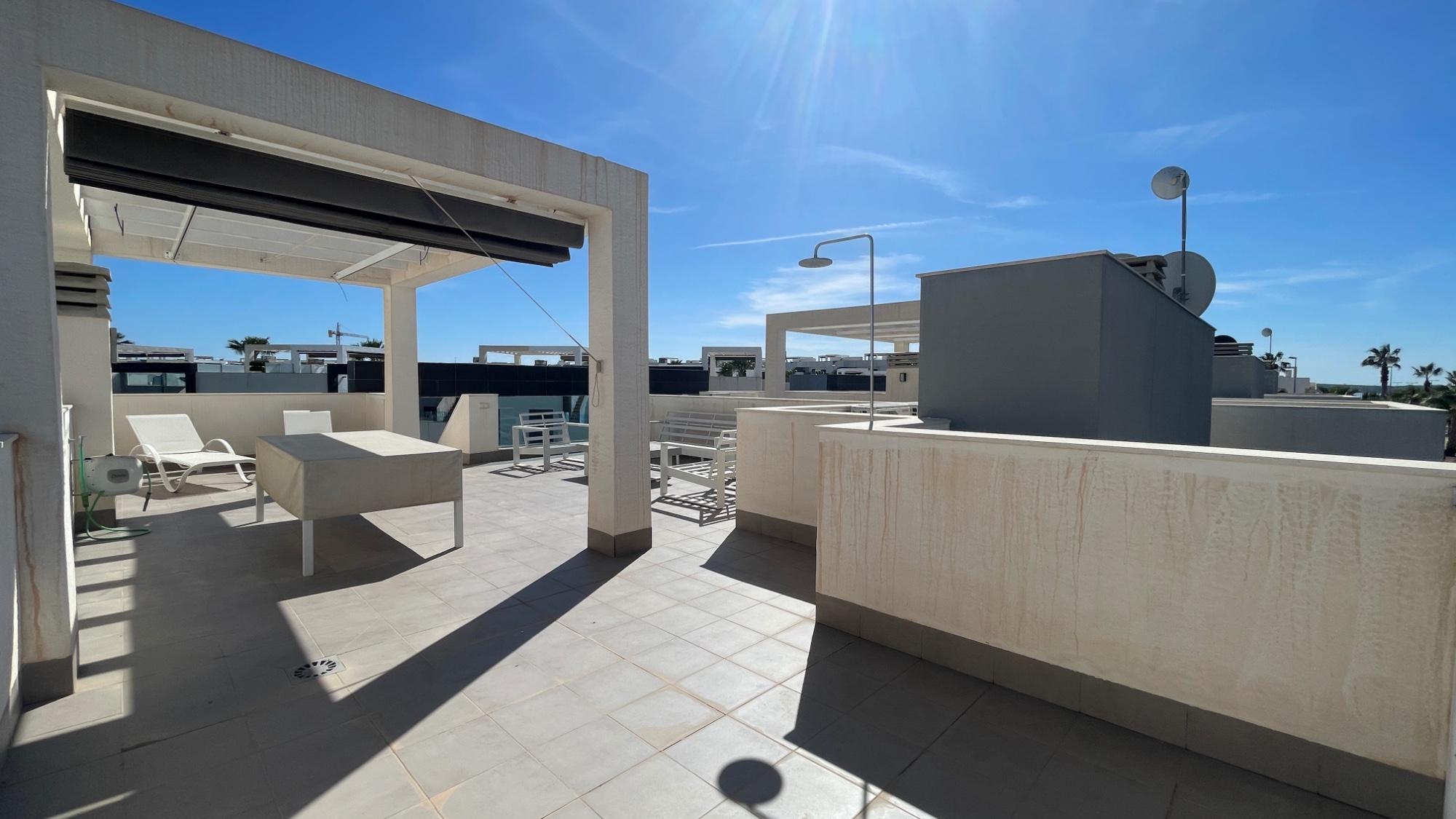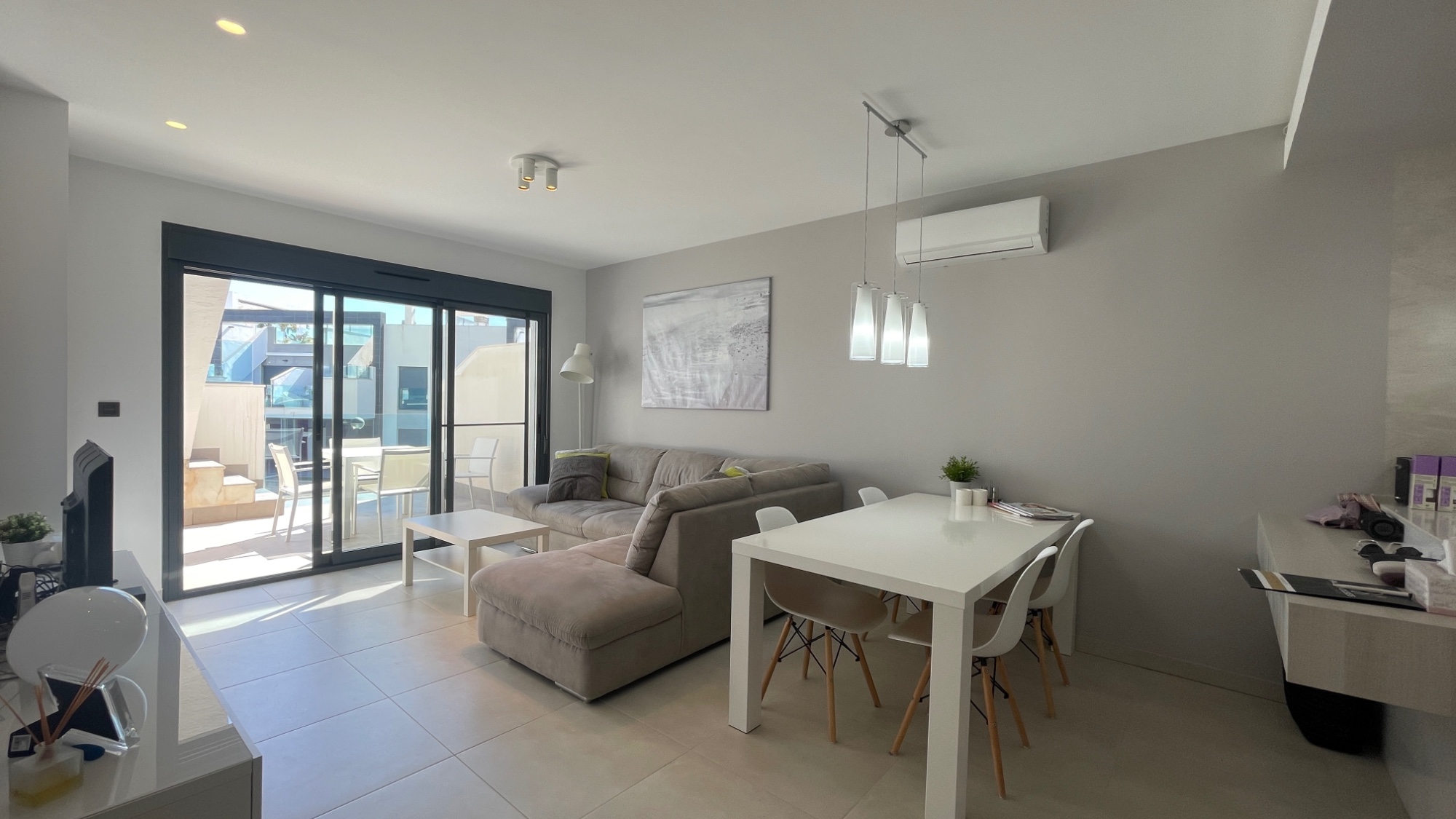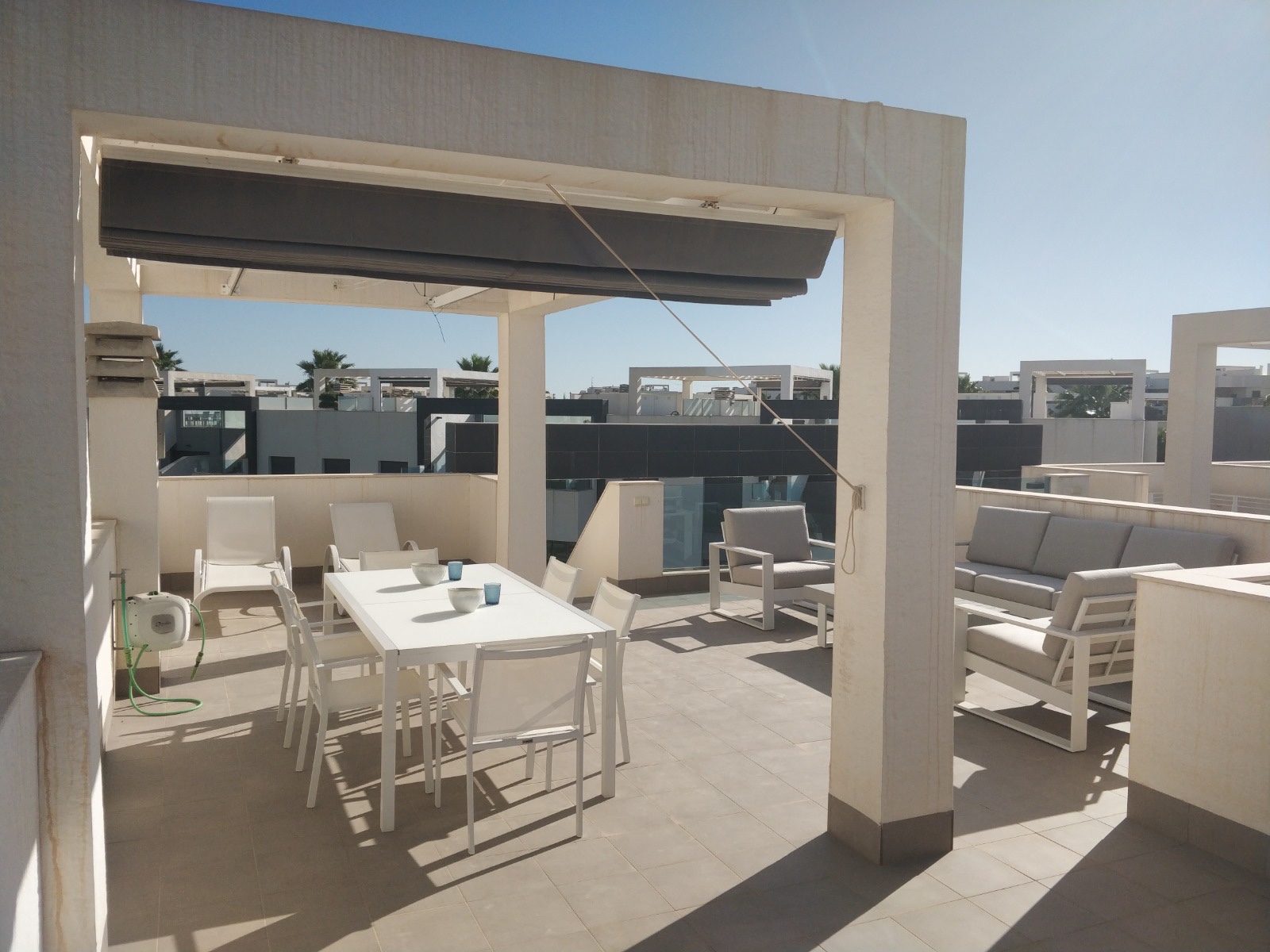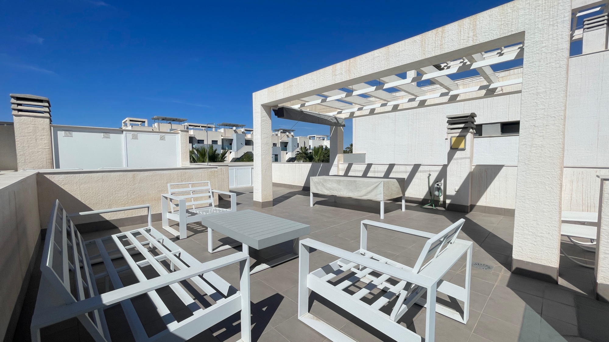 This beautiful Oasis Beach penthouse in El Raso, located 10 minutes from the highly sought-after Guardamar del Segura, is offered for sale in excellent condition. The current and first owners of this beautiful penthouse have never rented the house. The apartment is located in a modern residential complex with a beautiful swimming pool, playground, petanque court, fitness, jacuzzi and sauna. The modern furnishings, lots of light and a view of the communal swimming pool are just a few of the assets. The penthouse has 2 bedrooms, fitted wardrobes, 2 modern bathrooms and a beautiful open kitchen with all appliances. From the living room you have access to a spacious eastern terrace where you can enjoy a cup of coffee or a glass of wine. Via the terrace you reach the solarium where you can enjoy the sun all day long. The beach of cozy Guardamar del Segura is a 10-minute drive away. The price of the apartment includes underground parking. Would you like more information or a visit? Contact us today! Suma: €256/year Community: €267/3 months