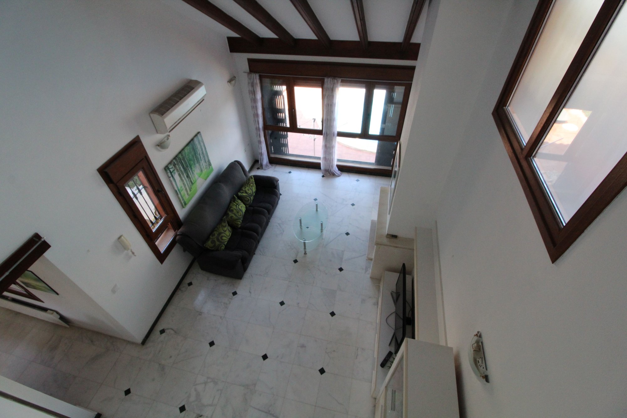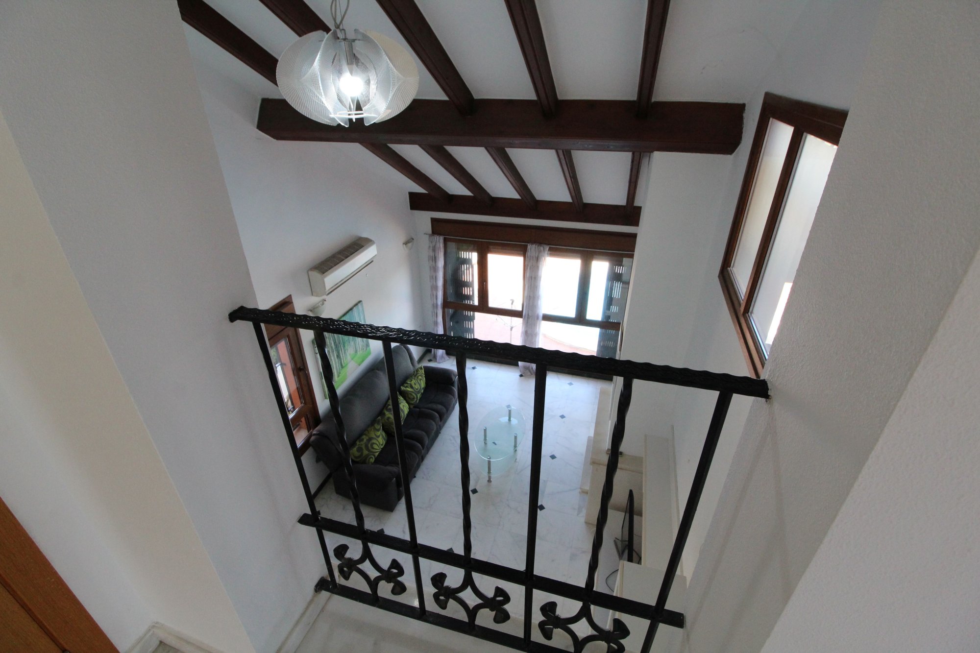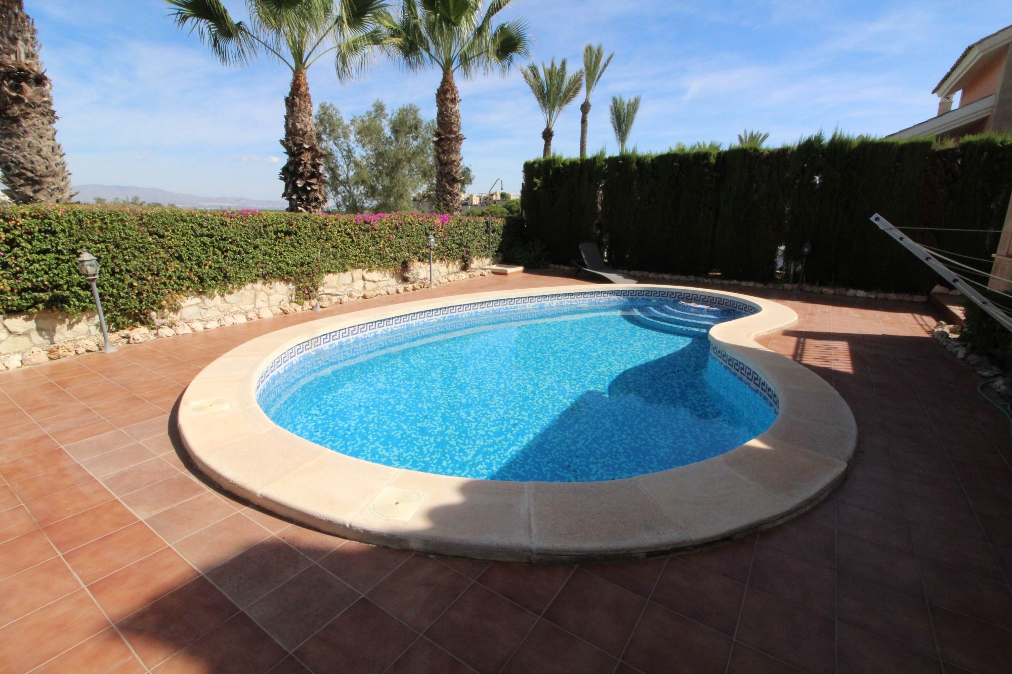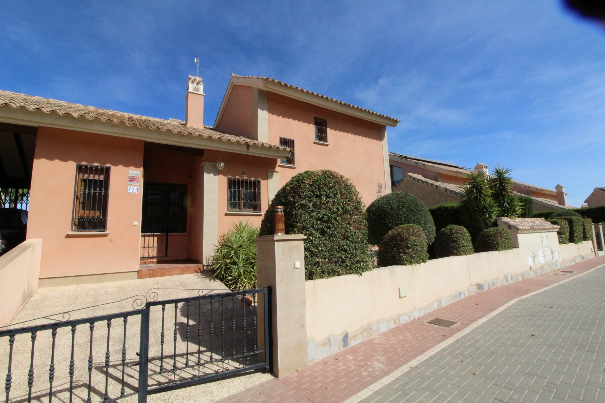 We are proud to present this new and exclusive listing on the popular La Finca golf and Spa resort in Algorfa. This link-detached 'Lucena Special' model villa is pretty unique on La Finca as only 4 were built by the developer in 2005.and includes 2 living rooms. The property consists of entrance into the first living room that can be used as a games room or separate dining room flowing into the second main lounge area with feature marble fireplace giving a homely feel to the house, there is ample room for two sofas and dining table and chairs and enjoys views of the golf course and your private pool. There are two bedrooms both with air-conditioning and fitted wardrobes on this floor with a full bathroom and gallery style kitchen complete with all appliances.  Upstairs you will find a storage room, shower room, terrace with spectacular views of the golf course and the master bedroom with wooden flooring, fitted wardrobe and A/C. The feature of this model is also an open aspect to the ground floor interior with railing. This property sits on a generous size plot (not available on most new build developments these days) and has a front garden with trees, side entrance with gate, kidney shaped pool with roman steps, tiled garden and storage area and all while enjoying views of the course.