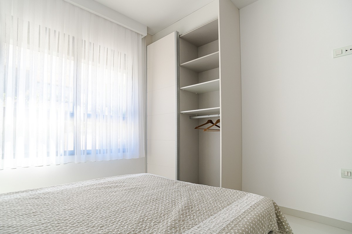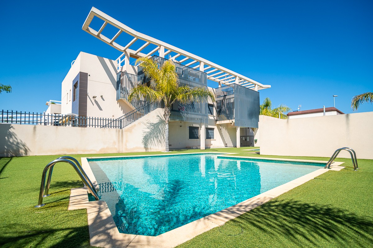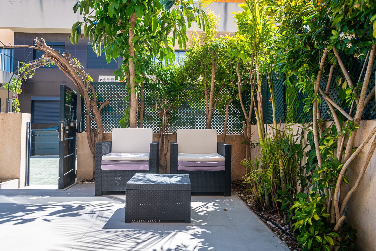 . South facing ground floor apartment in prime location in Torre de la Horadada – Costa Blanca South Welcome to this charming and move-in ready ground floor apartment, ideally located in the popular coastal town of Torre de la Horadada , on the sunny Costa Blanca South . Only 300 meters from the beach and surrounded by numerous cozy chiringuitos (beach bars) , restaurants and other amenities, this property offers the perfect mix of comfort, location and Mediterranean lifestyle. Layout & Comfort The apartment has a well thought-out and functional layout with: 2 spacious bedrooms , the master bedroom has an en-suite bathroom 2 fully equipped bathrooms with modern finishes An open, American kitchen with quality appliances and plenty of cupboard space A spacious, light-filled living room that opens onto a beautiful south-facing terrace – ideal for sunny breakfasts, long summer evenings or simply relaxing in peace and quiet Outdoor Space & Facilities The spacious private terrace facing south offers a beautifully landscaped communal garden with swimming pool , exclusively for residents Private parking on the plot , convenient and secure within the gated residence Location & Accessibility The location is really excellent: Only a 5 to 10 minute walk from the beach Surrounded by numerous food and beverage outlets, shops and supermarkets Good road connections provide easy access to neighbouring towns such as Orihuela Costa, Pilar de la Horadada and Torrevieja The AP-7 motorway is a short distance away and connects you easily to the airports of Murcia (Corvera) and Alicante In summary This ground floor apartment is the perfect choice for those looking for a sunny holiday home , a smart investment with rental potential , or a comfortable permanent residence on the Mediterranean. Don't miss this unique opportunity to live in one of the most beautiful locations on the Costa Blanca South!