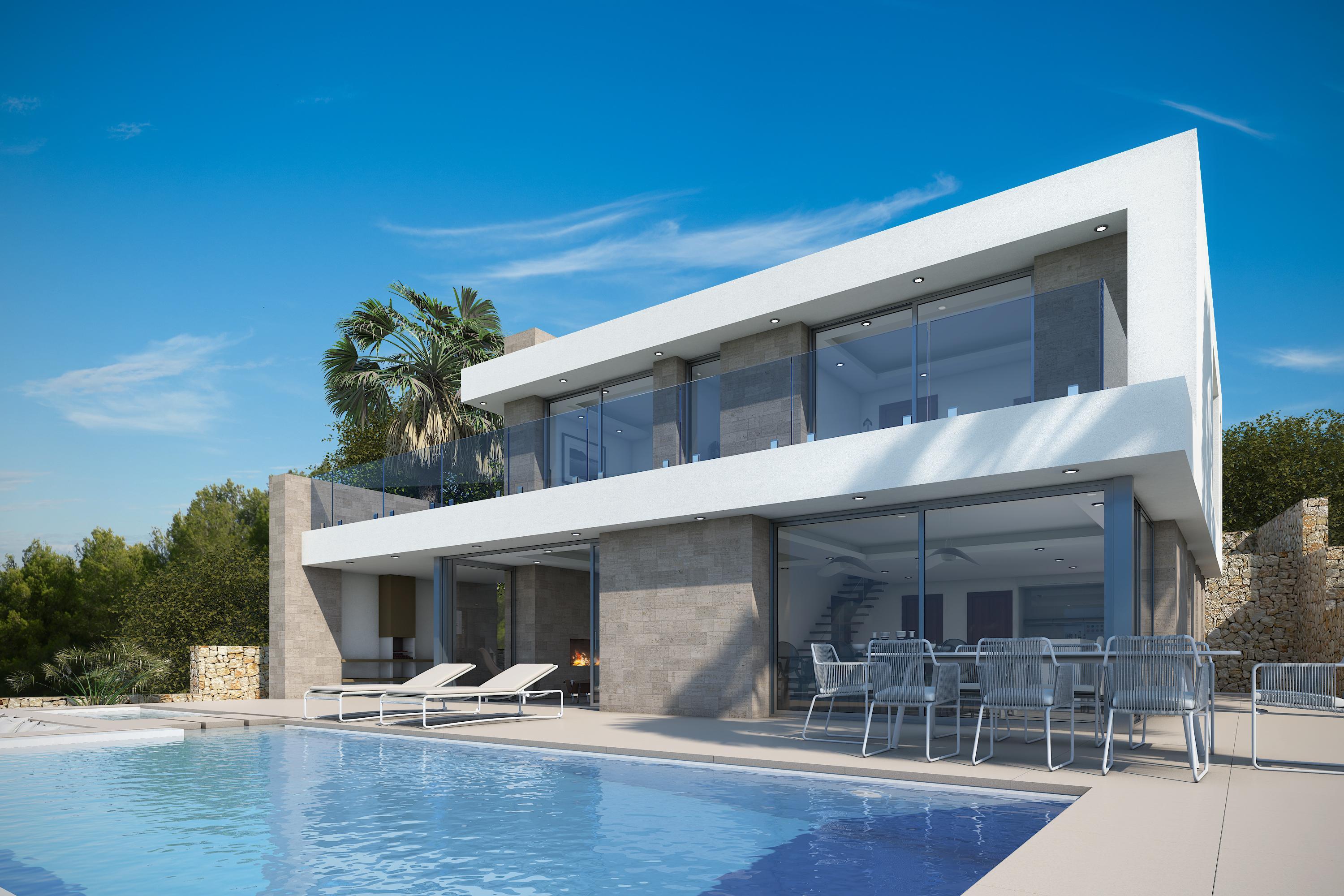 Modern and minimalist design for sale in Alcalali. This project is located on a South facing plot of 1,000 m2, with incredible views over the Jalon Valley. The Villa is on 2 floors with a total of 225 m2. The top floor is distributed in hall, three bedrooms, each with en suite bathroom and closet. The master bedroom in addition has a built-in dressing room. From two of these rooms there is access to a 30 m2 terrace finished with glass balustrade. Through an interior staircase there is access to the main floor, distributed in lounge with fireplace, dining room, open kitchen, pantry-storeroom, wc and a bedroom with wardrobe and en-suite bathroom. In total the house has 4 bedrooms, each with en-suite bathroom. This floor is accessed through a 60 m 2 terrace where there is also an infinitive  pool 8 x 4 with interior light and masonry work steps. Beside the pool, there is an area with work bench seats, to sit around a table as it appears on the project, ideal to relax. The price includes the excavation and elevation required to locate the house, to adapt it to the slope of the land. And a parking at street-level of concrete, the fence with stone wall of 60 cm at the boundary with the street and a door for car and pedestrian access. It also includes a staircase from the street level to the entrance of the house. The water and electricity connection are also included as is all the necessary documentation as licensing and project drawn up by an architect etc... The customer can modify plans, building materials and qualities. The plot has wonderful views over the Jalon Valley. Alcalalí is a pretty village in the heart of the Valley of Jalon, very typical, well connected and with all services such as health centre, pharmacy, school, restaurants etc.. It is only 20 minutes from beaches and coves in the coastal area of Calpe and Benissa. It is situated just 15 minutes from the AP7 motorway and more or less 1 hour from Alicante Airport.