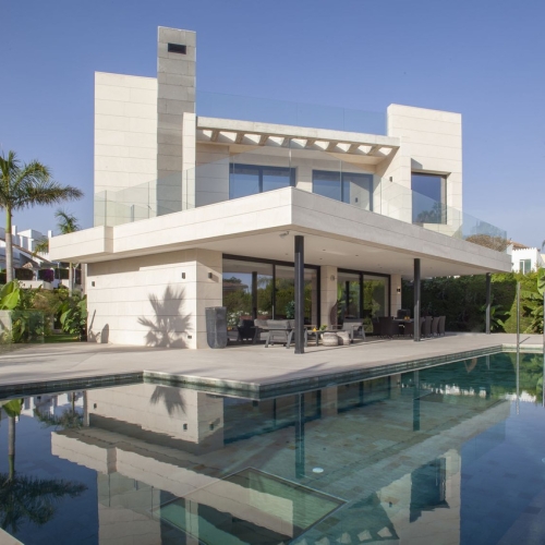5 luxury south facing villas at Puerto Banús beach, within a short walk to the promenade, the port, and all San Pedro facilities, inside a quiet and exclusive gated community.