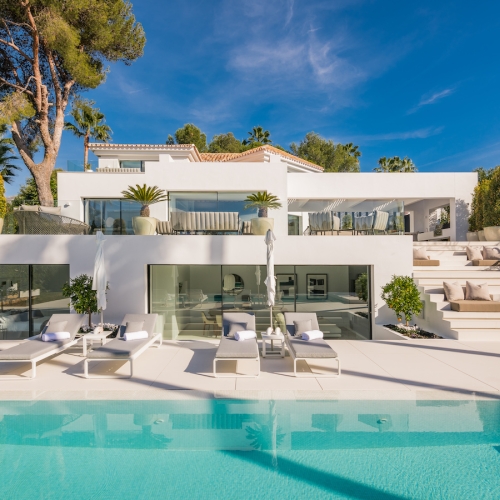 Luxury modern villa with a gorgeous grey and white colour scheme and hi-tech features throughout. The villa is bright and spacious with versatile accommodation including an en-suite bedroom completely separate to the main house. It comes fully furnished with premium furniture such as Eilersen and sliding door wardrobes in all bedrooms. The kitchen has a stunning contemporary style with a breakfast bar and Gaggenau appliances.