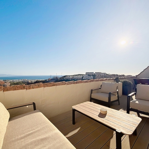 Magnificent penthouse with spectacular sea views, located in an urbanization area at a short distance from Sotogrande harbour and close the beach. In impecable condiction, the apartment offers charming living room with fireplace and access to the private terrace, completely equipped kitchen, separate dining area, one garage space and storeroom. It has been reformed recently.. Built to an excellent high standard.