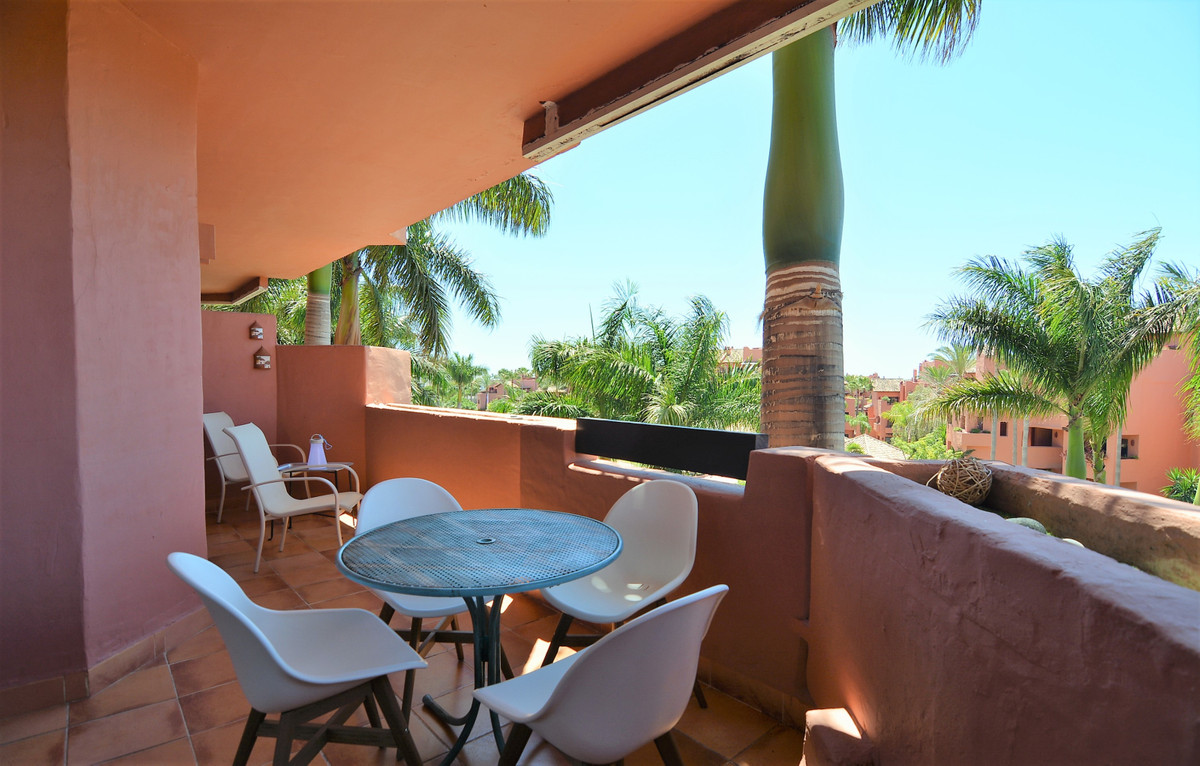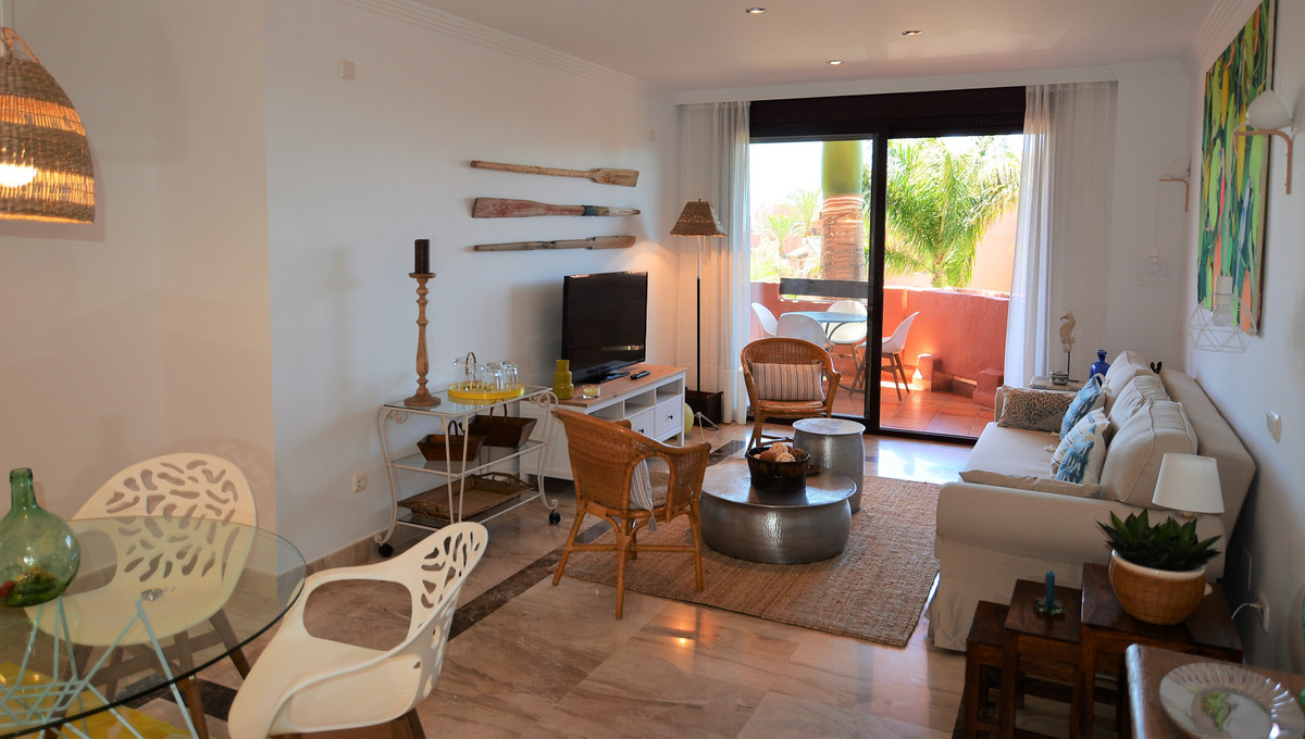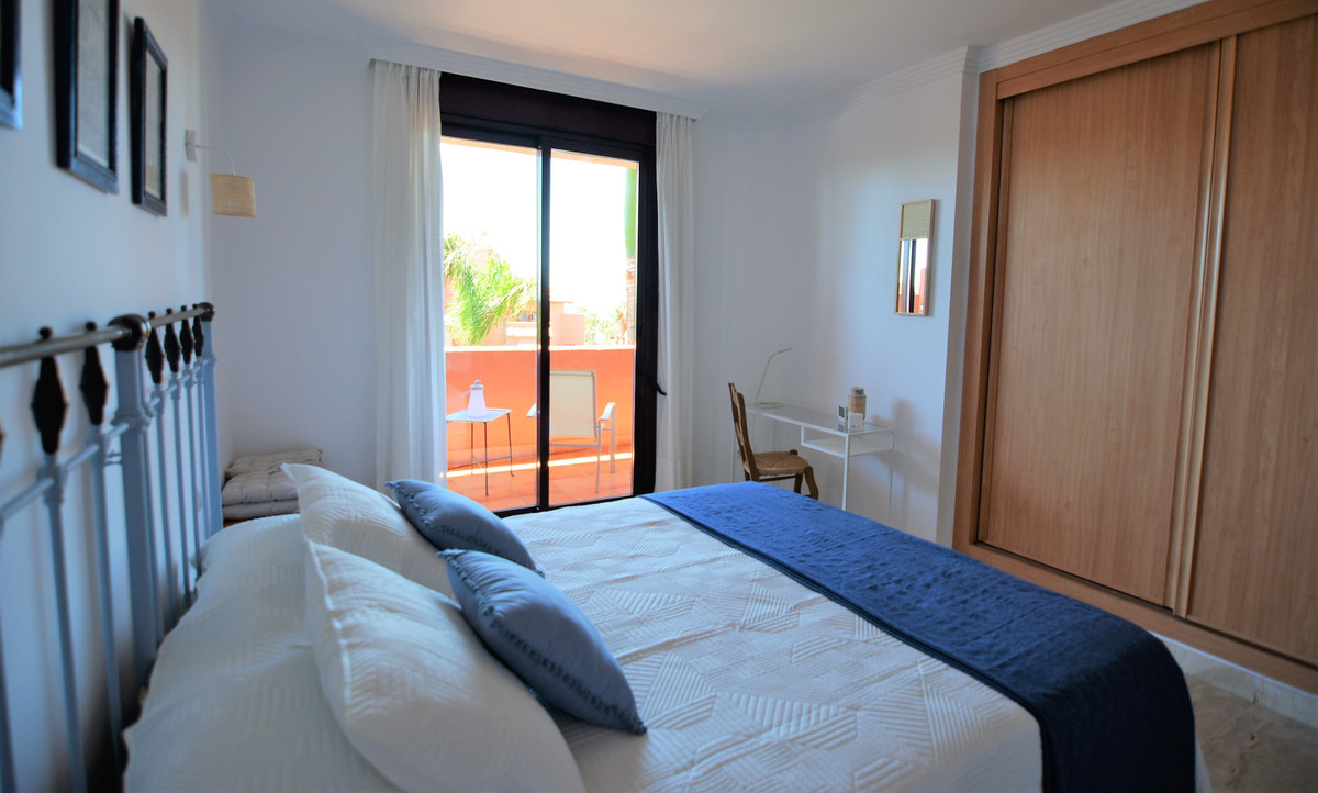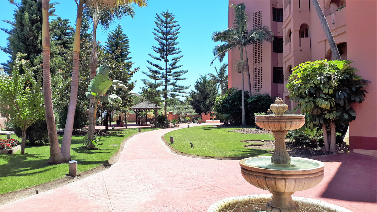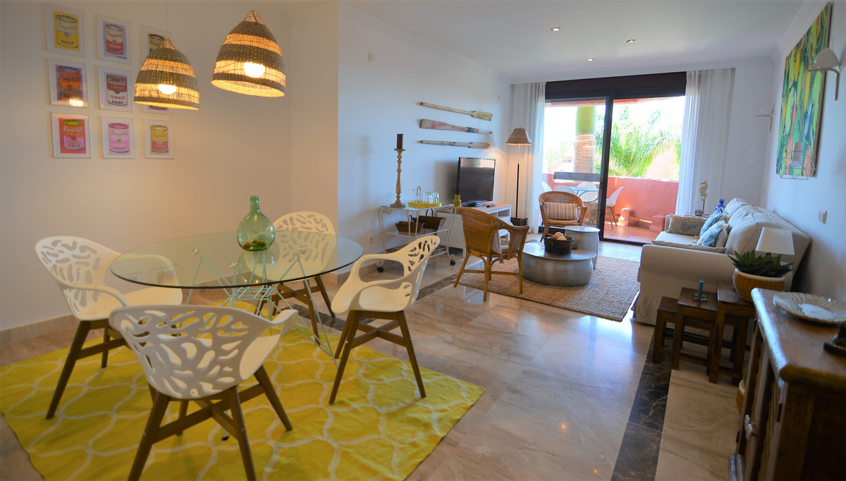 Beautiful luxury apartment in the beach urbanisation of Guadalmansa. This dwelling features top quality cream marble floors, a domotic system which includes alarm, AC, automatic control of water supply, fire detectors, video entrance phone and more. There are 2 bedrooms and 2 bathrooms one en-suite with big jacuzzi and power shower. The living room is big and features built in spotlights and automatic blinds. The kitchen is also spacious with a breakfast bar and space for a table and four chairs. All kitchen appliances are high quality from AEG. There is also an ample utility room with washer-dryer machine. The south facing terrace is 14m2 with sea views and facing the beautiful tropical garden that enjoys a big swimming pool and and artificial stream with waterfalls. The complex enjoys an indoor gym and the most beautiful spa including a heated pool, jacuzzi and sauna. The spa is decorated with wall to wall renaissance frescos. The beach is only 100 metres away and has is the coast´s only frontline beach park of 20 000 m2 with an artificial river, a historical moorish watch tower and the five star restaurant ´Tikitano´.