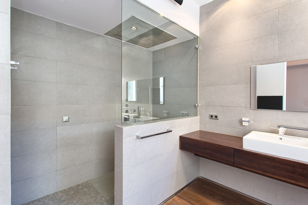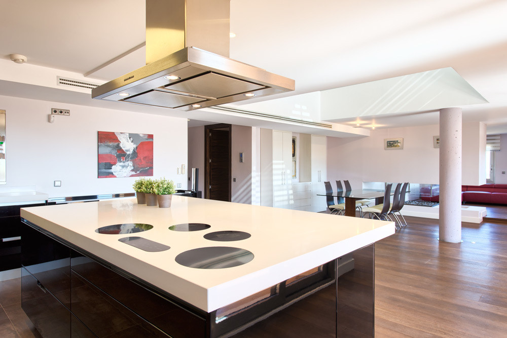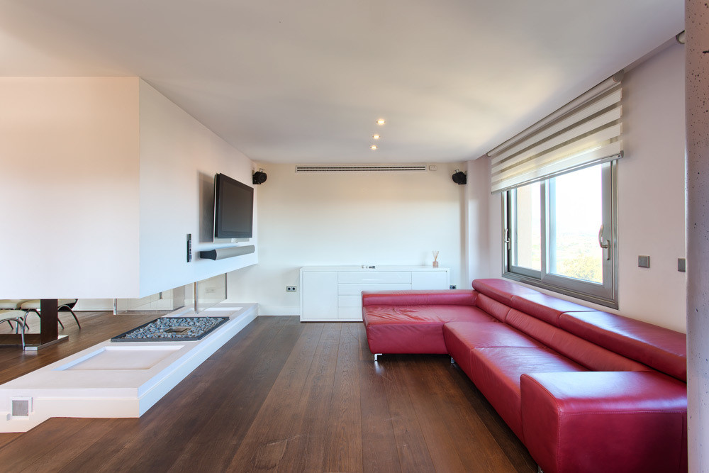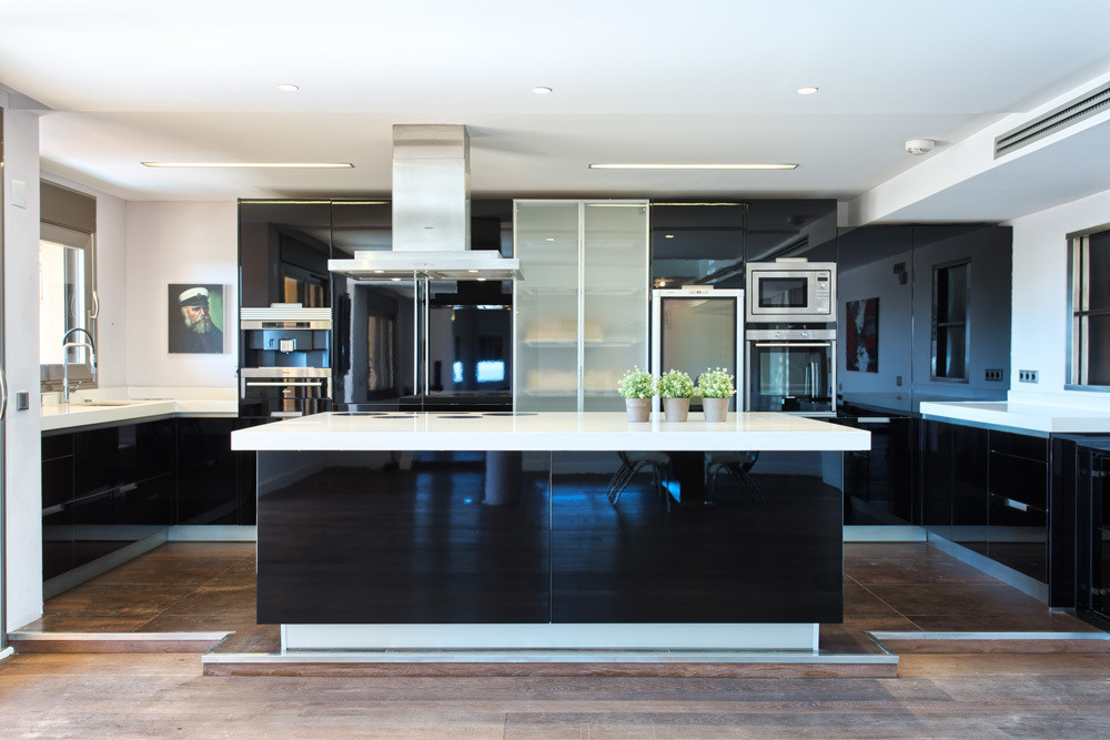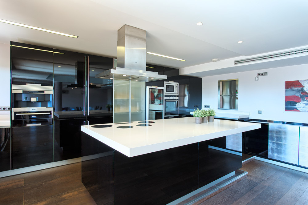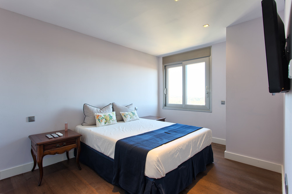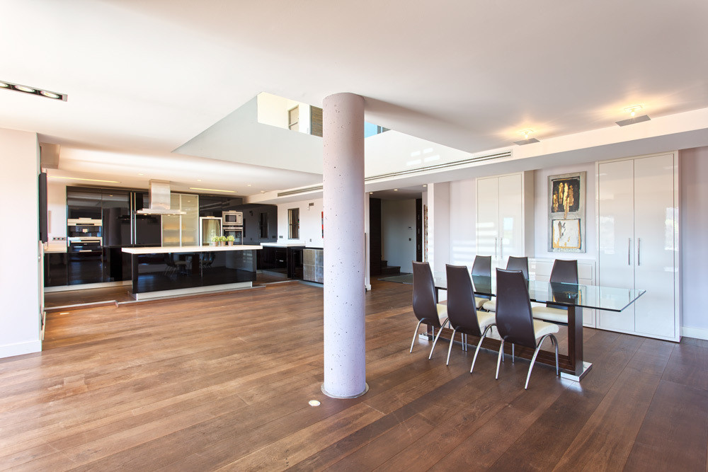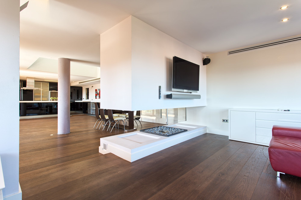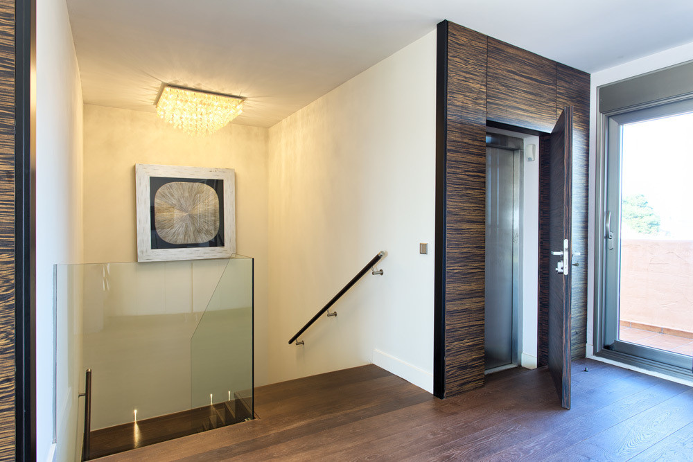Being a duplex penthouse the four bedrooms all en-suite are spread over 2 floors there is an elevator to both floors, a guest cloakroom on the lower level, the main living area has an open fireplace and is very spacious with natural from the large windows all open on to the partly covered terrace. The kitchen fully equipped with all Bosh, Miele and Siemens appliances.